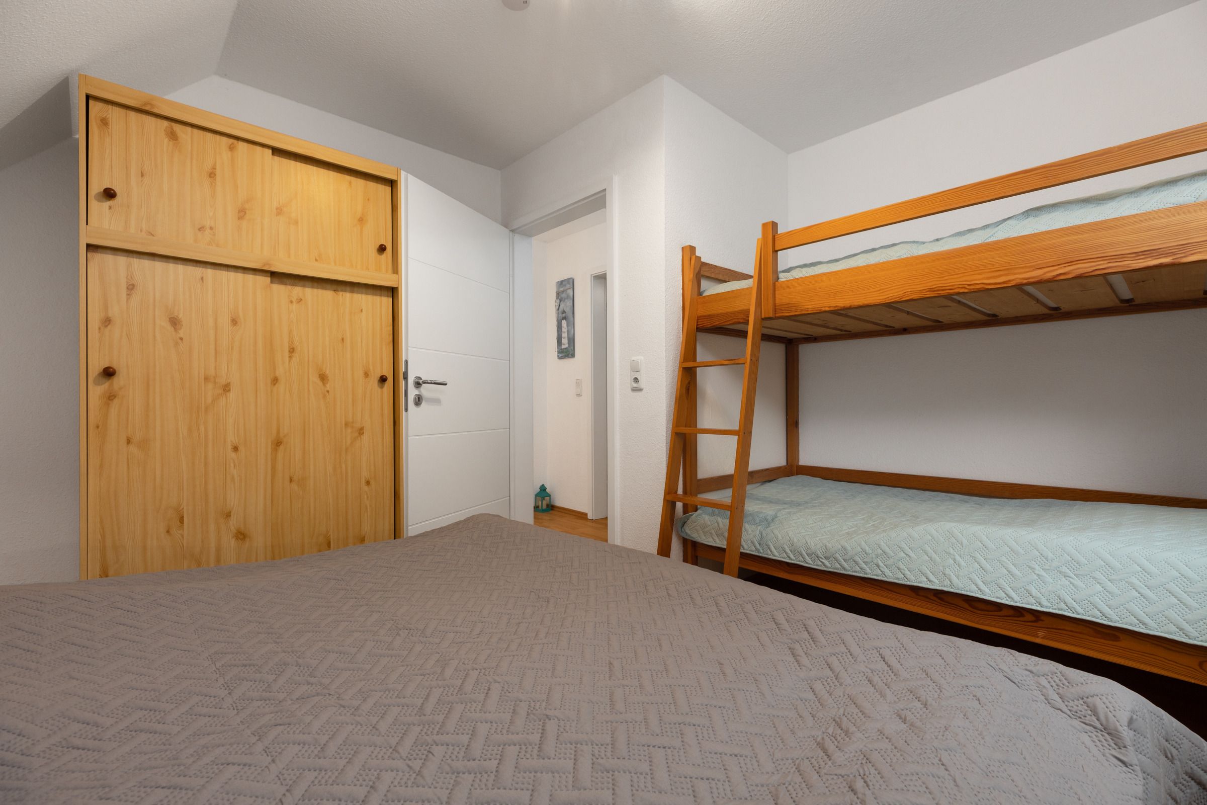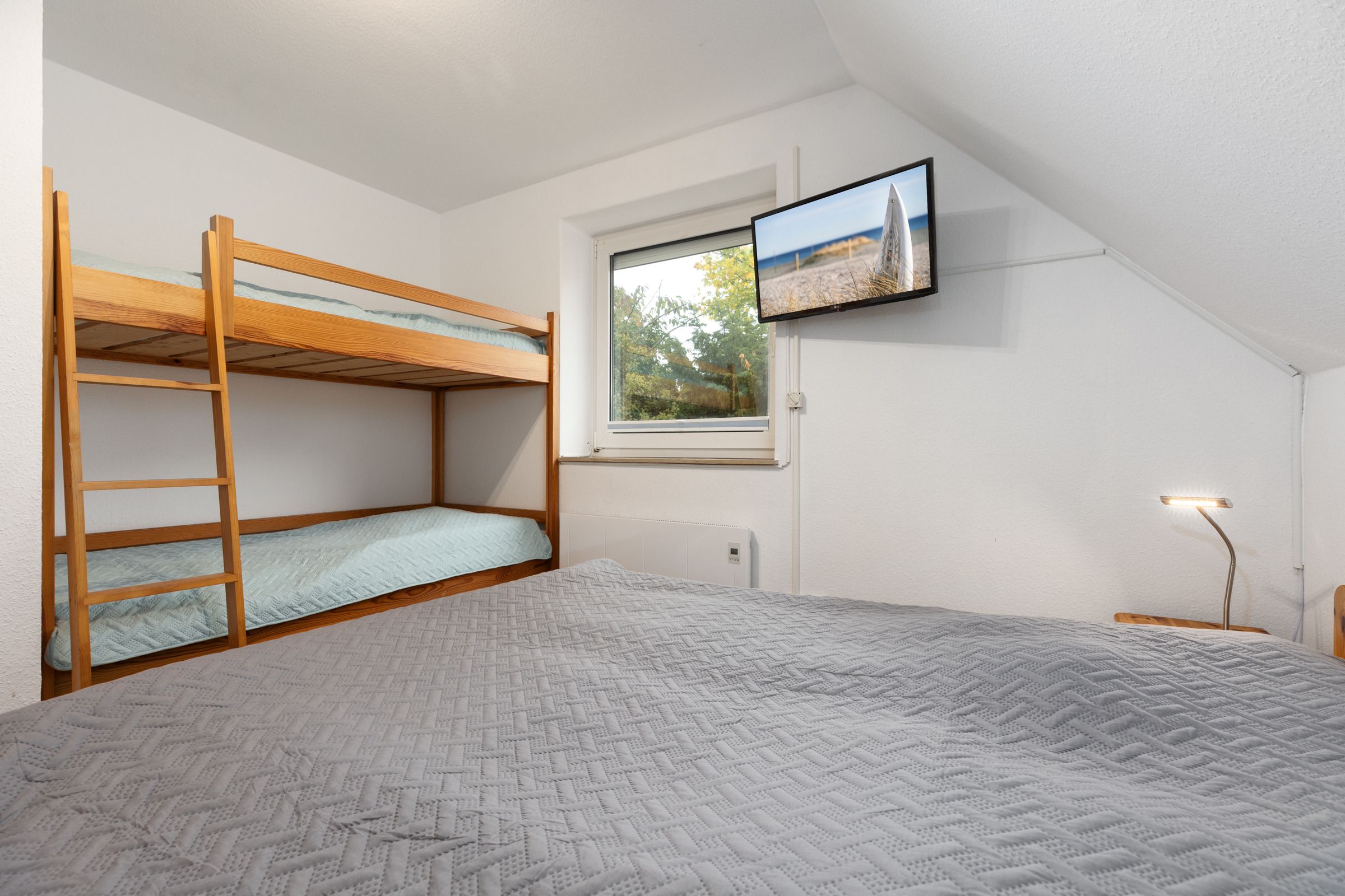 Schlafzimmer 2: Doppelbett, Etagenbett, TV, Verdunkelung (Außenjalousien)