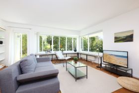 Ein geräumiger Flur empfängt Sie und führt in das großzügige und nordisch-modern eingerichtete Wohnzimmer. Die Sofaecke bietet bei Tag Entspannung nach ausgiebigen Strandspaziergängen und nachts Schlafplätze für zwei Personen. Die zum Wohnzimmer hin offene Küche und der Esstisch ermöglichen gemütliche Stunden des Beisammenseins. Der Blick schweift von der überdachten Terrasse über den kleinen, romantischen Garten bis hin zur Förde. Ein wunderbares Plätzchen, um den Abend vielleicht bei einem guten Tropfen ausklingen zu lassen. Das Schlafzimmer ist mit Schränken für Ihre Urlaubs-Garderobe und einem gemütlichen Doppelbett ausgestattet. Das komfortable Badezimmer verfügt über eine Dusche. Die Badewanne ist genau das richtige nach langen Winterspaziergängen entlang der Küste. Aufgrund der Hanglage verfügt das Bad nur über kleinere Fenster.