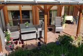 Das große gemütliche Wohnzimmer ist mit einer Schlafcouch für 2 Personen ausgestattet und der angrenzende Essbereich bietet Platz für 4 Erwachsene und zwei Kinder. Die angrenzende Terrasse ist mit einer festen Überdachung versehen, hier kann man auch mal bei leichten Regentagen verweilen. Grillen ist erlaubt, ein Grill muss aber selbst mitgebracht werden.