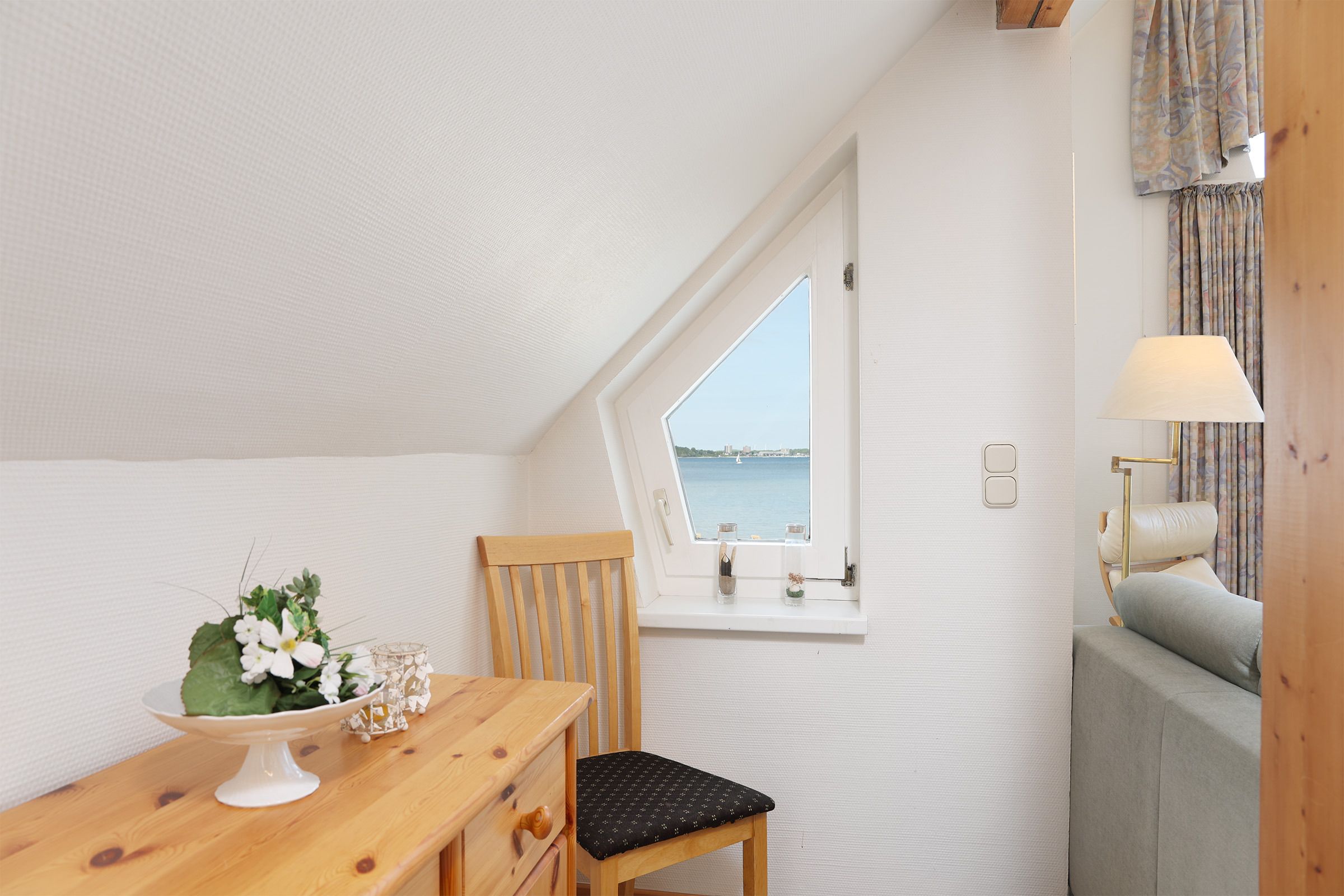 Die schöne 51 m² große Galeriewohnung besteht aus einem großzügigen Wohnbereich mit Schlafcouch, Essecke und Pantry-Küche, Badezimmer. Auf der offenen Galerie befindet sich das Schlafzimmer. Auch von dort haben Sie einen Blick auf die Kieler Förde. Vom Balkon genießen Sie ebenfalls einen unvergleichbaren Förde-Panoramablick. In den kühleren Monaten sorgt ein dänischer Kaminofen für eine zusätzliche Gemütlichkeit.