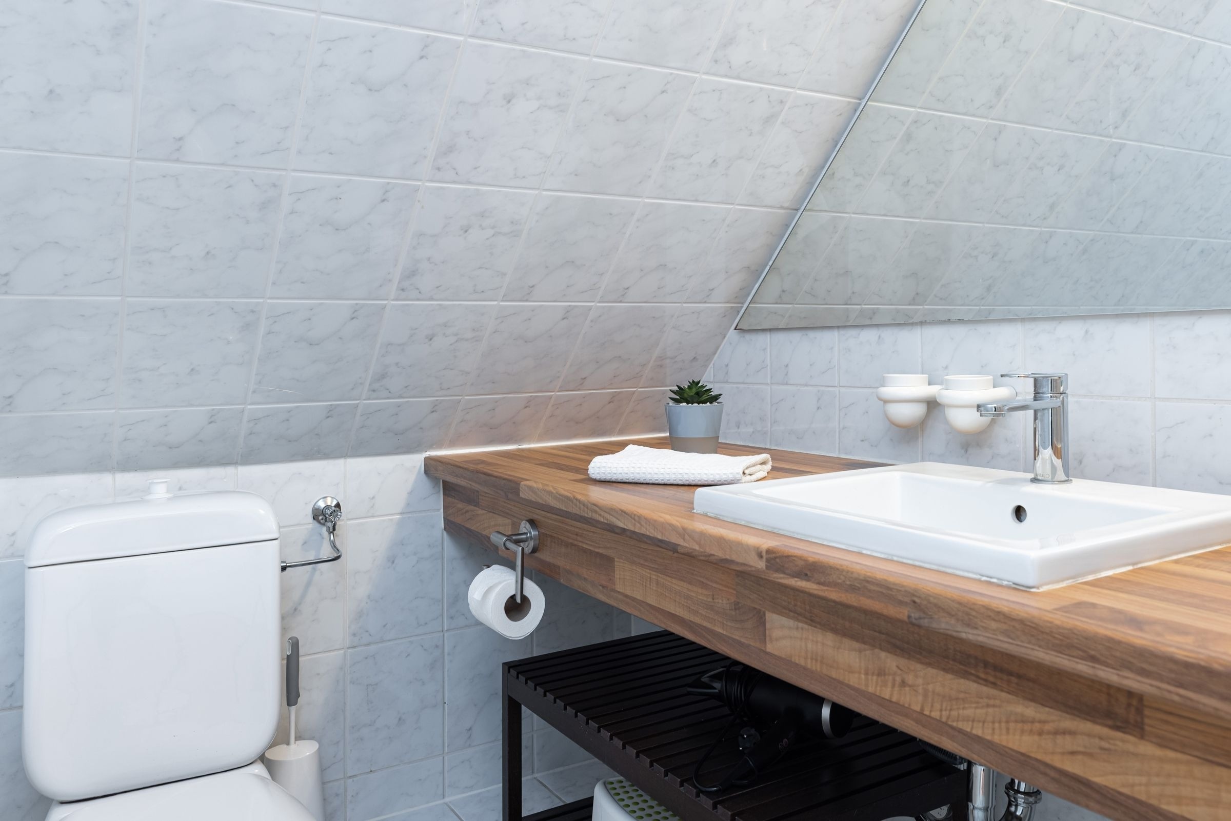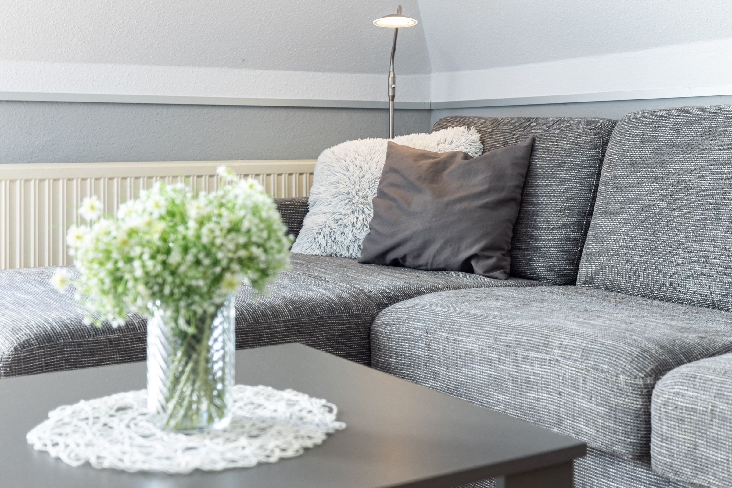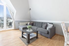 Es empfängt Sie ein gemütliches Wohnzimmer mit einer Küchenzeile. Die Wohnung ist mit einer komfortablen Schlafcouch ausgestattet. Mit nur einem Handgriff verwandeln Sie die Couch in ein bequemes Bett. Außerdem erwartet Sie ein Flachbildfernseher, DVD Player, Stereoanlage, Bücher und Gesellschaftsspiele. Vom Wohnzimmer gelangen Sie auf einen kleinen Balkon, auf dem Sie in der Morgensonne Ihren ersten Kaffee genießen können. Eine Raumspartreppe führt in die behagliche, obere Etage mit Doppelbett und einem großen Dachfenster, von dem aus Sie einen schönen Blick auf die Innenförde haben. Bitte beachten Sie, dass diese Treppe für kleine Kinder und gehbehinderte Menschen nicht geeignet ist.