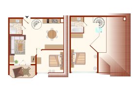 Ein frisch und nordisch ausgestatteter Wohnraum empfängt Sie mit seinem warmen Ambiente. Hier ist es gelungen die moderne Küchenzeile geschmackvoll zu integrieren. Der Wohnbereich mit Schlafsofa für zwei Personen ist mit weiteren einladenden Sitzgelegenheiten ausgestattet und befindet sich direkt vor der Fensterfront mit weitem Blick auf das Meer, den Strand und das bunte Treiben der Strandpromenade. Die moderne Küche verfügt über eine Geschirrspülmaschine, Backofen, Mikrowelle und einem Ceran-Kochfeld, damit es Ihnen auch im Urlaub an nichts fehlt. Ein großer Esstisch lädt zum gemeinsamen Essen, Spieleabenden und langen Nächten in guter Gesellschaft ein. Eines der beiden Schlafzimmer mit Doppelbett, einem weiteren Flat-TV sowie einem Kleiderschrank befindet sich auf gleicher Ebene. Das Fenster ist dem Meer zugewandt. Auf gleicher Ebene befindet sich das Duschbad. Eine Wendeltreppe führt aus dem Eingangsbereich hinauf in die zweite Ebene mit noch mehr Aussicht. Hier erwartet Sie auf einer zum Wohnraum hin offenen Galerie, das zweite, sehr großzügige Schlafzimmer. Auch hier mit Doppelbett und Panoramablick. Ein weiterer Kleiderschrank beherbergt hier Ihre Urlaubsgarderobe. Ein zweites Badezimmer macht den Urlaub besonders komfortabel. Die Badewanne lädt nach langen Strandspaziergängen, besonders in Ostsee-Winterluft ein.