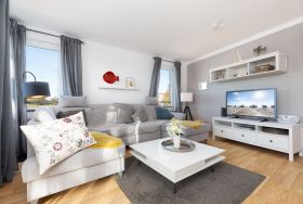Hier wurde sehr viel Wert auf eine hochwertige und charmante Einrichtung gelegt. Das geräumige und gemütliche Wohnzimmer mit großem Flachbildfernseher ist mit einer separaten Essecke und einer einer gemütlichen Wohnlandschaft ausgestattet. Dies ist außerdem zu einer Schlafcouch ausklappbar, auf der gegebenenfalls eine weitere Person schlafen könnte. Im Schlafzimmer befindet sich ein komfortables Doppelbett (180x200 cm) und ein zweiter Flachbildfernseher. Im zweiten, kleineren Schlafzimmer befindet sich ein großes Doppelbett (140x200 cm). Die moderne Küche ist mit dem nötigen Equipment ausgestattet, der morgentliche Kaffee kann gemütlich am Küchentresen zu sich genommen werden. Eine Waschmaschine zur Eigennutzung befindet sich in der Küche. Das Badezimmer ist mit einer Badewanne ausgestattet. Die Badewanne ist außerdem mit einer ausklappbaren Duschwand ausgestattet, so dass sie bequem im Stehen duschen können.