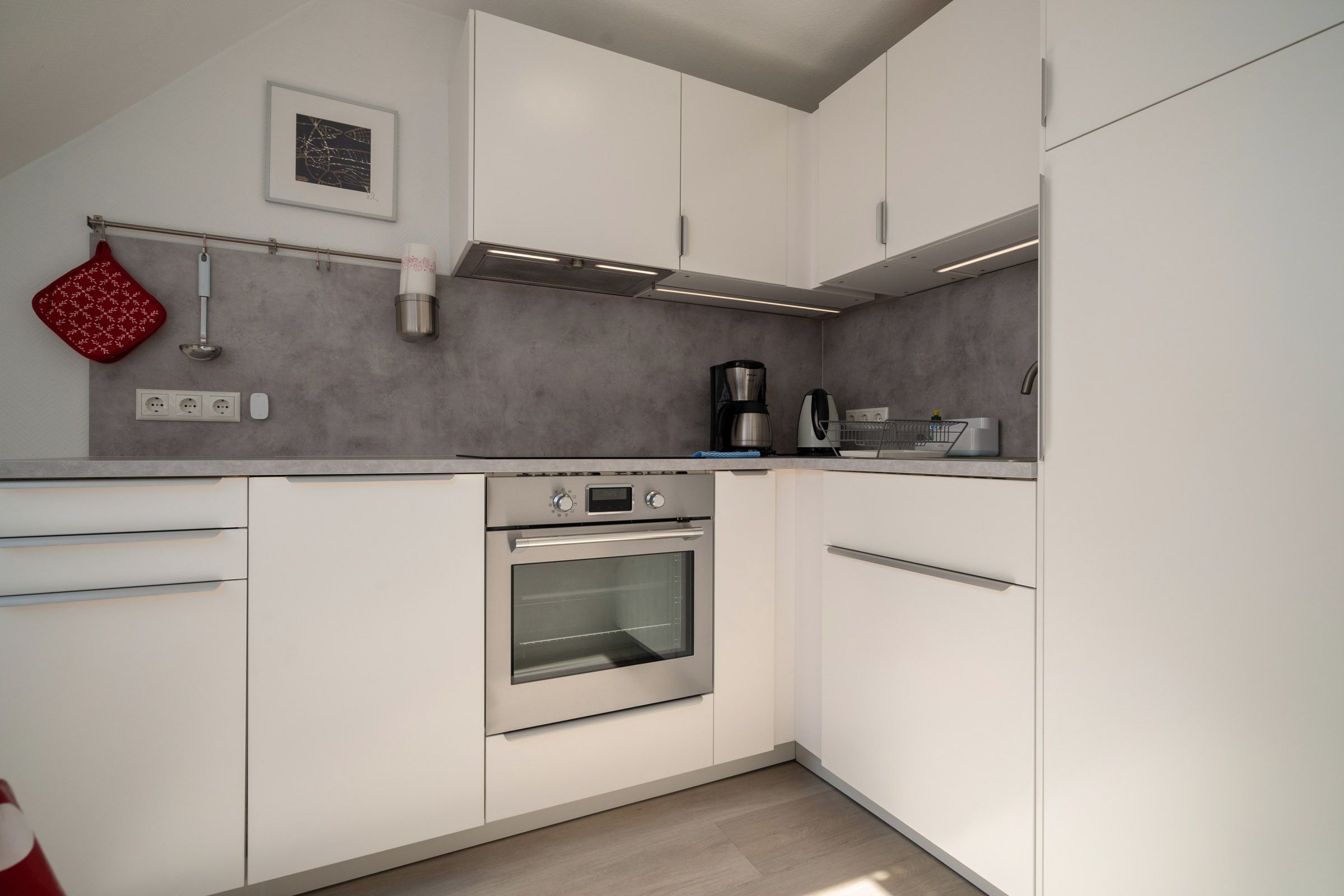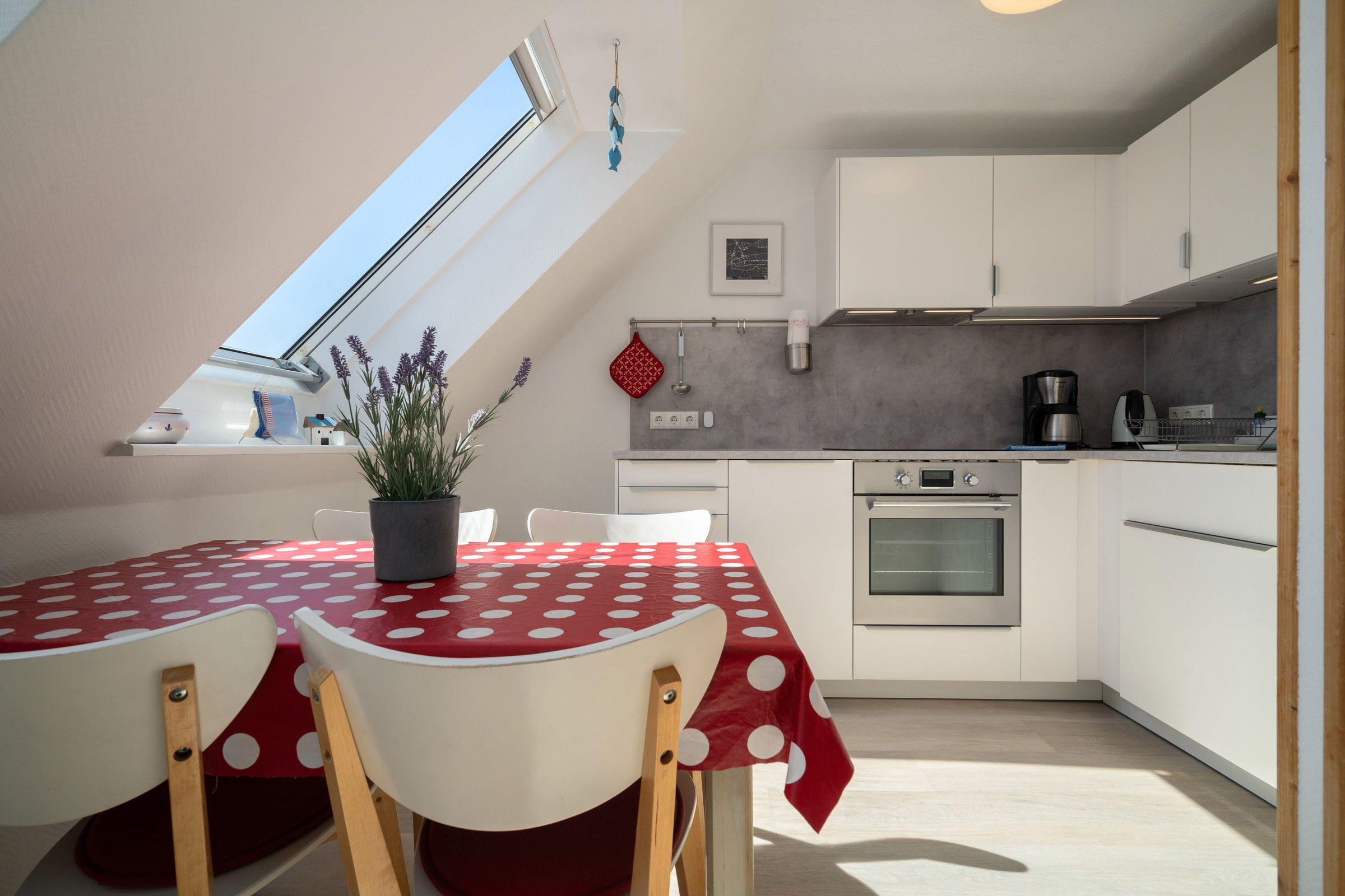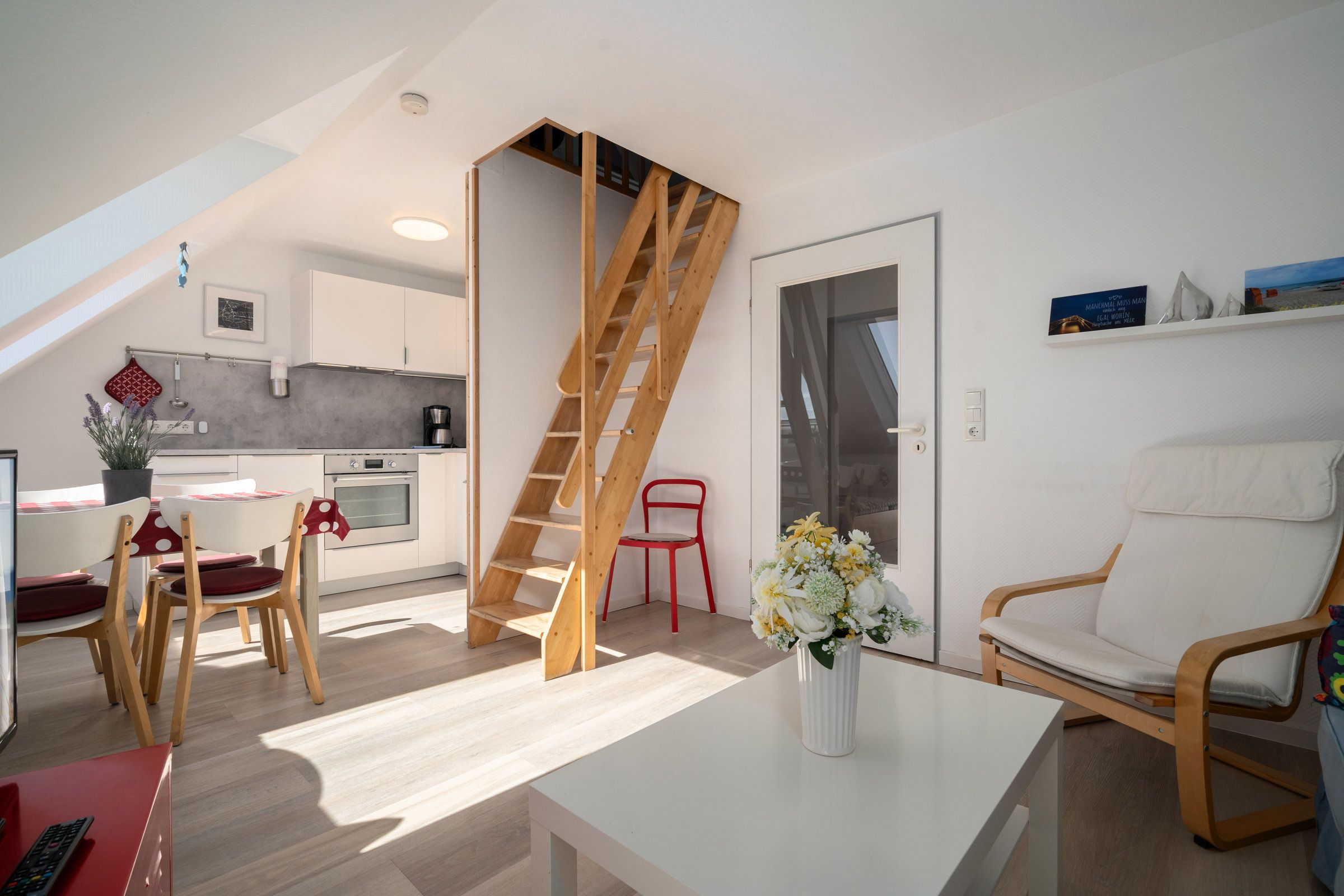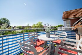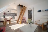 Im 2. Obergeschoss befindet sich das Wohnzimmer mit Südbalkon, Küchenzeile mit Essbereich, ein Duschbad und ein Schlafzimmer mit Doppelbett. In der offenen Galerie im Dachgeschoss befindet sich ein weiteres Schlafzimmer, das mit zwei Einzelbetten ausgestattet ist. Ein kostenloser WLAN–Anschluss verbindet Sie auch im Urlaub mit dem Rest der Welt.