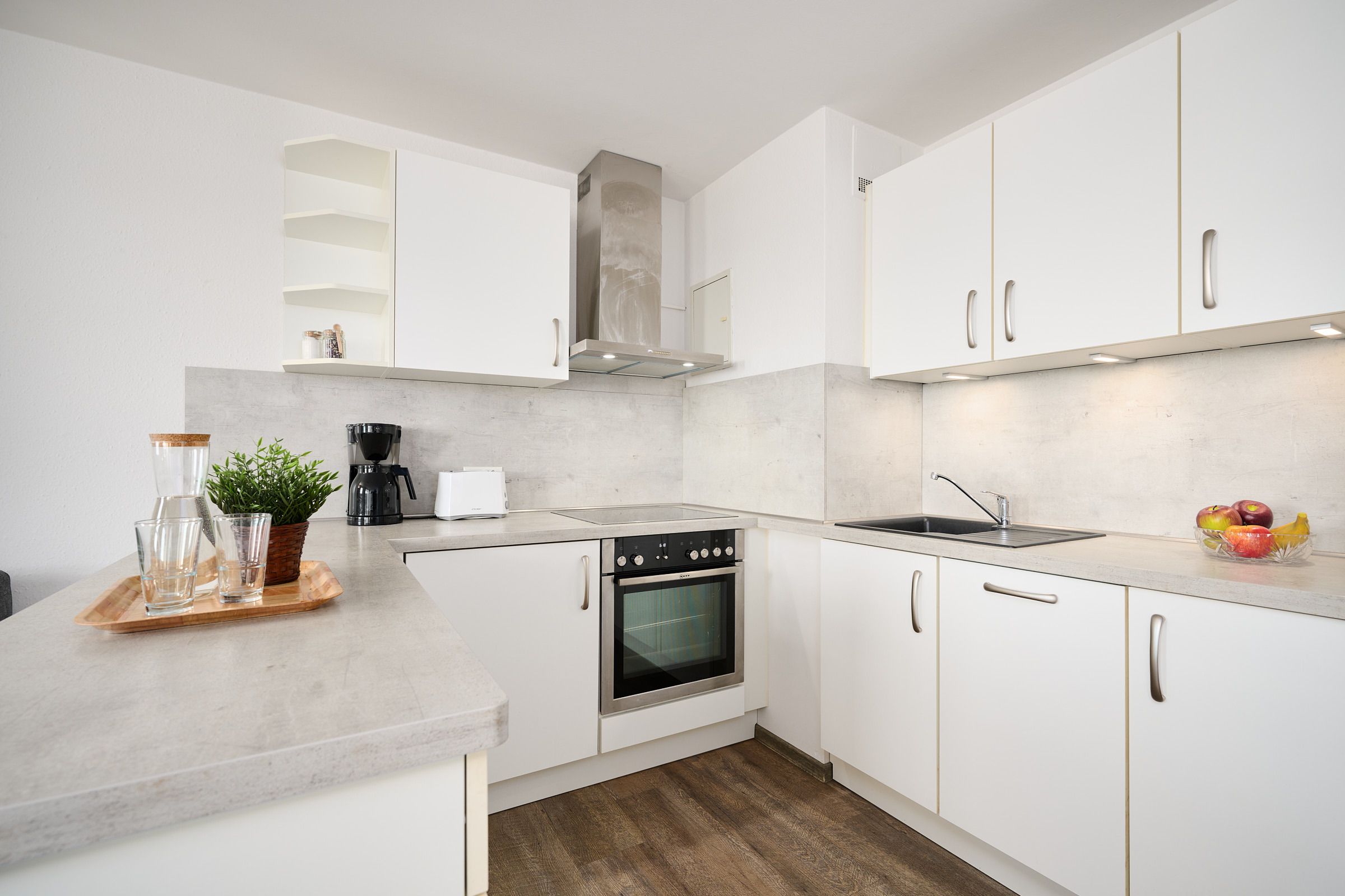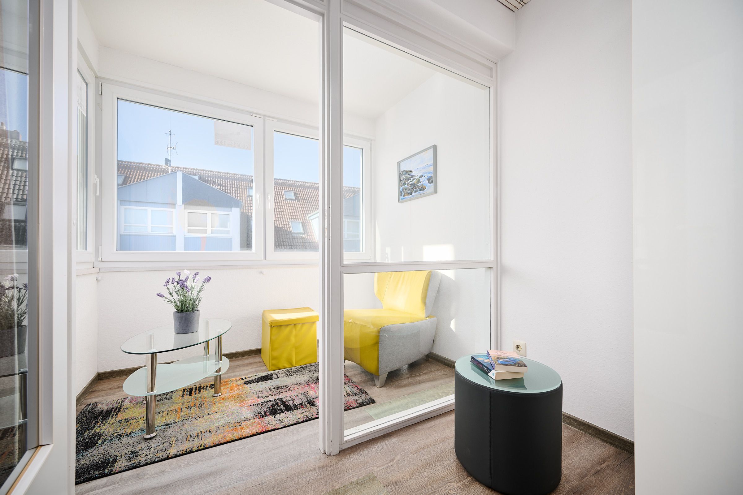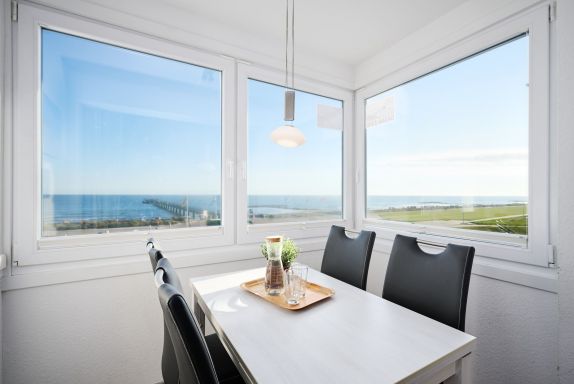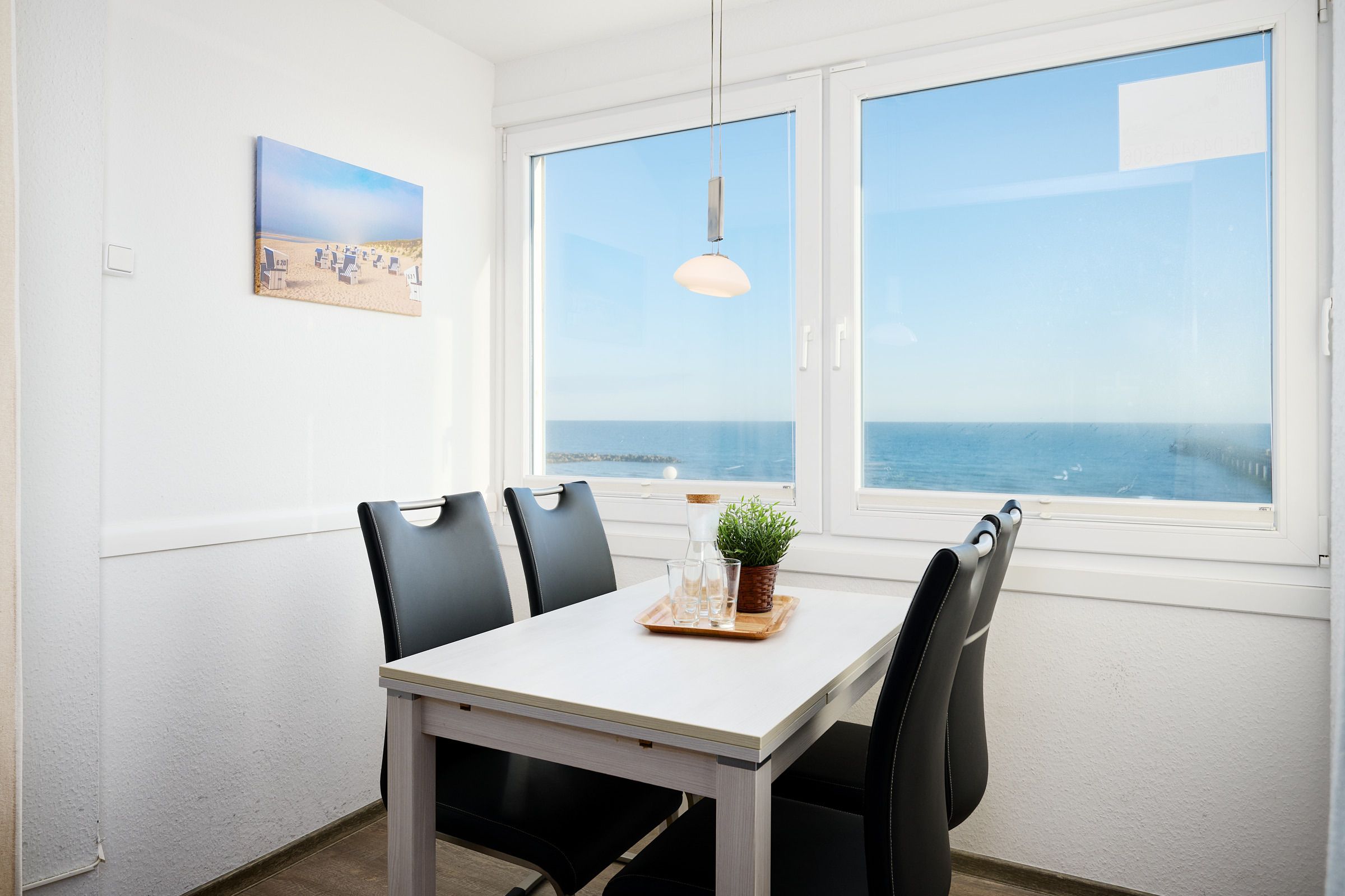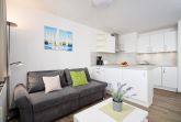Die Fläche von ca. 43m² verteilt sich auf ein separates Schlafzimmer, ein Duschbad, ein Wohnzimmer mit offener Küche und zwei verglaste Balkone mit traumhaftem Ostseeblick (die Fenster lassen sich weit öffnen).