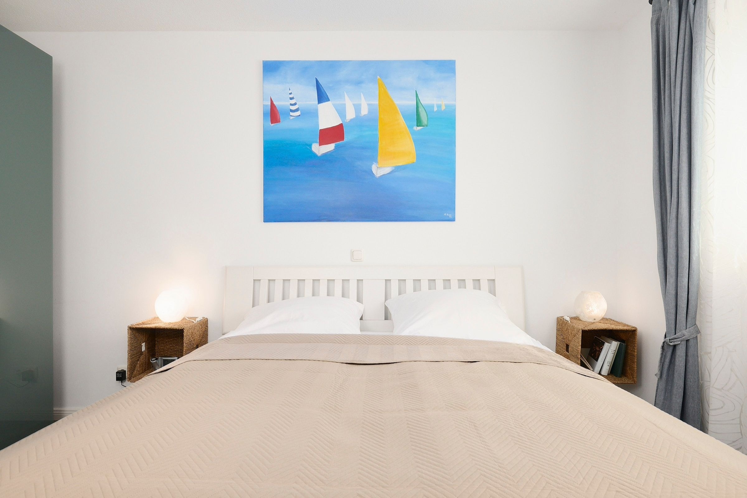 Schlafzimmer: 1 Doppelbett (2x 90x200 cm), Sichtschutz: Gardinen, Verdunklung: Außenjalousien