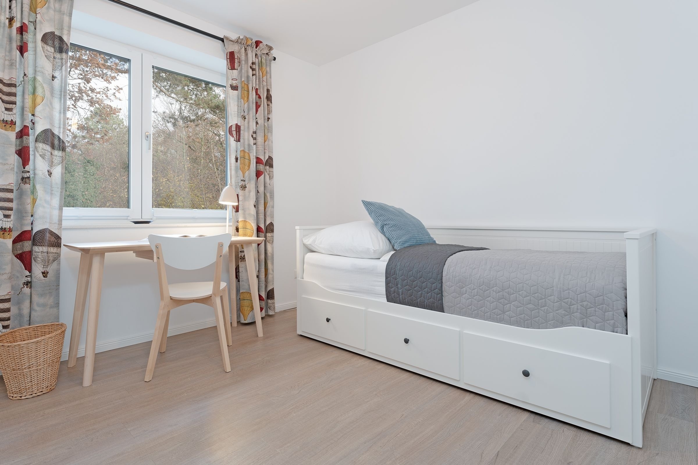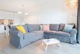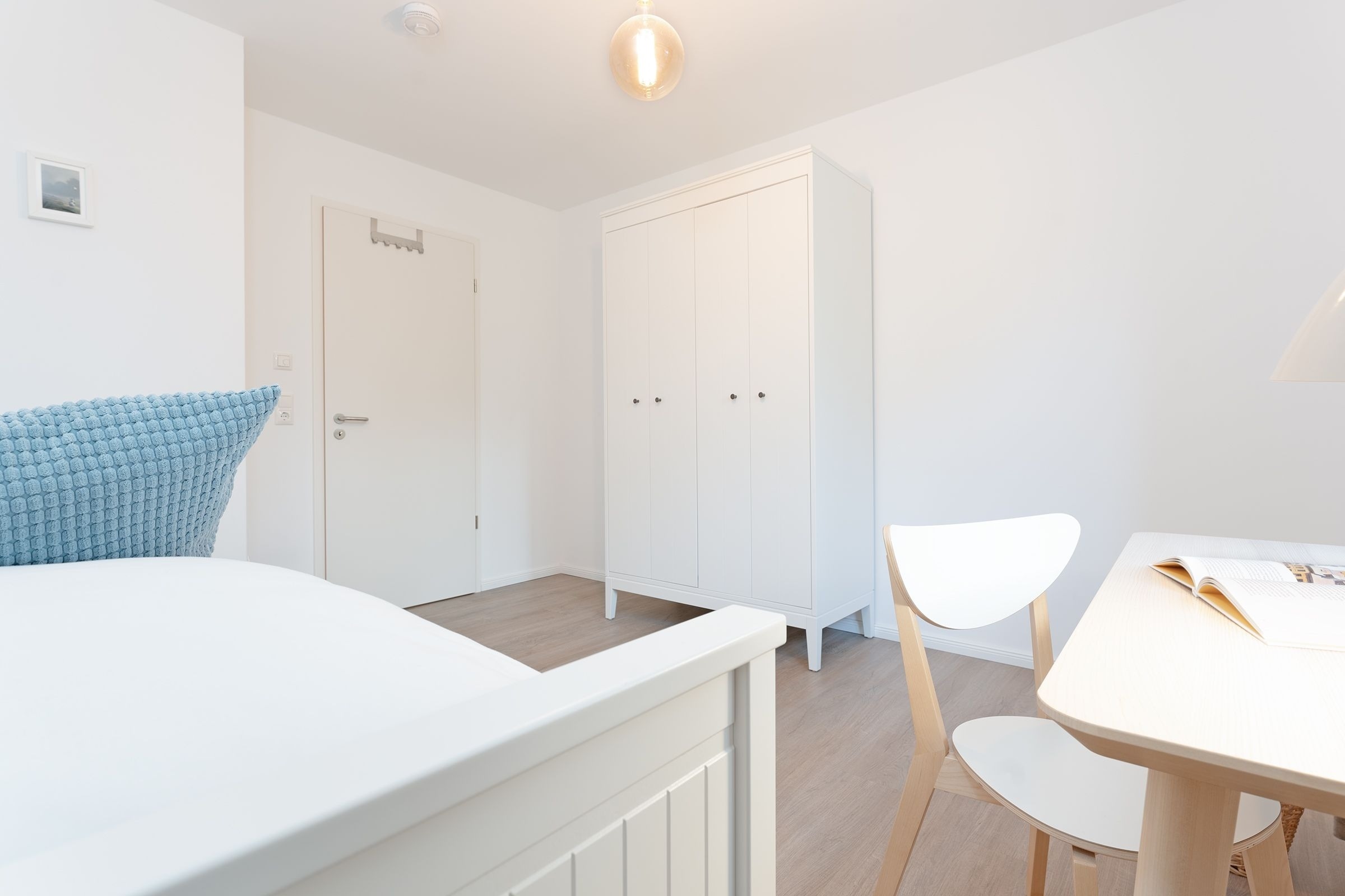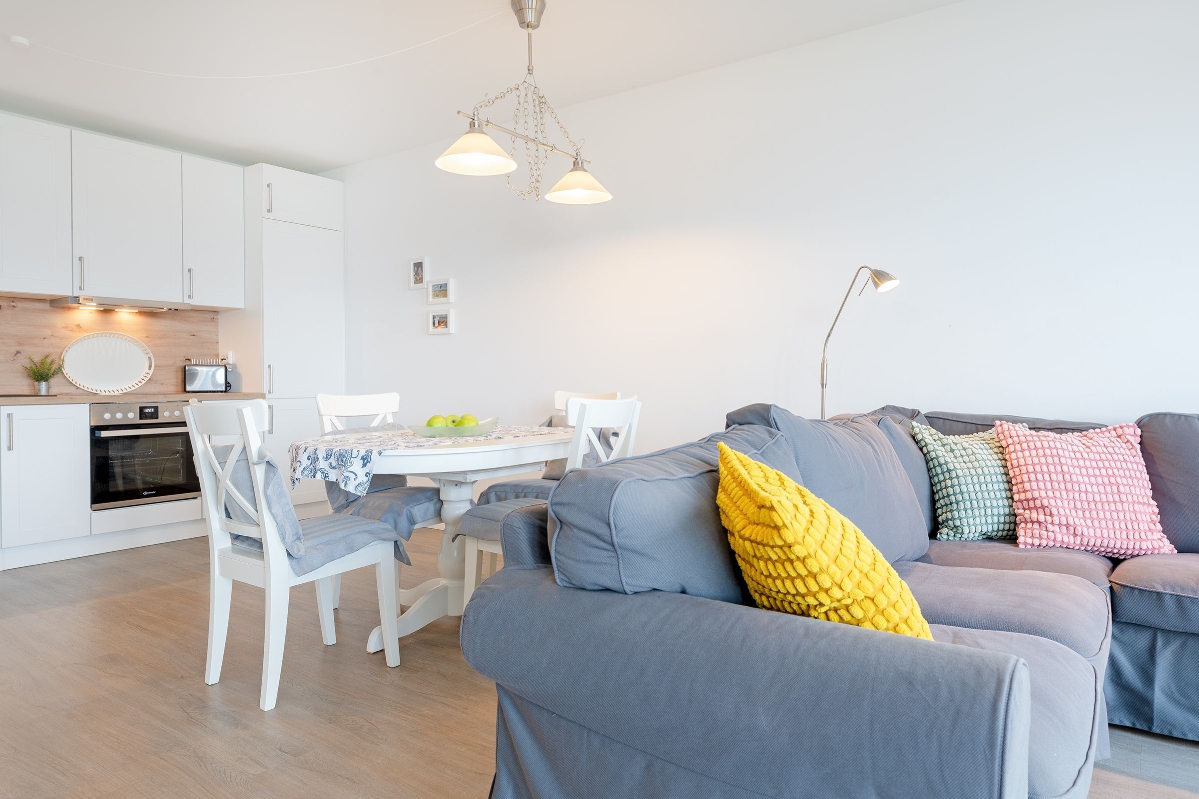 Der helle Wohnbereich empfängt Sie mit einer gemütlichen Sitzecke und einer kuscheligen Sofalandschaft – und einem traumhaften Blick auf den Großen Plöner See. Treten Sie auf den großzügigen, möblierten Südwest-Balkon und lassen Sie hier den Abend mit Ihren Lieblingsspeisen ausklingen. Die zum Wohnbereich hin offene, moderne Küche mit Geschirrspüler und Nespresso-Maschine bringt Hobbyköche sicher zum Lächeln. Nach einem tollen Urlaubstag finden Sie im Doppelbett (2x 90x200 cm) im Schlafzimmer erholsamen Schlaf. Von hier aus haben Sie auch Zutritt auf den großen Balkon. Das zweite Schlafzimmer bietet ein Kojenbett (80x200 cm, ausziehbar auf 160x200 cm). Morgens begrüßt Sie das tageslichthelle Bad mit bodengleicher Dusche und Badewanne. Dazu gibt es ein Gäste-WC. Ziehen Sie zum Start in den Tag ein paar Bahnen durch den See, eine schöne Badestelle ist fußläufig erreichbar.