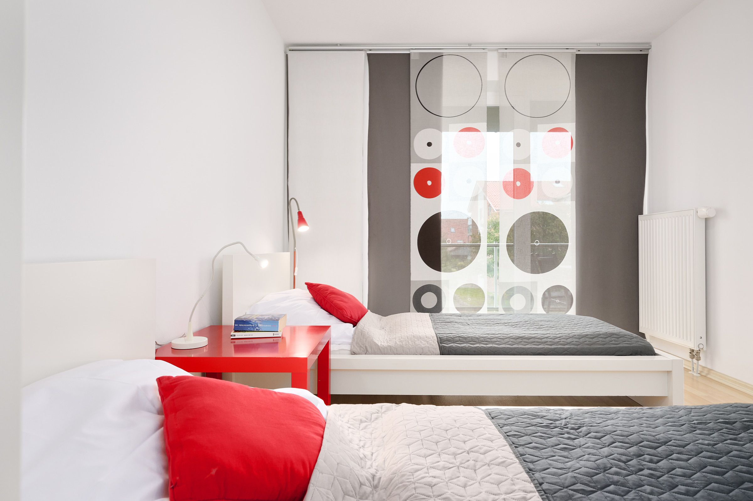 Schlafzimmer 2: 2 Einzelbetten (je 90x200 cm), Kleiderschrank, Verdunkelung: Gardine, Platz für Babybett vorhanden