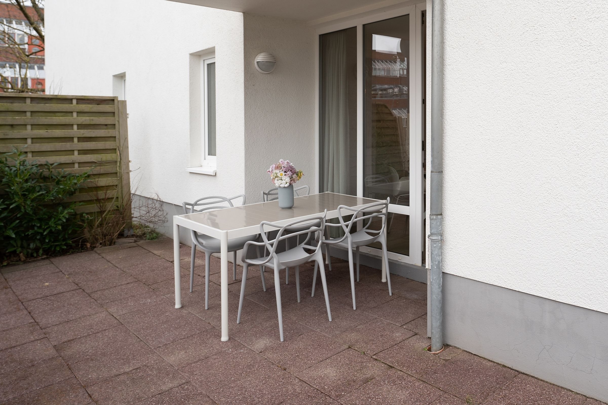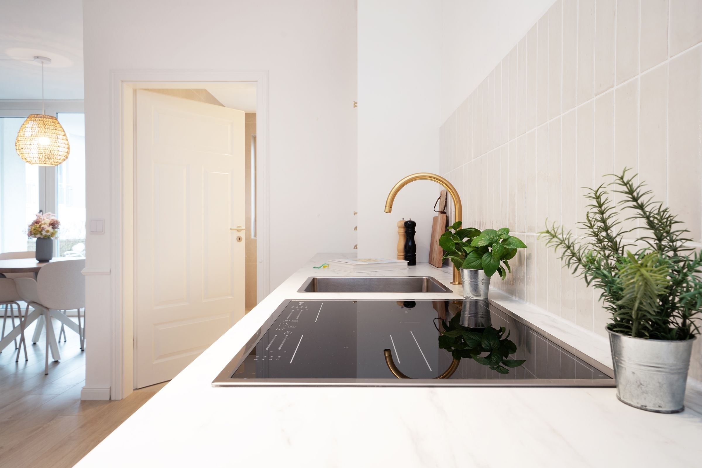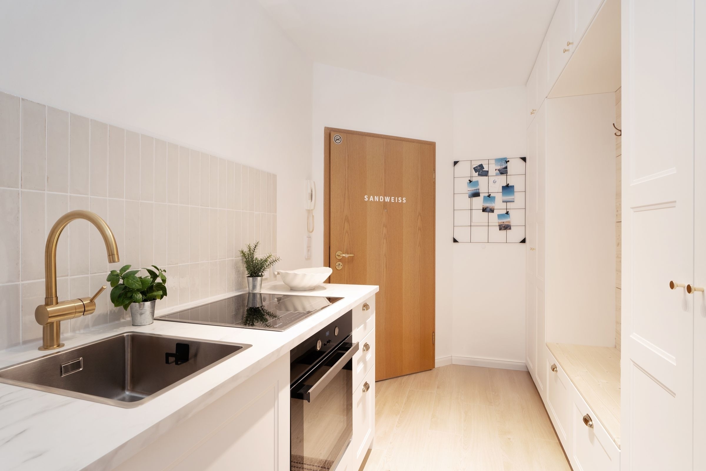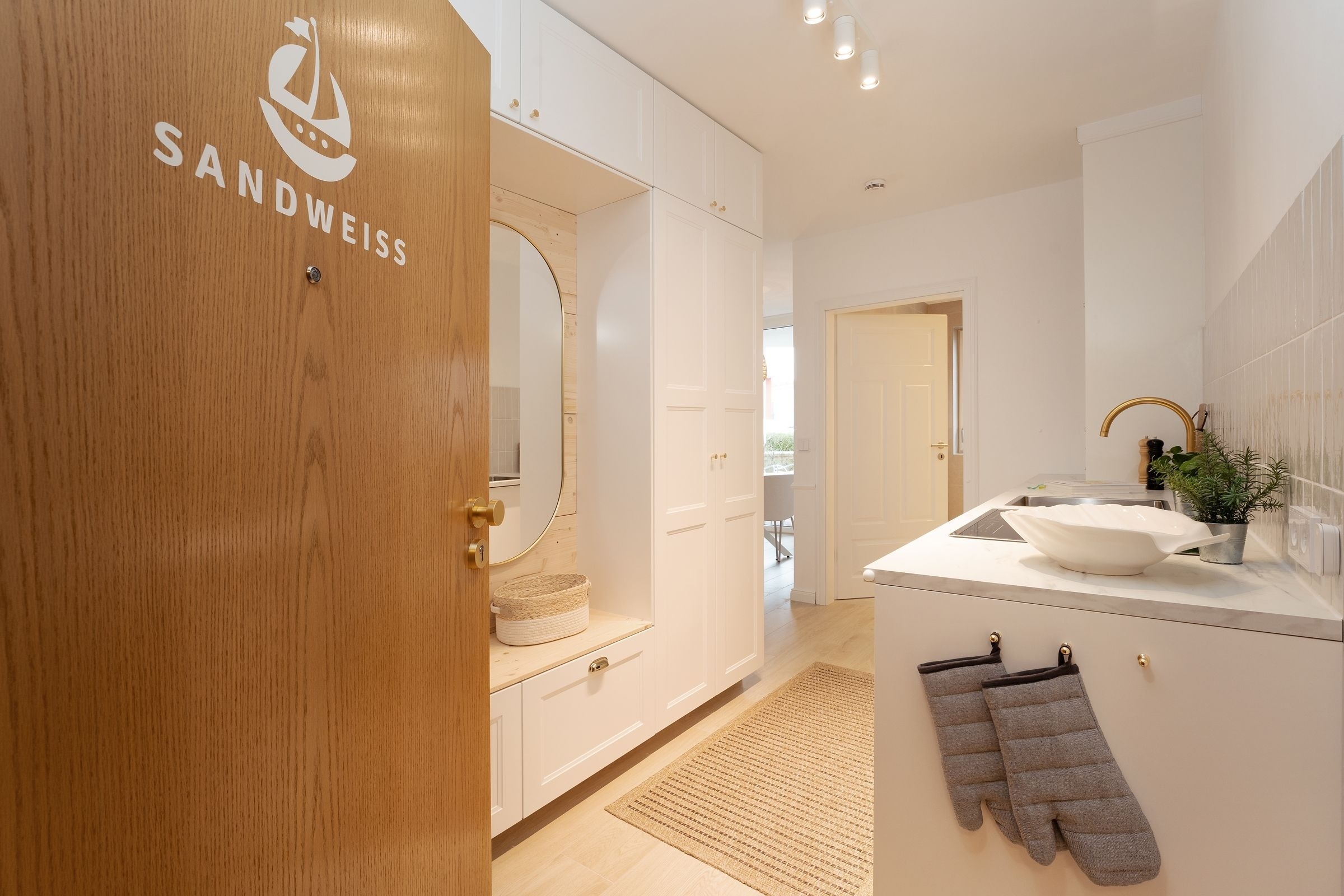Diese elegant eingerichtete Ferienwohnung auf dem Priwall besticht durch ihre geschmackvolle Einrichtung und lichtdurchflutete Räume. Der stilvolle Wohnbereich lädt mit einer gemütlichen Sitzecke und einem hochwertigen Flachbild-TV zu entspannten Abenden ein. Die großzügige Terrasse, ausgestattet mit Gartenmöbeln, bietet die perfekte Kulisse für gemeinsame Stunden an der frischen Ostseeluft. Die offene Küche im Eingangsbereich verbindet modernes Design mit Funktionalität. Ausgestattet mit einem Induktionsherd, Backofen, einem Kühlschrank mit Gefrierfach, Nespresso-Maschine, Wasserkocher und weiteren Annehmlichkeiten, ist sie perfekt für Kochliebhaber. Der angrenzende Essbereich fügt sich harmonisch in das Ambiente ein. Das Schlafzimmer überzeugt durch sein komfortables Doppelbett (2x 90x200 cm) und stilvolles Interieur. Ein bequemes Schlafsofa bietet im Wohnbereich zwei zusätzliche Schlafmöglichkeiten (ca. 140x200 cm). Das tageslichthelle Badezimmer ist modern gestaltet und verfügt über eine bodengleiche Dusche sowie einen beheizbaren Handtuchhalter.