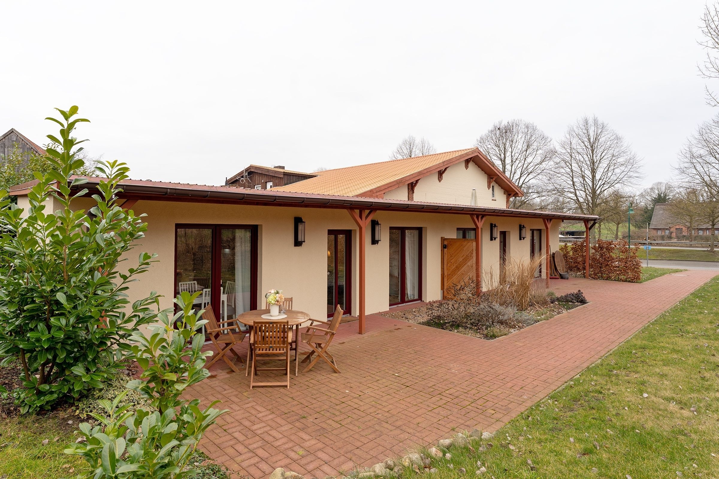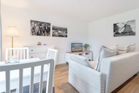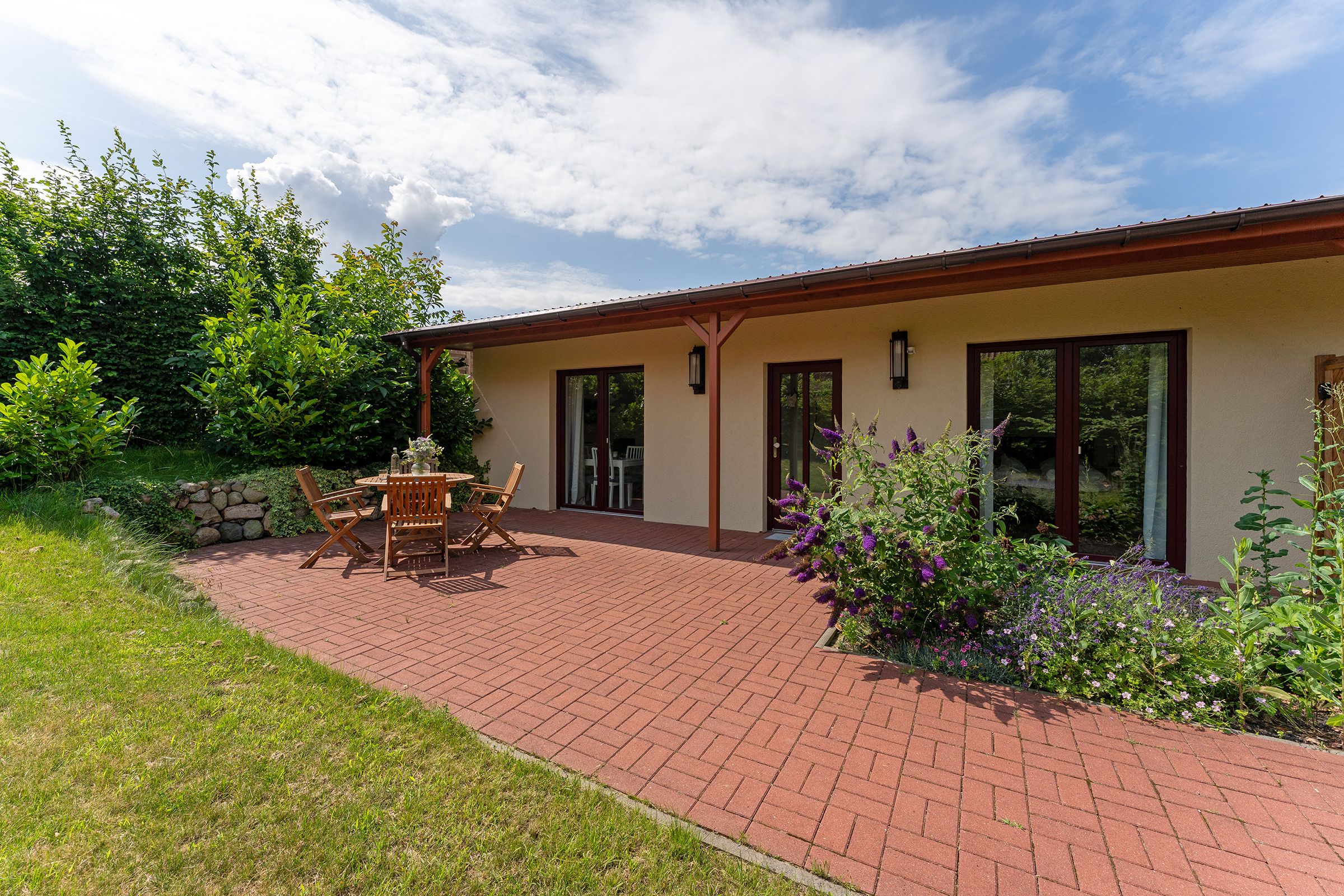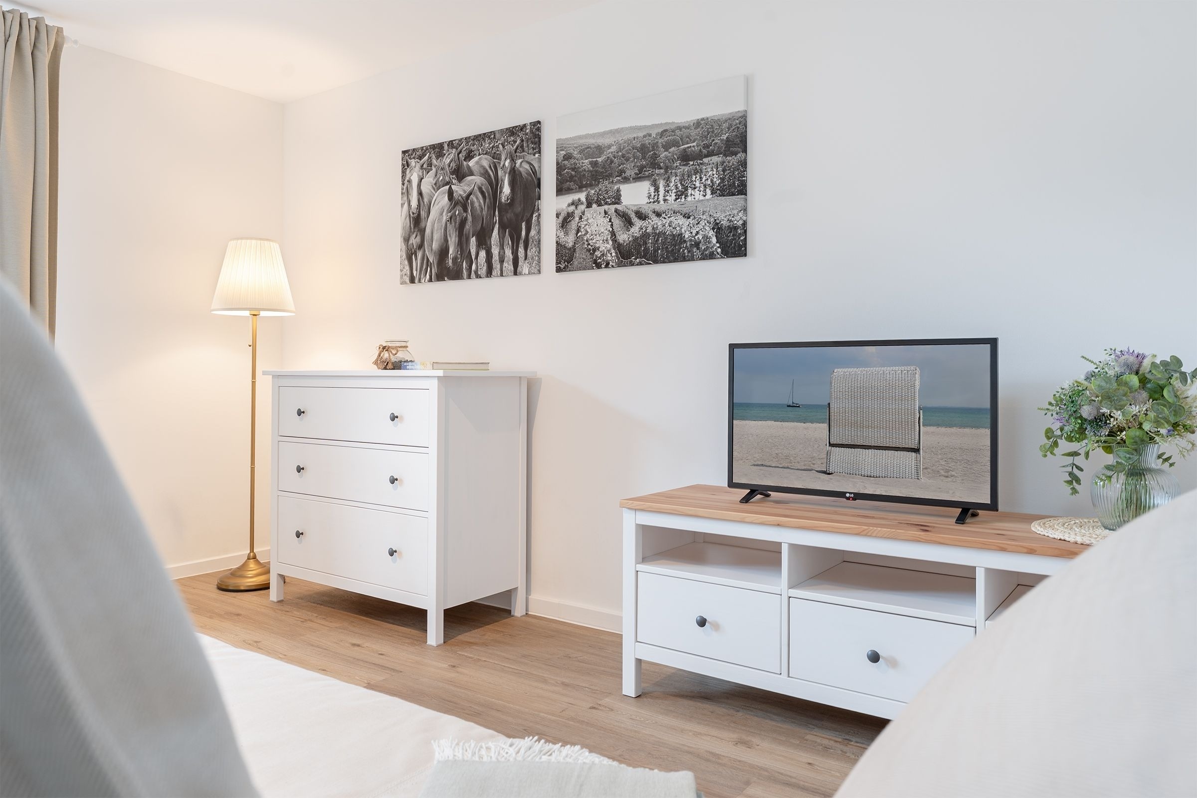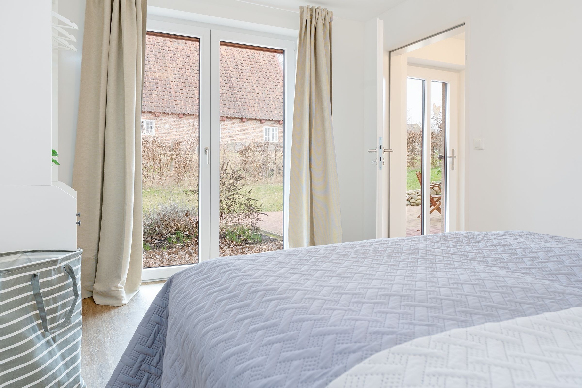 Ihre Ferienwohnung bietet einen traumhaften Ausblick auf die umliegende Natur, den Sie durch große Fensterfronten genießen können. Von hier aus gelangen Sie auf die großzügige, überdachte Terrasse mit vorgelagertem Gemeinschaftsgarten, die sich perfekt für entspannte Stunden an der frischen Luft eignet. Machen Sie es sich auf den komfortablen Gartenmöbeln gemütlich. In der offen zum Wohnzimmer gestalteten Küche können Sie kulinarische Highlights zaubern und diese gemeinsam am Esstisch genießen. Das separate Schlafzimmer verfügt über ein komfortables Boxspring-Doppelbett (160x200 cm) sowie genügend Stauraum für Ihre Urlaubsgarderobe. Eine zusätzliche Schlafmöglichkeit für zwei Personen befindet sich im Wohnbereich. Hier können Sie das gemütlich Sofa für die Nacht leicht in einen weiteren Schlafbereich (2x80x200 cm) verwandeln. Das moderne Duschbad verfügt zusätzlich über eine Waschmaschine, die für eine stets saubere Urlaubsgarderobe sorgt.