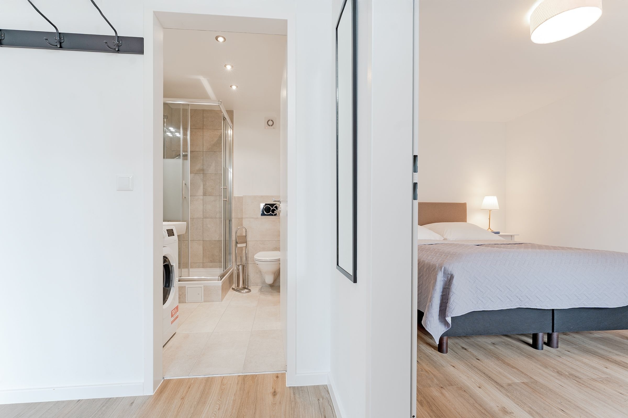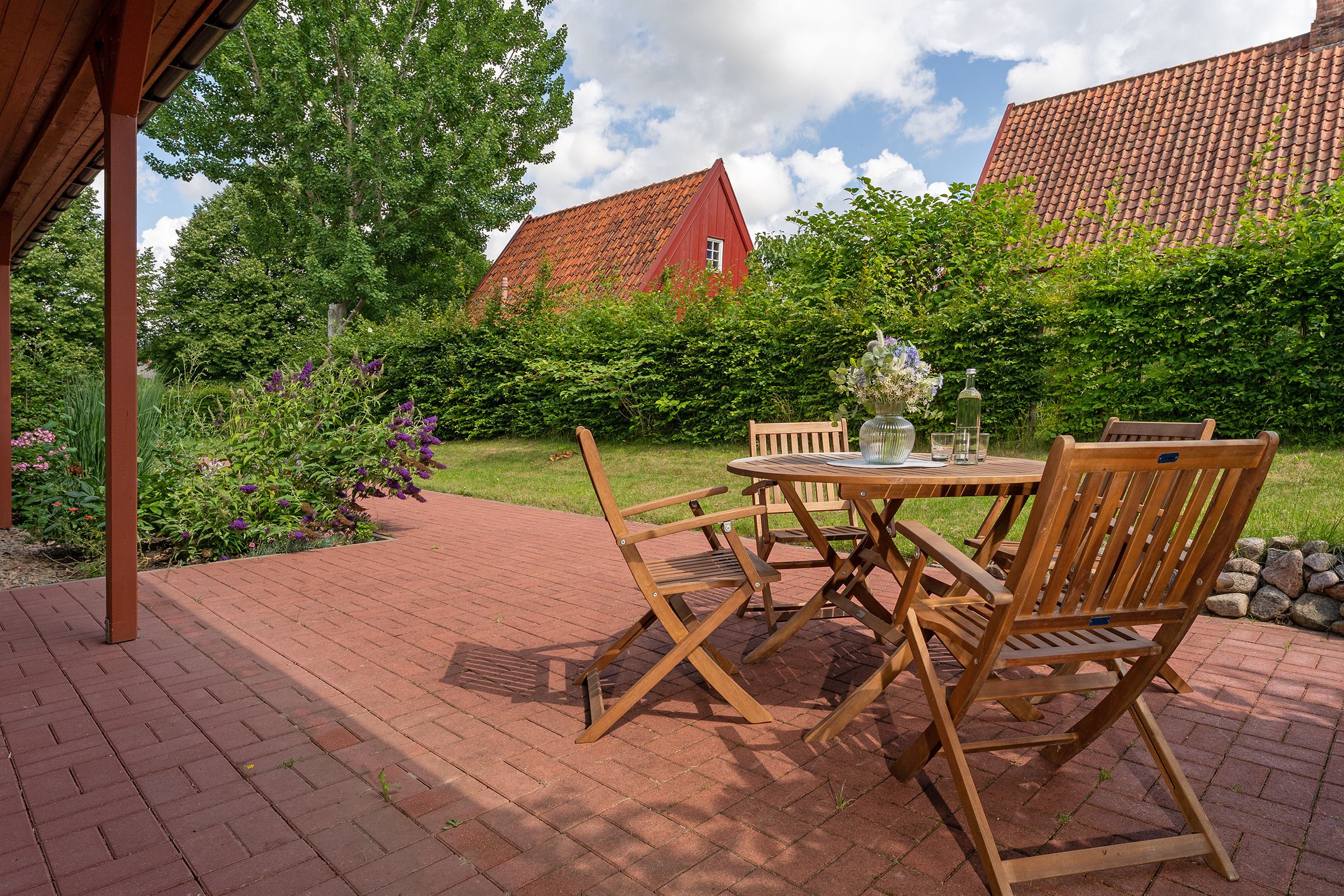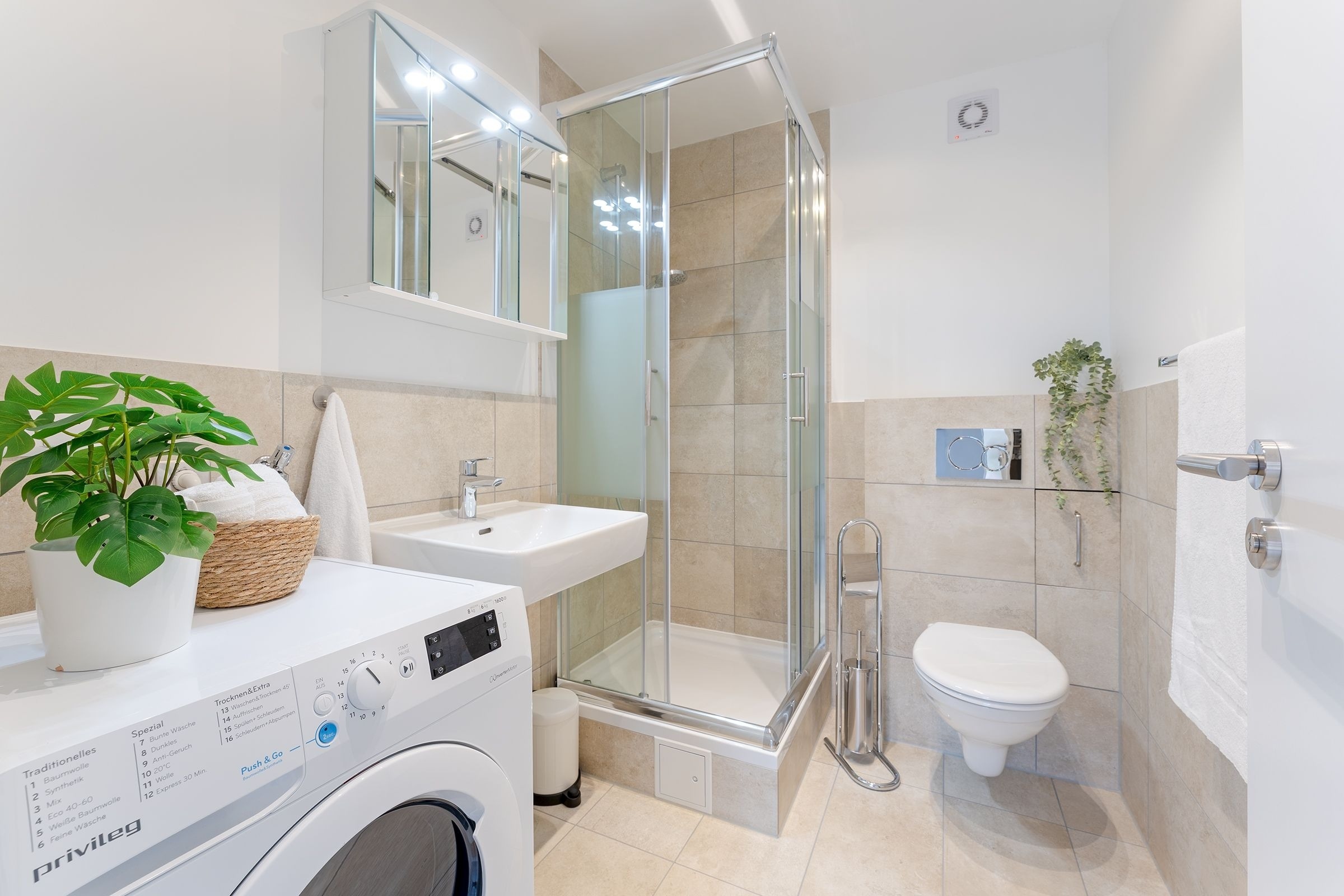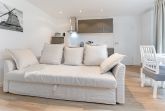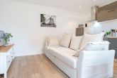 Ihre Ferienwohnung bietet einen traumhaften Ausblick auf die umliegende Natur, den Sie durch große Fensterfronten genießen können. Von hier aus gelangen Sie auf die großzügige, überdachte Terrasse mit vorgelagertem Gemeinschaftsgarten, die sich perfekt für entspannte Stunden an der frischen Luft eignet. Machen Sie es sich auf den komfortablen Gartenmöbeln gemütlich. In der offen zum Wohnzimmer gestalteten Küche können Sie kulinarische Highlights zaubern und diese gemeinsam am Esstisch genießen. Das separate Schlafzimmer verfügt über ein komfortables Boxspring-Doppelbett (160x200 cm) sowie genügend Stauraum für Ihre Urlaubsgarderobe. Eine zusätzliche Schlafmöglichkeit für zwei Personen befindet sich im Wohnbereich. Hier können Sie das gemütlich Sofa für die Nacht leicht in einen weiteren Schlafbereich (2x80x200 cm) verwandeln. Das moderne Duschbad verfügt zusätzlich über eine Waschmaschine, die für eine stets saubere Urlaubsgarderobe sorgt.