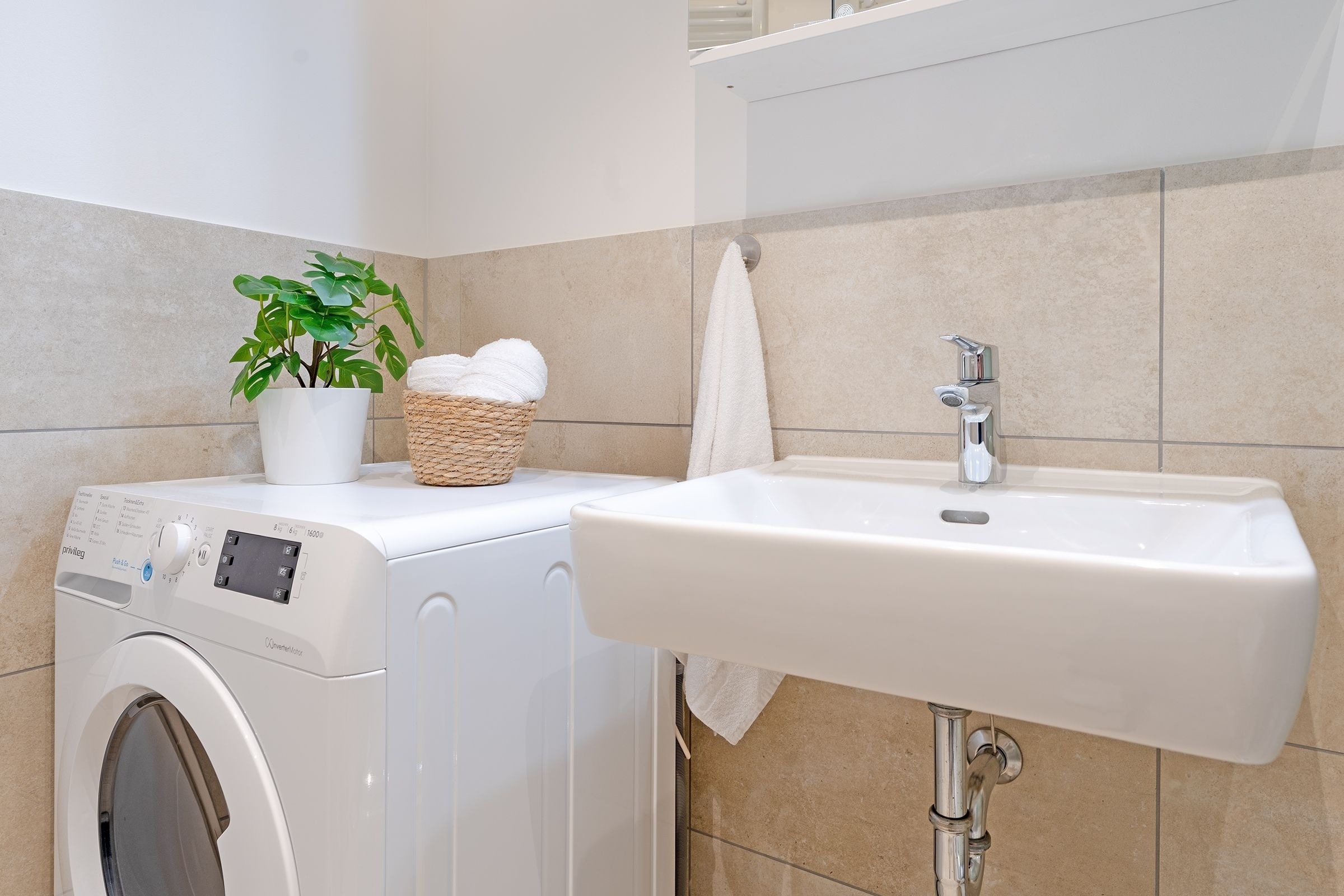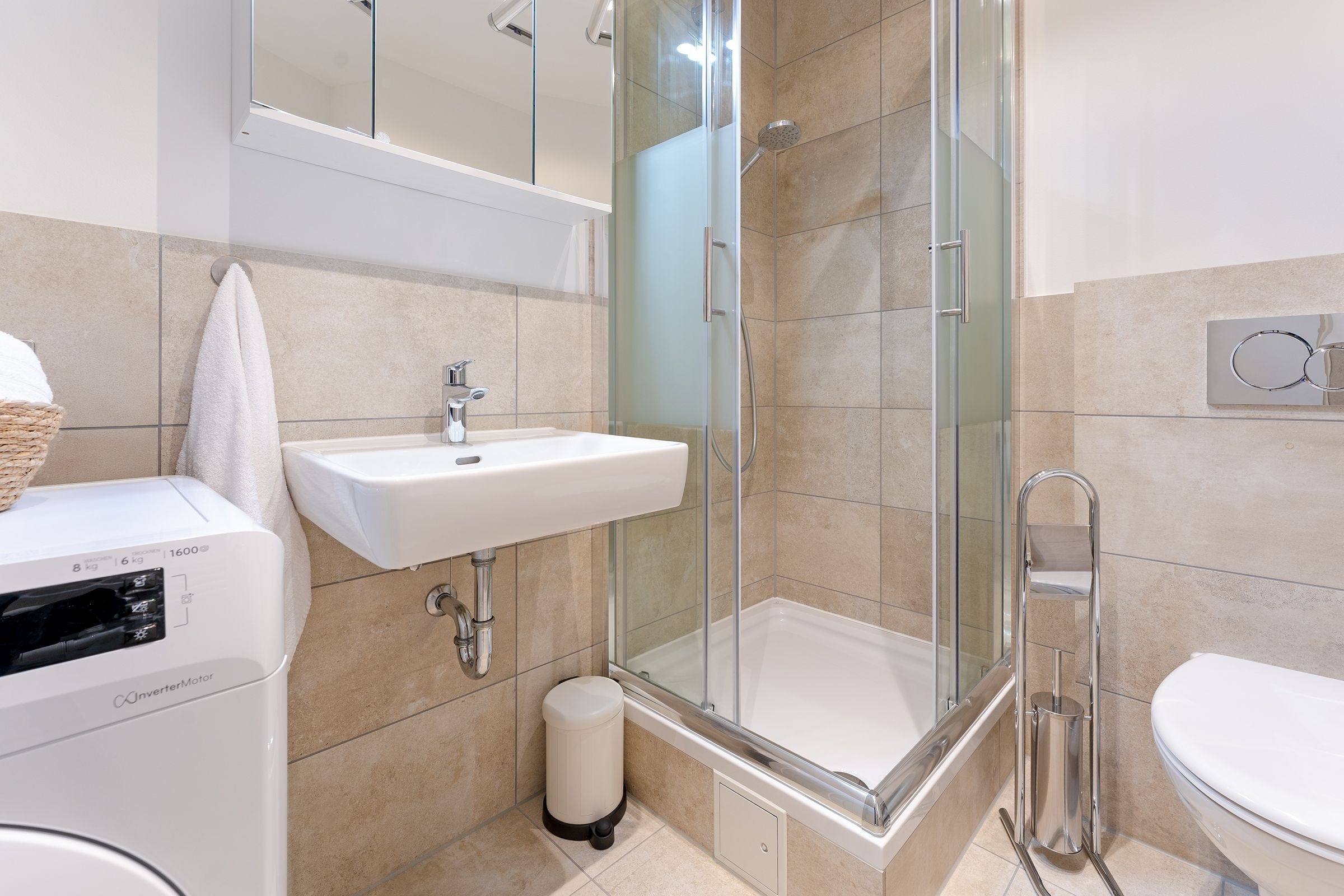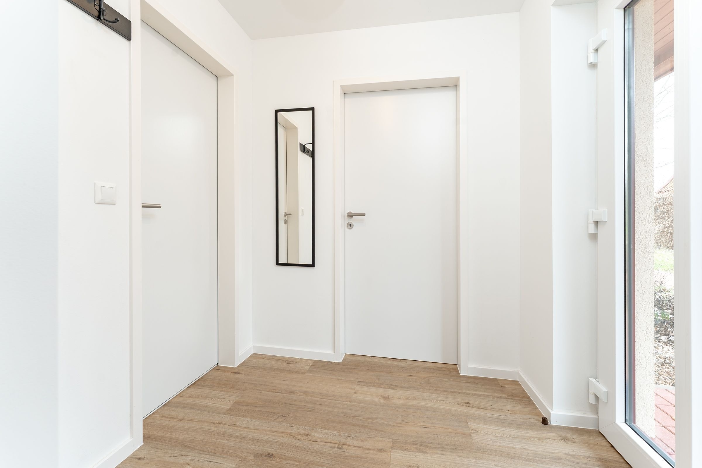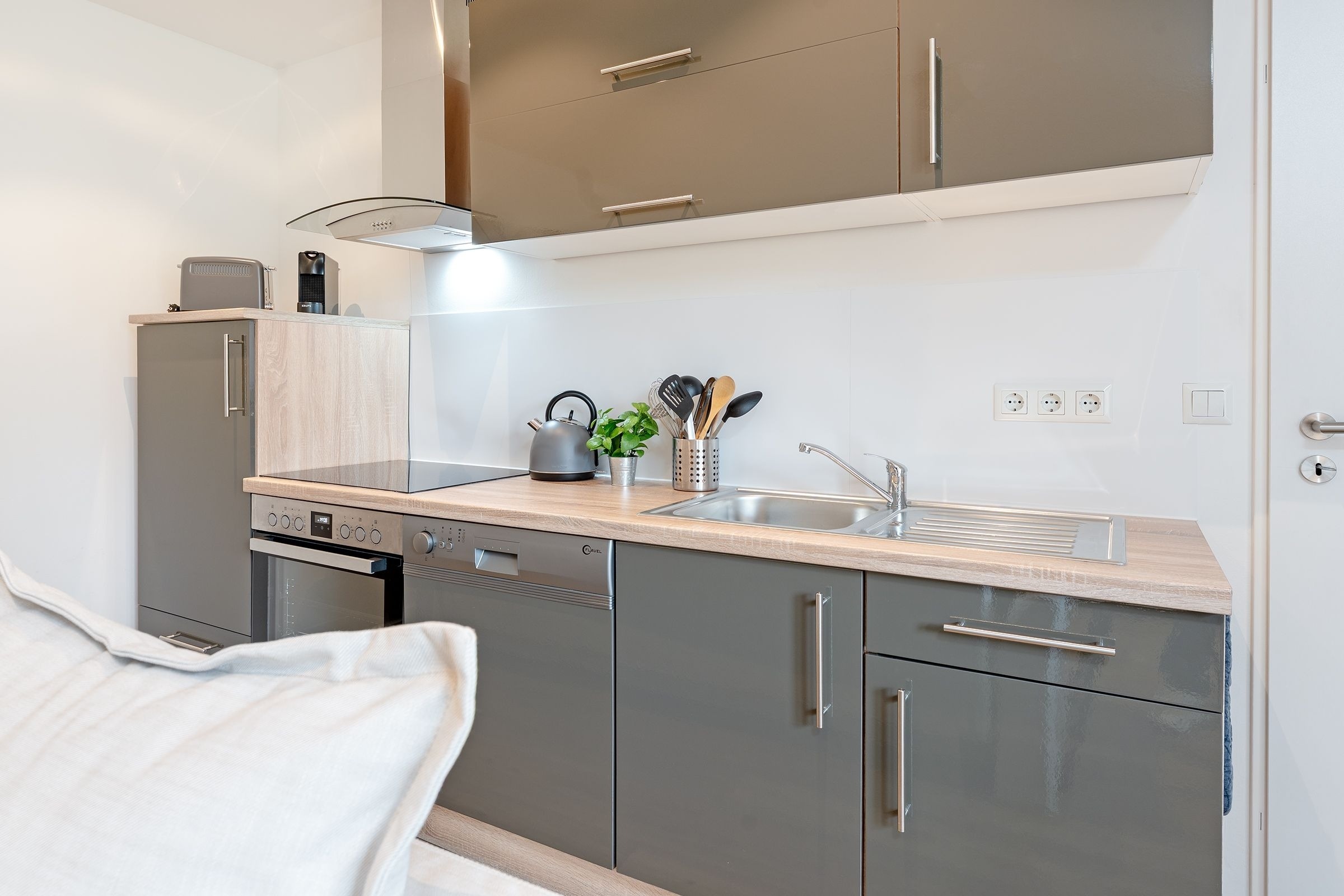 Ihre Ferienwohnung bietet einen traumhaften Ausblick auf die umliegende Natur, den Sie durch große Fensterfronten genießen können. Von hier aus gelangen Sie auf die großzügige, überdachte Terrasse mit vorgelagertem Gemeinschaftsgarten, die sich perfekt für entspannte Stunden an der frischen Luft eignet. Machen Sie es sich auf den komfortablen Gartenmöbeln gemütlich. In der offen zum Wohnzimmer gestalteten Küche können Sie kulinarische Highlights zaubern und diese gemeinsam am Esstisch genießen. Das separate Schlafzimmer verfügt über ein komfortables Boxspring-Doppelbett (160x200 cm) sowie genügend Stauraum für Ihre Urlaubsgarderobe. Eine zusätzliche Schlafmöglichkeit für zwei Personen befindet sich im Wohnbereich. Hier können Sie das gemütlich Sofa für die Nacht leicht in einen weiteren Schlafbereich (2x80x200 cm) verwandeln. Das moderne Duschbad verfügt zusätzlich über eine Waschmaschine, die für eine stets saubere Urlaubsgarderobe sorgt.