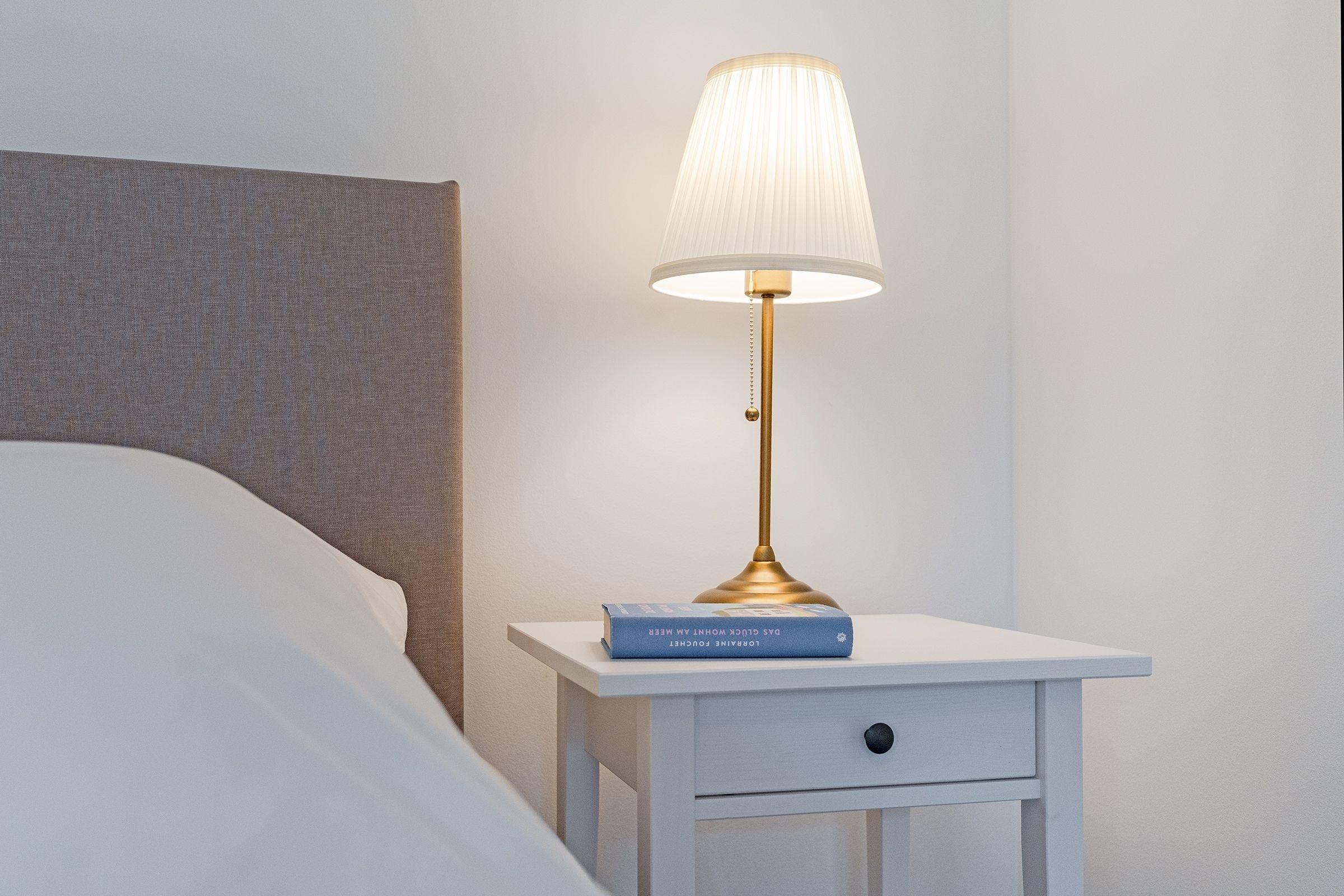 Schlafzimmer: 1 Boxspring-Doppelbett (160x200 cm), Kleiderschrank, Verdunkelung: Vorhänge, Platz für Babybett vorhanden