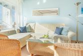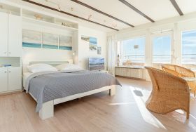 Der Wohn/Schlafbereich ist offen gestaltet und lädt mit einem gemütlichen Doppelbett (2x 90x200 cm) und einem Schlafsofa zum Entspannen ein. Die große Fensterfront sorgt für viel Tageslicht und eine freundliche Atmosphäre. Viel Platz bietet der große Balkon, der durch seine Verglasung auch in der kühleren Jahreszeit ausreichend Schutz bietet. Von hier aus gelangen Sie auch in das kleine Sommer-Schlafzimmer (unbeheizt), das mit einem weiteren Doppelbett (2x 90x200 cm) ausgestattet ist. Das Sommer-Schlafzimmer ist ab April nutzbar.