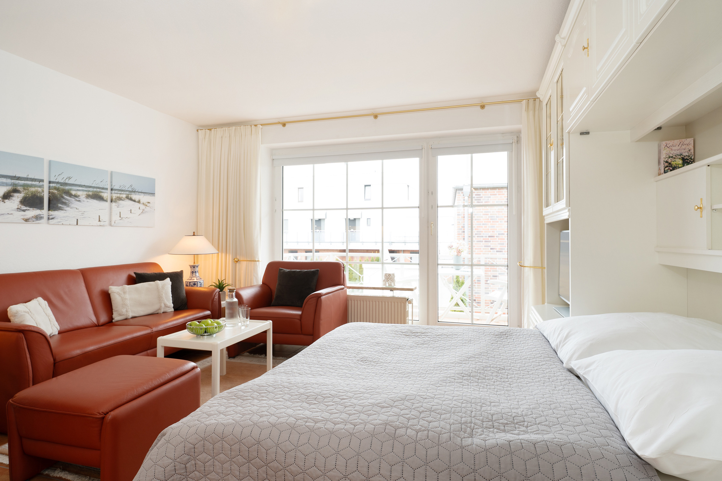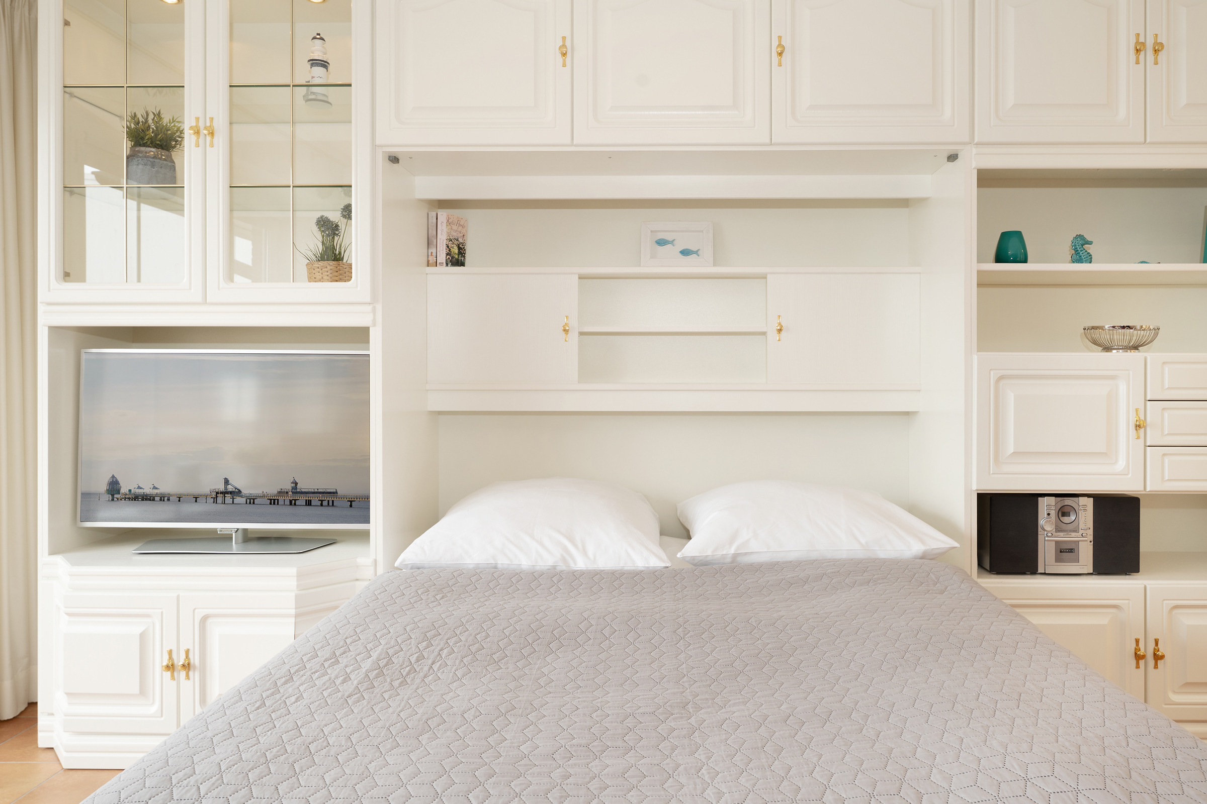 Der lichtdurchflutete Wohn- und Schlafbereich ist durchdacht gestaltet: Tagsüber genießen Sie entspannte Stunden auf den bequemen Sofas, abends verwandelt sich das komfortable Schrankbett (2x 90x200 cm) in eine erholsame Schlafstätte. Ein TV sorgt für Unterhaltung, während der offene Küchenbereich mit Essplatz zum gemeinsamen Genießen einlädt.