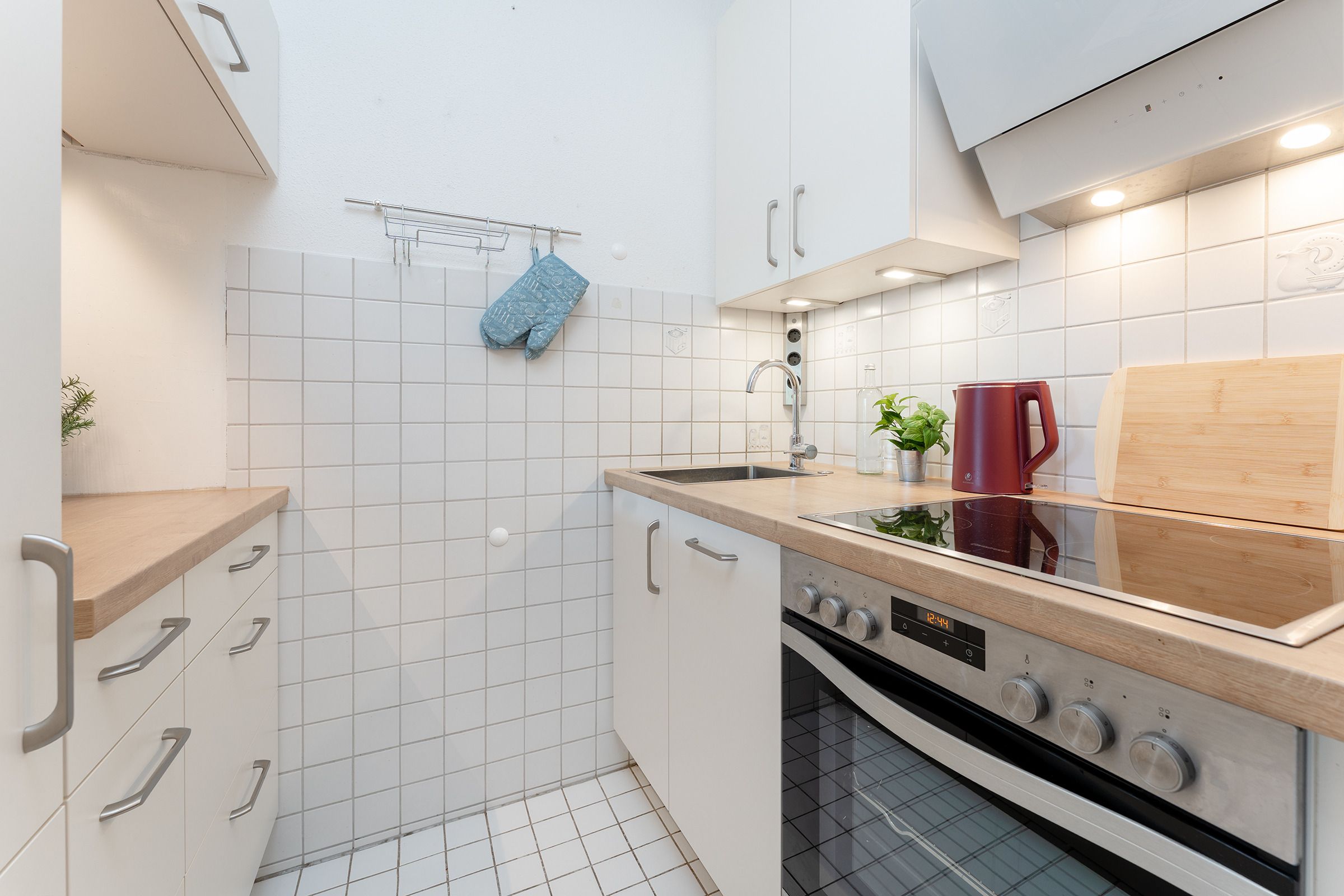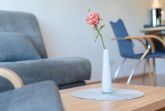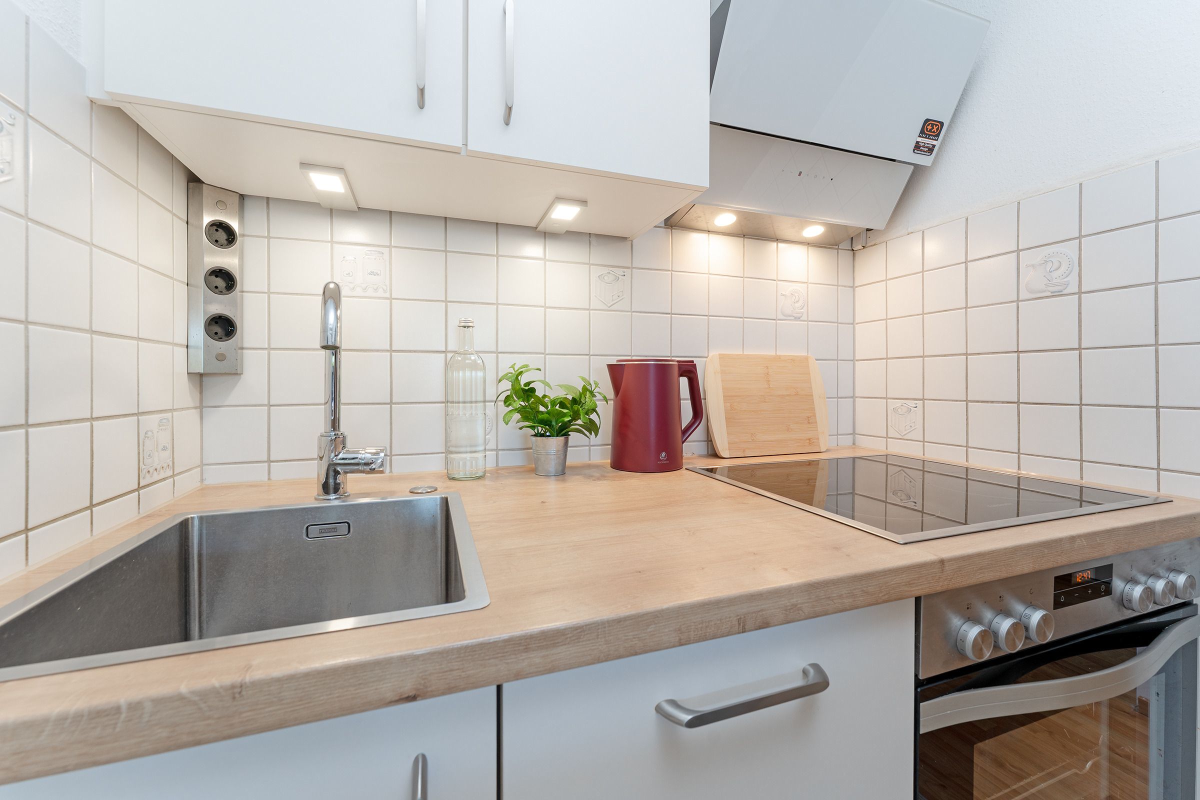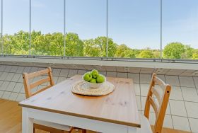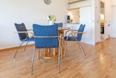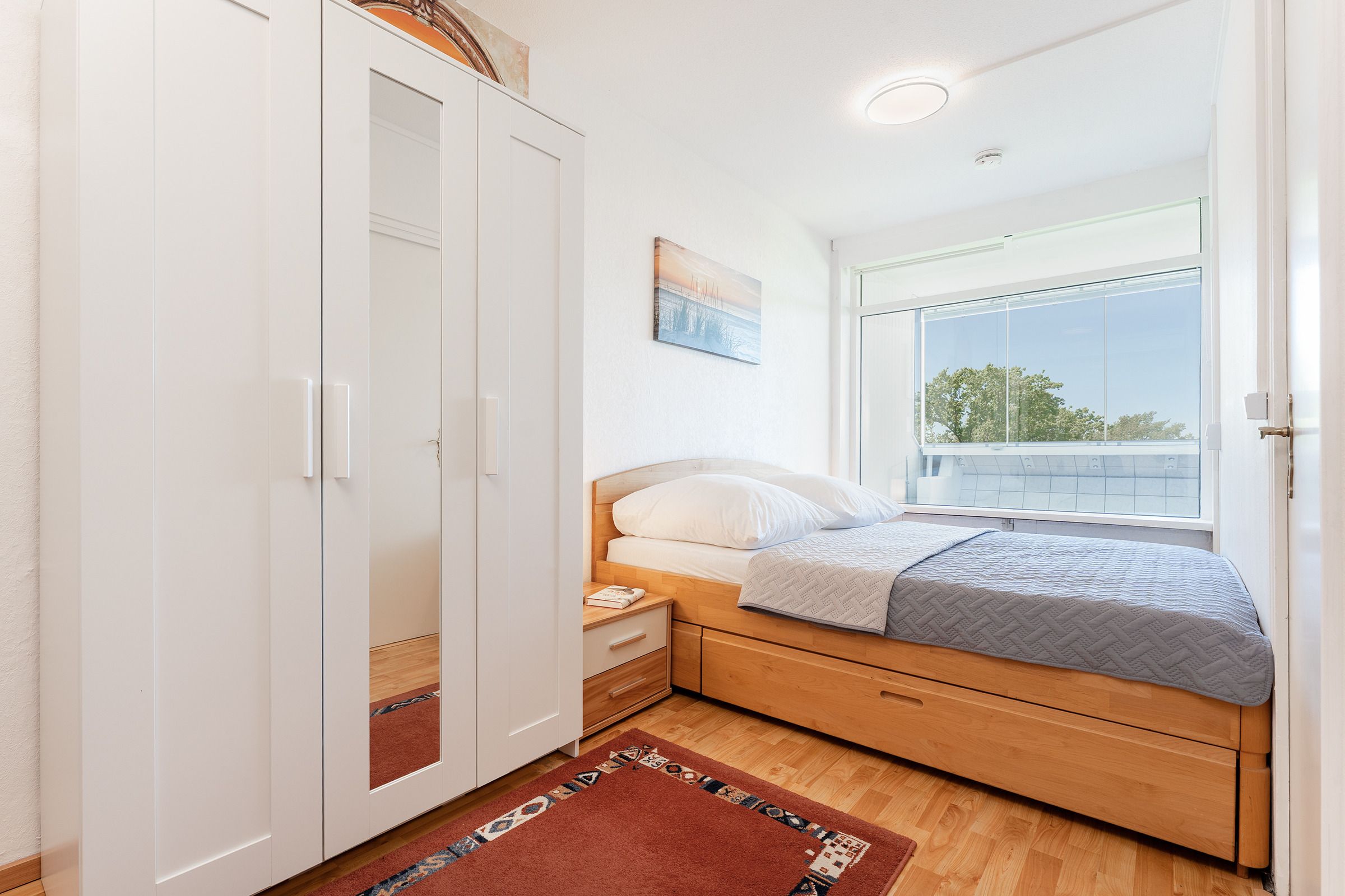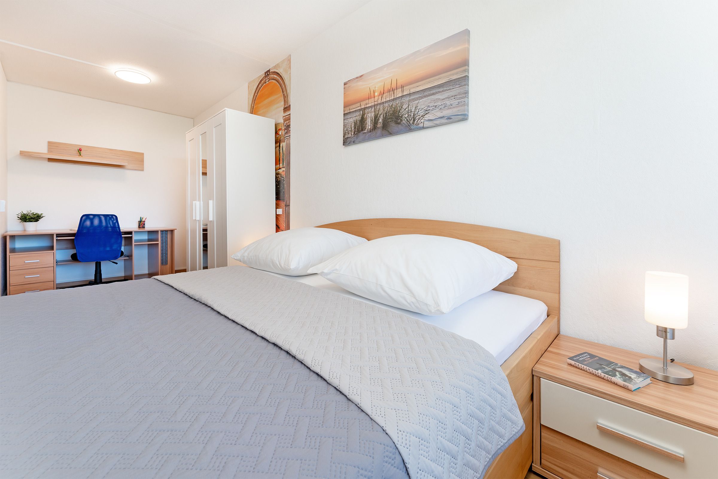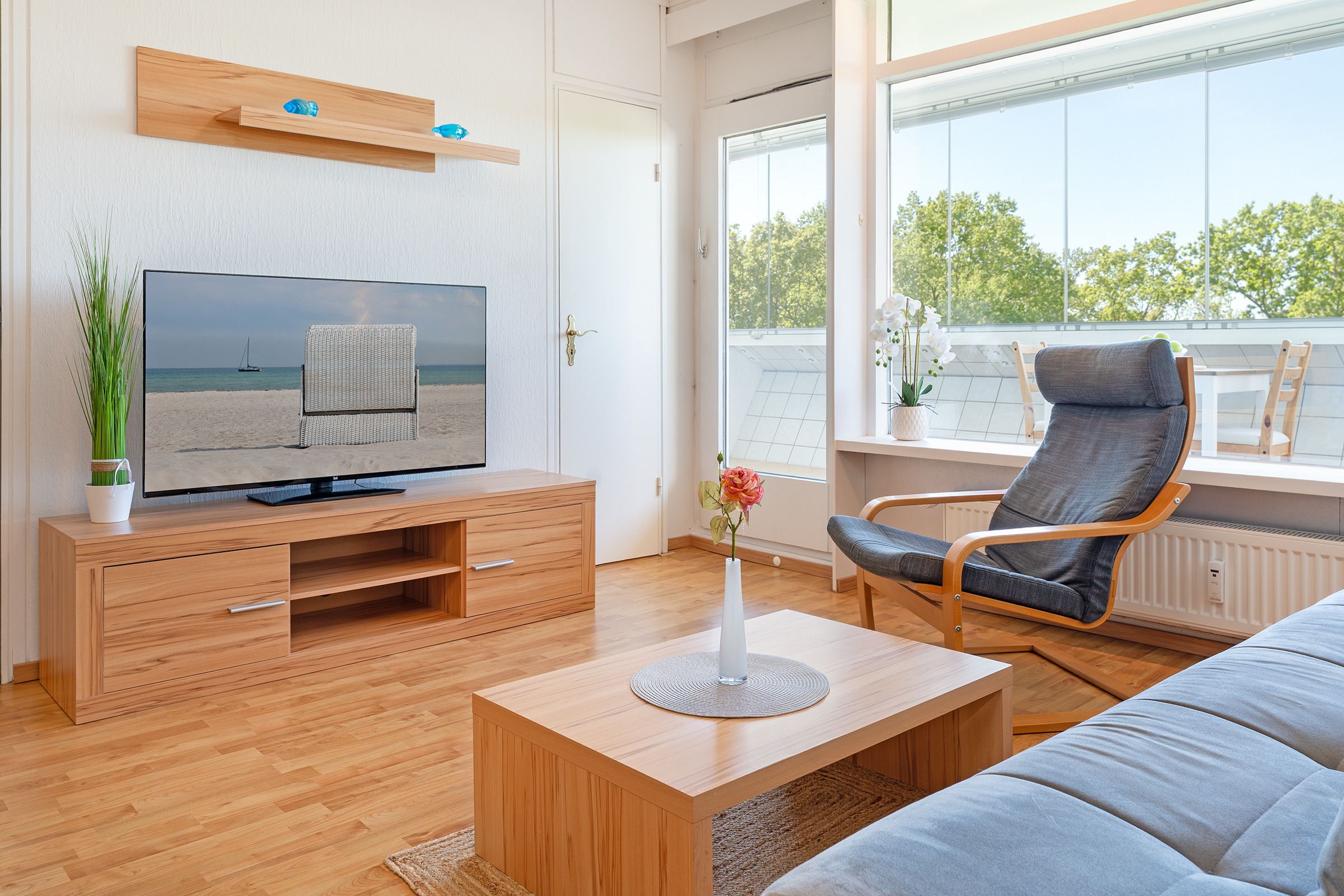 Der helle Wohnbereich ist mit komfortabler Sitzgarnitur und TV inkl. Streamingdiensten zur Selbstanmeldung ausgestattet und bietet Platz für entspannte Stunden. Vom Wohnzimmer aus gelangen Sie auf den geschlossenen, überdachten Balkon mit südwestlicher Ausrichtung – genießen Sie hier die Sonne und den Blick in die Weite. Die Fenster des Balkons lassen sich öffnen, um noch mehr frische Ostseeluft hereinzulassen. Die offene Küche ist in den Wohnbereich integriert und bietet mit Ceranfeld, Backofen, Kühlschrank, Gefriertruhe, Spülmaschine, Kaffeemaschine, Wasserkocher, Sandwichtoaster und Eierkocher eine umfassende Ausstattung. Für gemeinsame Mahlzeiten steht ein gemütlicher Essbereich bereit. Das separate Schlafzimmer ziert ein bequemes Doppelbett (160x200 cm). Eine weitere Schlafmöglichkeit befindet sich im Wohnbereich in Form eines bequemen Schlafsofas (120x200 cm). Für kleine Gäste stehen Sandkasten und Spielplatz unweit des Appartementhauses zur Verfügung. Ein Kinderreisebett ist ebenfalls bereits vorhanden. Im Badezimmer inklusive Badewanne mit Duschfunktion und Föhn können Sie sich für einen neuen Urlaubstag frisch machen.