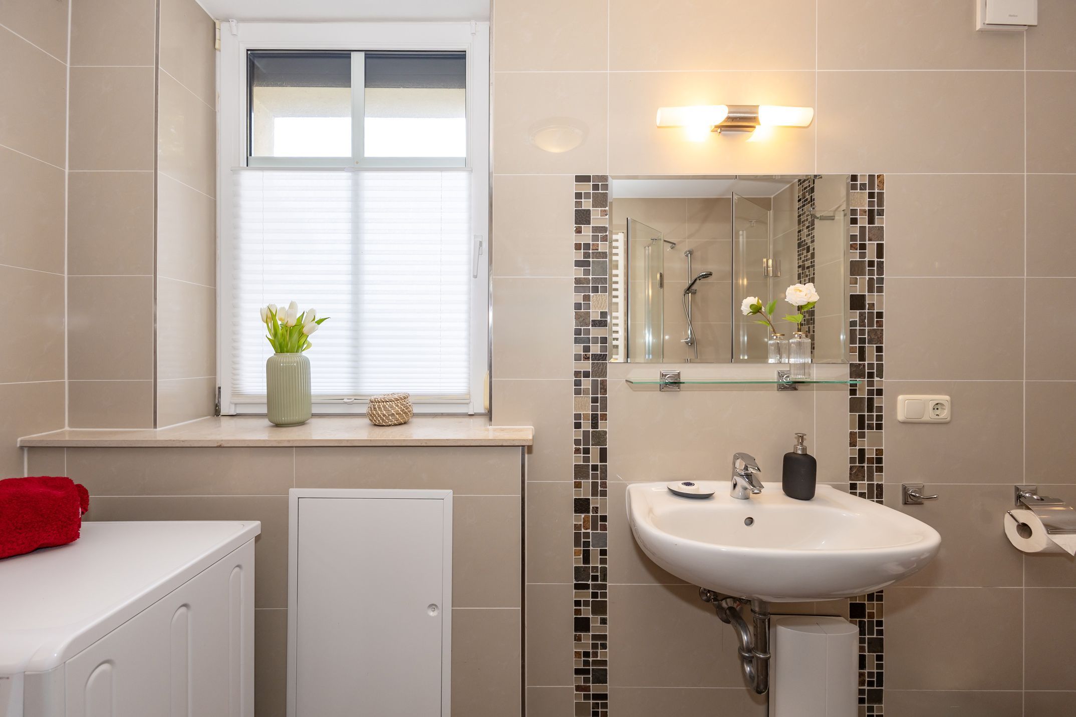 • Voll ausgestattete Küche: Mit Wasserkocher, Eierkocher, Kaffeemaschine, Toaster, Mikrowelle, Kühlschrank mit Gefrierfach, Geschirrspüler, Herd mit Cerankochfeld und Backofen.