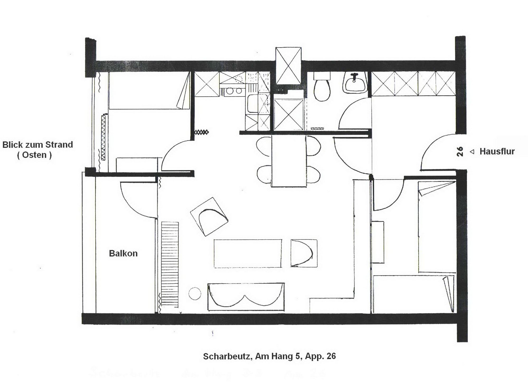 Die ca. 45m² große Wohnung liegt direkt am Strand (Hang) im 1. Stock eines Apartmenthauses mit Blick auf die Ostsee. Die Wohnung hat ein großes Wohnzimmer mit windgeschütztem Balkon, je ein Schlafzimmer mit zwei Einzelbetten und eines mit Etagenbetten, eine kleine abtrennbare Küche, ein Badezimmer mit Dusche + WC sowie einen Flur. Der herrliche Blick auf den Strand und die Lübecker Bucht ist unverbaubar. Hinter dem Haus liegt der PKW-Stellplatz, sowie der in der Hochsaison beheizbare Swimmingpool. Bettwäsche und Handtücher sind NICHT vor Ort und müssen mitgebracht werden!