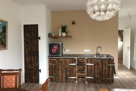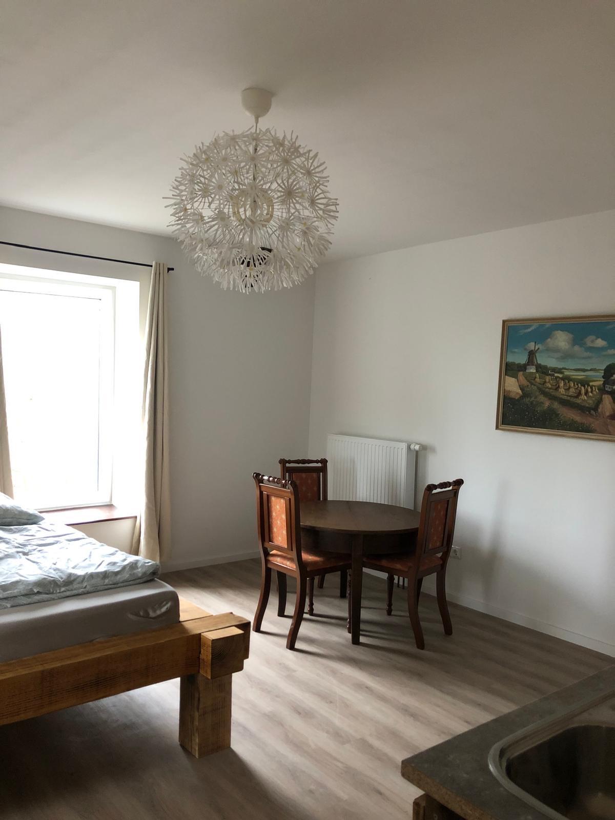 Die Ferienwohnung befindet sich in der ersten Etage unseres renovierten Bereichs im Bauernhaus und bietet modernen Komfort in ländlicher Umgebung. Sie ist ausgestattet mit einem 1,80 m breiten Doppelbett, einem Fernseher sowie einer voll eingerichteten Küchenzeile mit kleinem Kühlschrank, Kaffeemaschine, zwei Herdplatten und einem gemütlichen Essbereich. Ein großzügiges Duschbad rundet das Angebot ab und sorgt für zusätzlichen Komfort während Ihres Aufenthalts.
