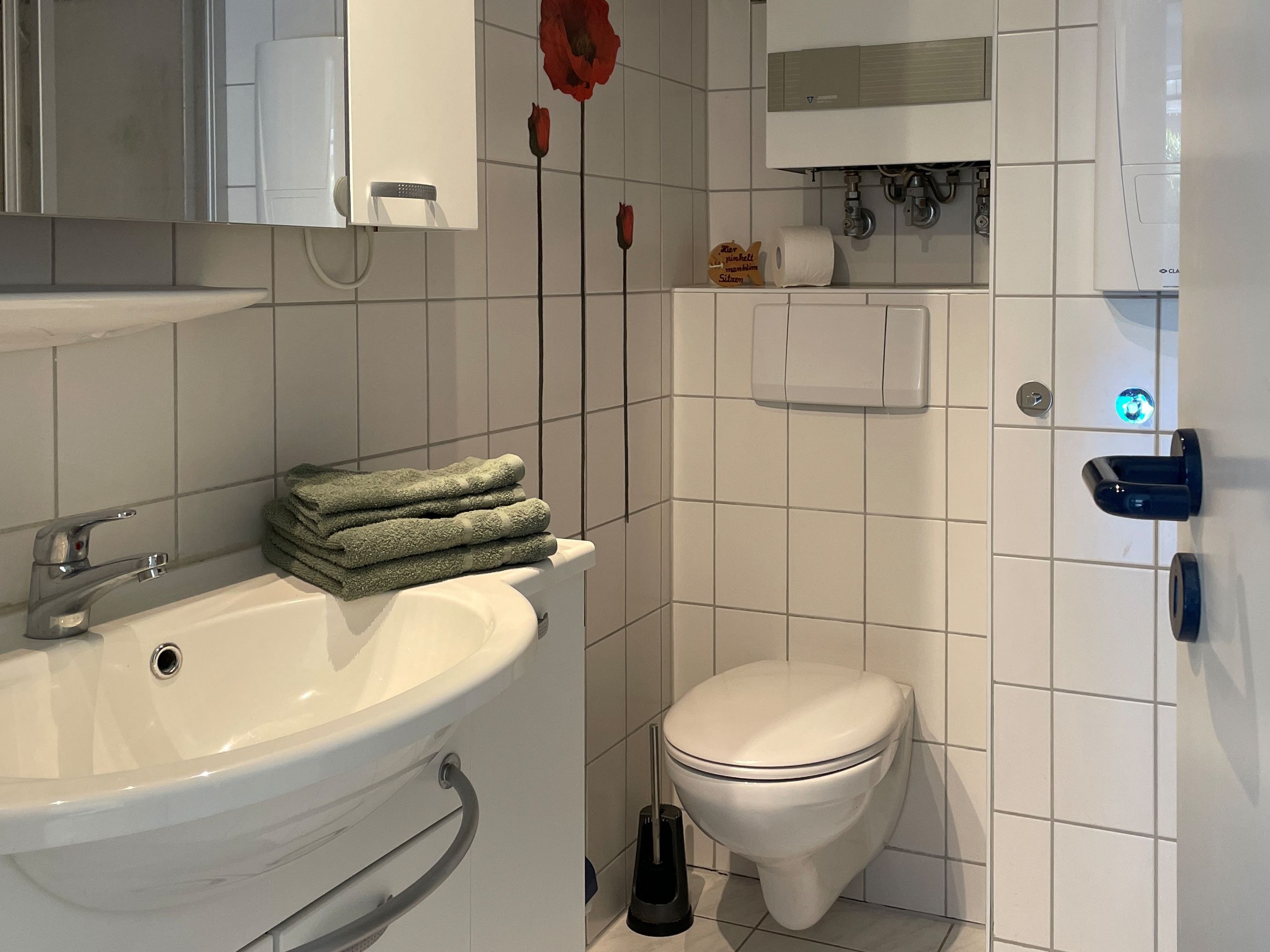 helles Bad mit Dusche (Föhn vorhanden) und mit Waschmaschine