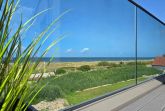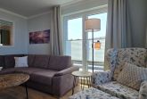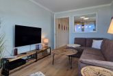 Der Wohnbereich ist lichtdurchflutet und bietet eine gemütliche Atmosphäre, in der Sie sich nach einem langen Tag am Strand entspannen können. Ein modernes Sofa und ein Relax-Sessel laden dazu ein, gemeinsame Stunden zu verbringen. Zur technischen Ausstattung gehört ein Fernseher, ein CD-Spieler sowie Radio und WLAN, damit Sie während Ihres Aufenthalts immer bestens informiert und unterhalten sind.