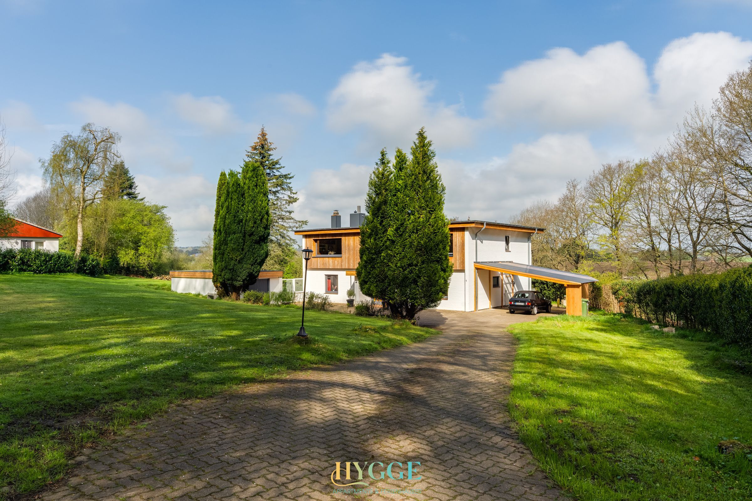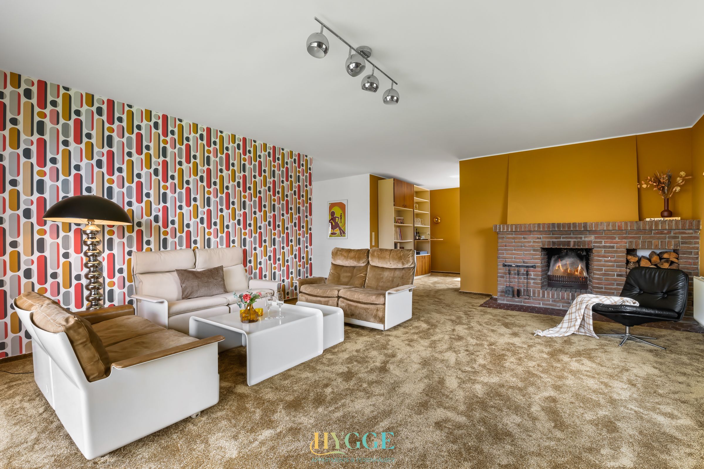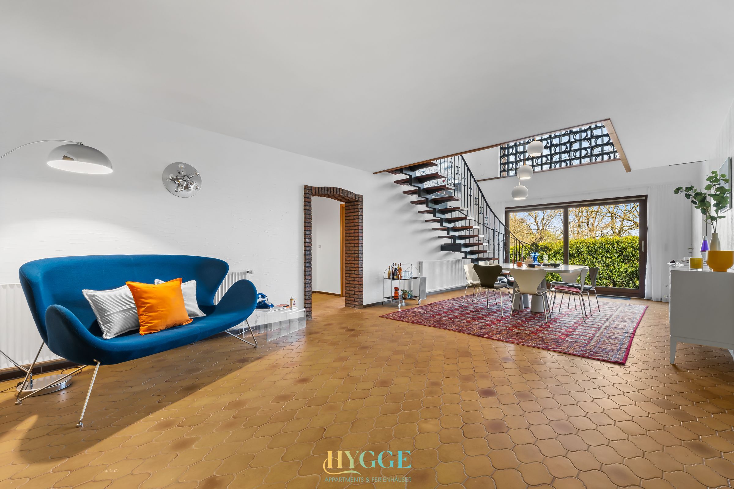 Über die große Treppen gelangen sie in den oberen Teil des 70er Jahre Bundgalow. Dort befindet sich das große Wohnzimmer mit Terrasse, Blick über die Felder und Annehmlichkeiten wie B&O Fernseher, Stereoanlage, Kamin, Ofen, Spirituosenbar und viel Platz.