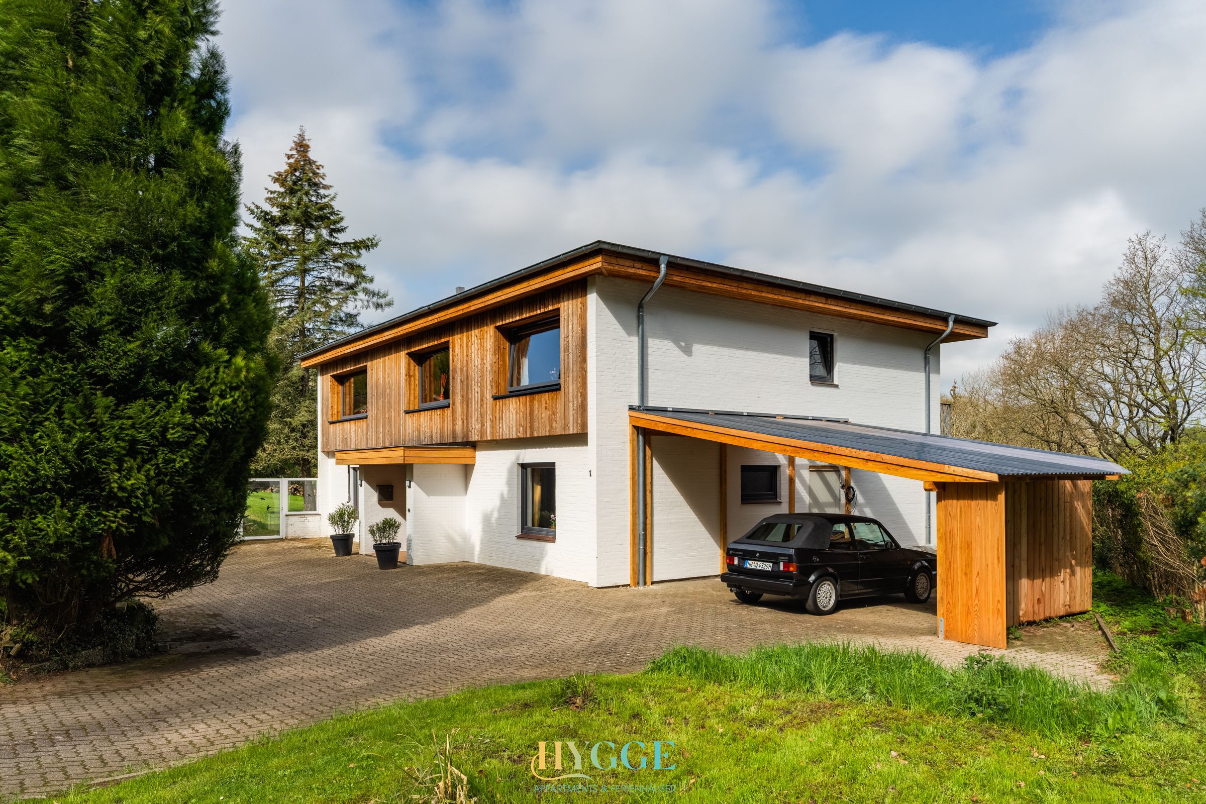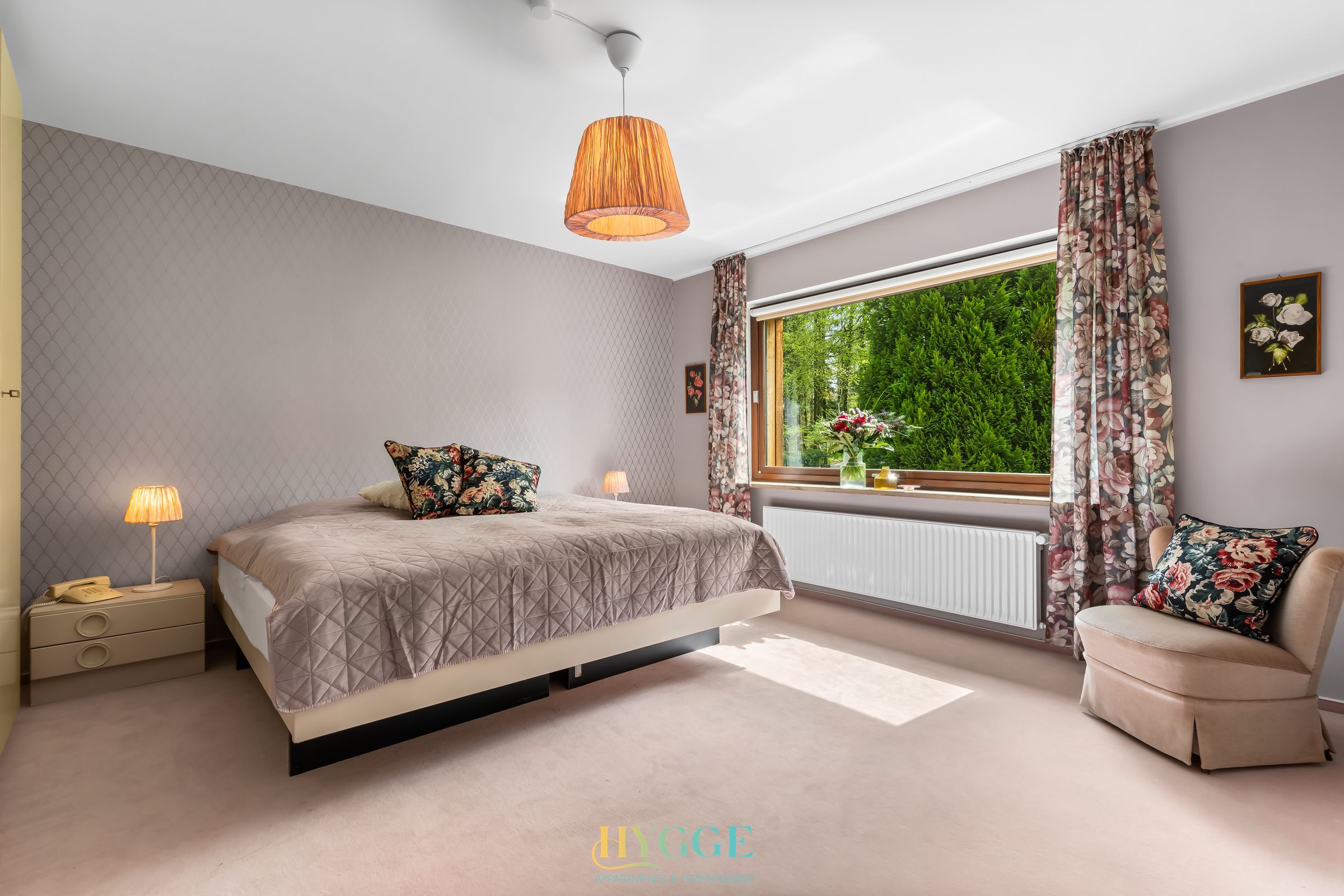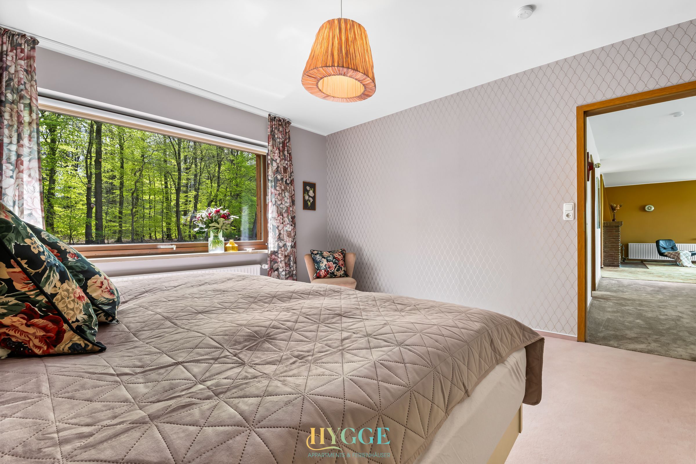 Über die große Treppen gelangen sie in den oberen Teil des 70er Jahre Bundgalow. Dort befindet sich das große Wohnzimmer mit Terrasse, Blick über die Felder und Annehmlichkeiten wie B&O Fernseher, Stereoanlage, Kamin, Ofen, Spirituosenbar und viel Platz.