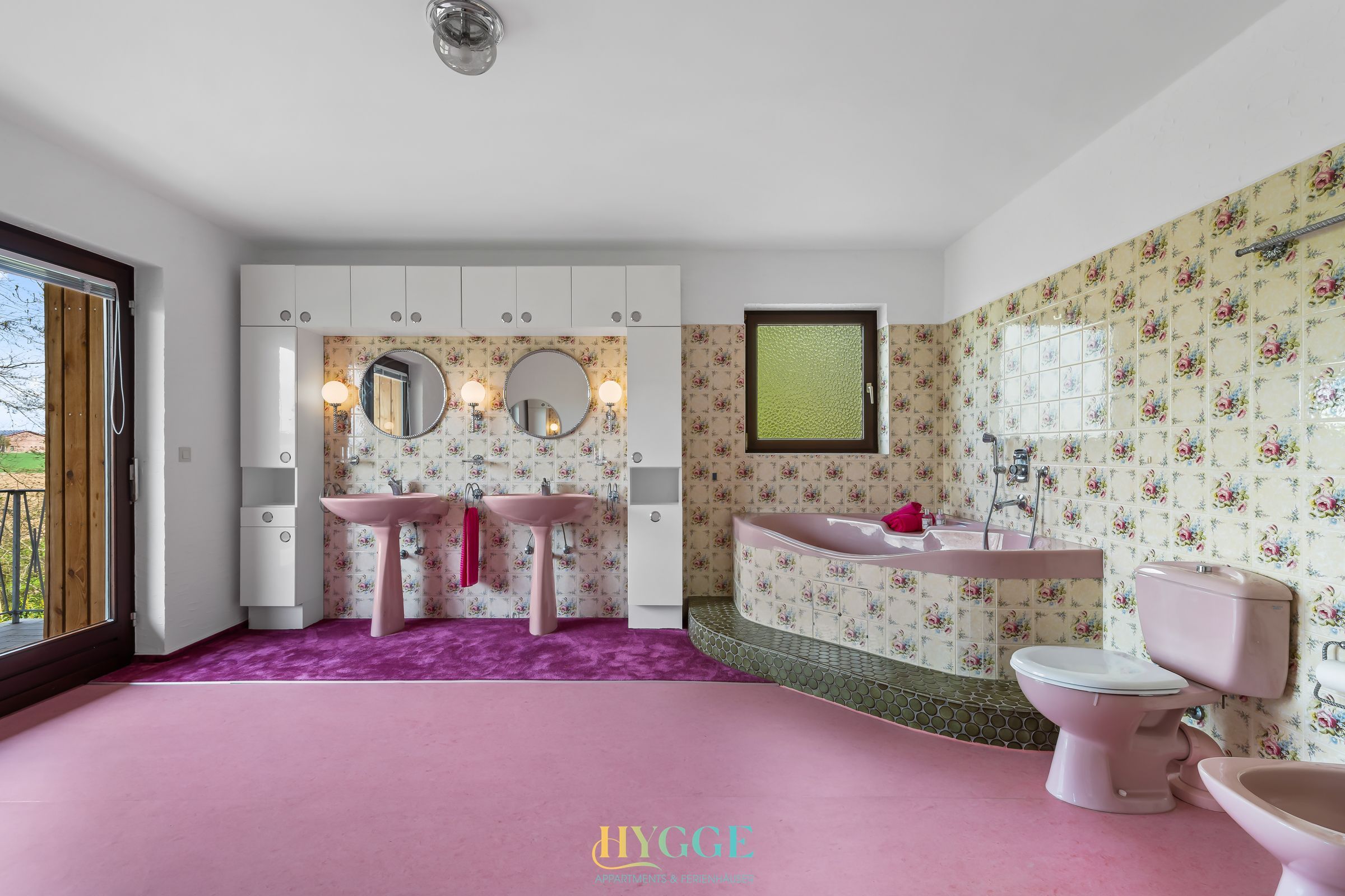 Daneben befindet sich das ABBA Zimmer mit zwei Einzelbett, sowie ein weitere Schlafzimmer im Stil der 70er Jahre. Highlight ist das große Badezimmer in Rosa mit Eckbadewann, zwei Waschbecken, BD, Toilette, Dusche und Infrarotsauna (ab Ende September 2025). Partys oder Feiern mit zusätzlichen Gästen, die nicht angemeldet wurden, sind in dem Haus untersagt und führen zur sofortigen Aufhebung des Mietvertrages. Die Kosten dafür trägt der Mieter.