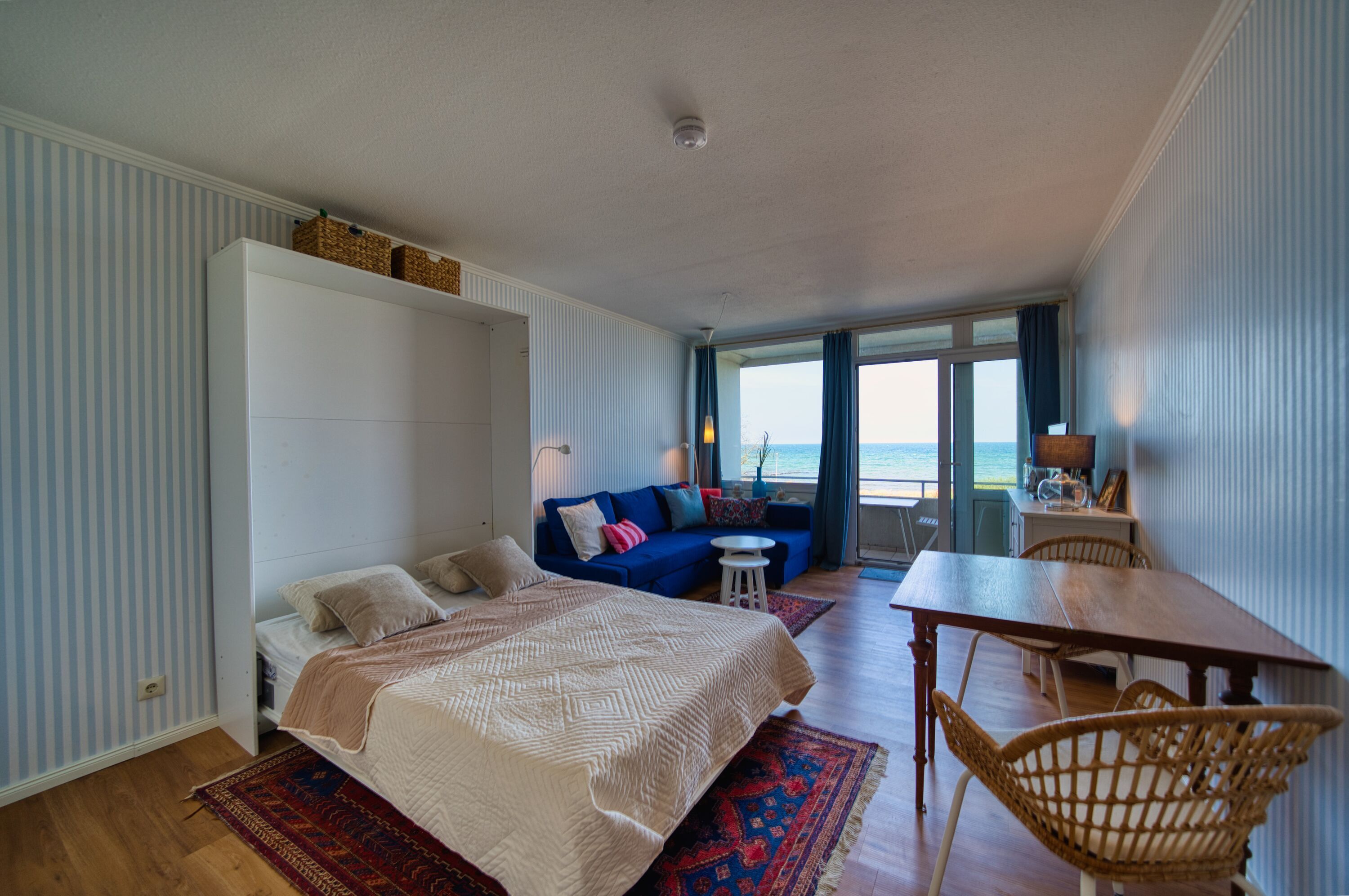 Schlafbereich: Der Wohn-Schlafraum ist mit einem praktischen Schrankbett ausgestattet, das bei Bedarf einfach ausgeklappt werden kann und für eine komfortable Nachtruhe sorgt.