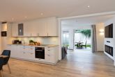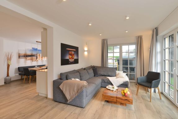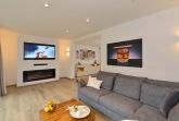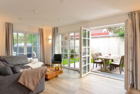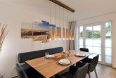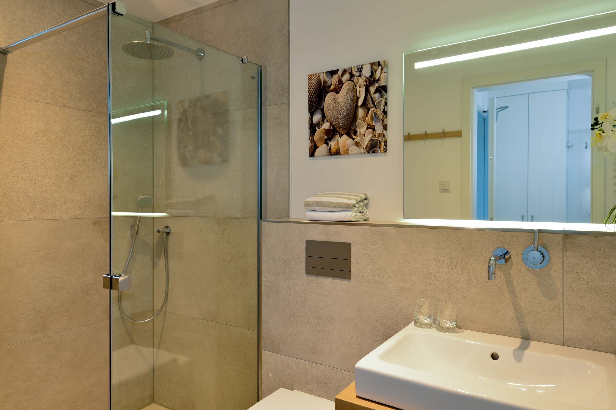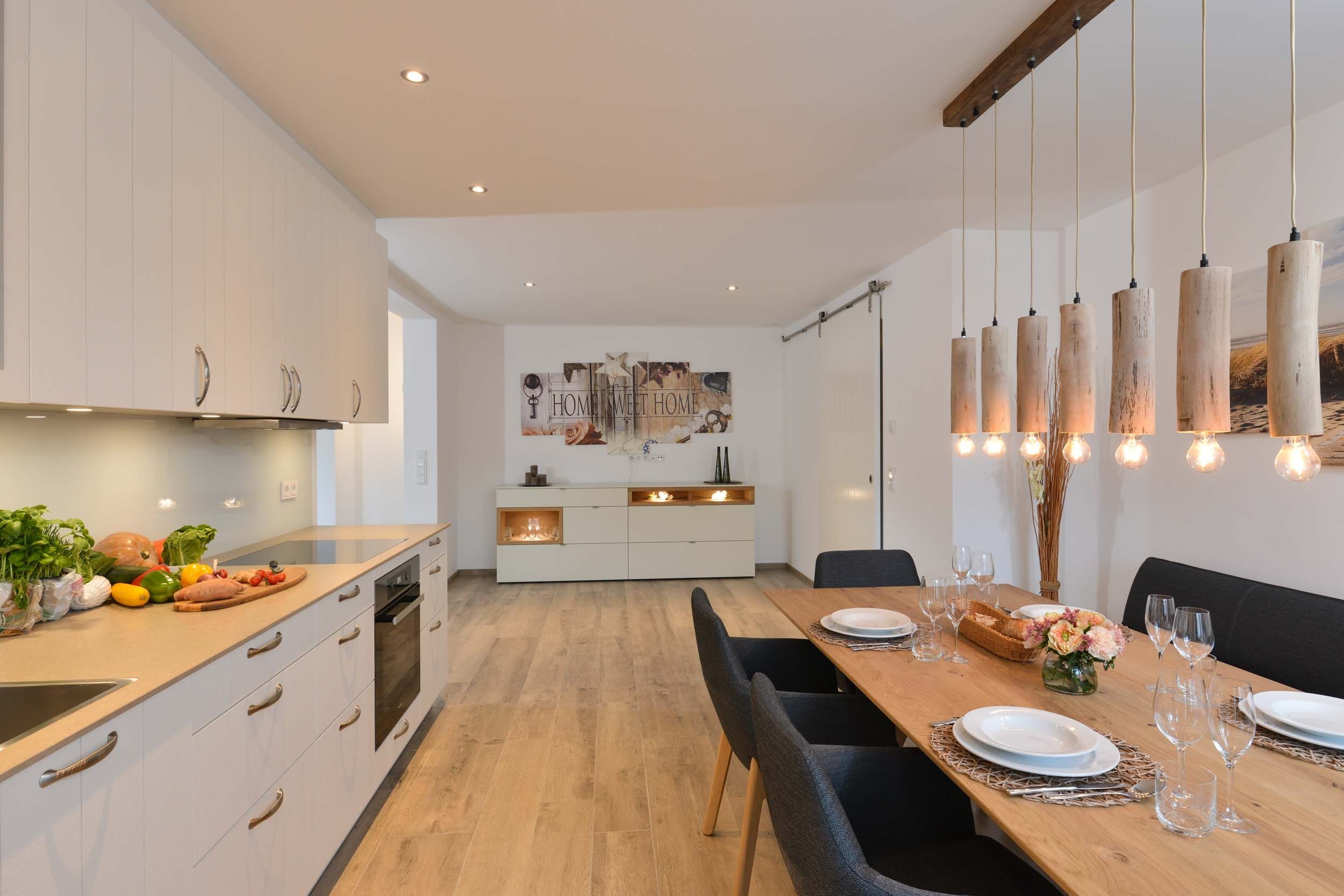 Im Erdgeschoss befindet sich eine Wohnküche, die mit hochwertiger Küchentechnik von Miele ausgestattet ist. Von hier aus gelangt man auch in den hellen Wohnbereich, der mit einem elektronischen Kamin ausgestattet ist, sowie zur Südterrasse. Ein erstes Schlafzimmer mit Morgensonne bietet zwei Boxspringbetten, die je nach Bedarf als Einzel- oder Doppelbett genutzt werden können. Zudem gibt es hier maßgefertigte Einbauschränke und einen Fernseher. Ein Duschbad komplettiert das Erdgeschoss.