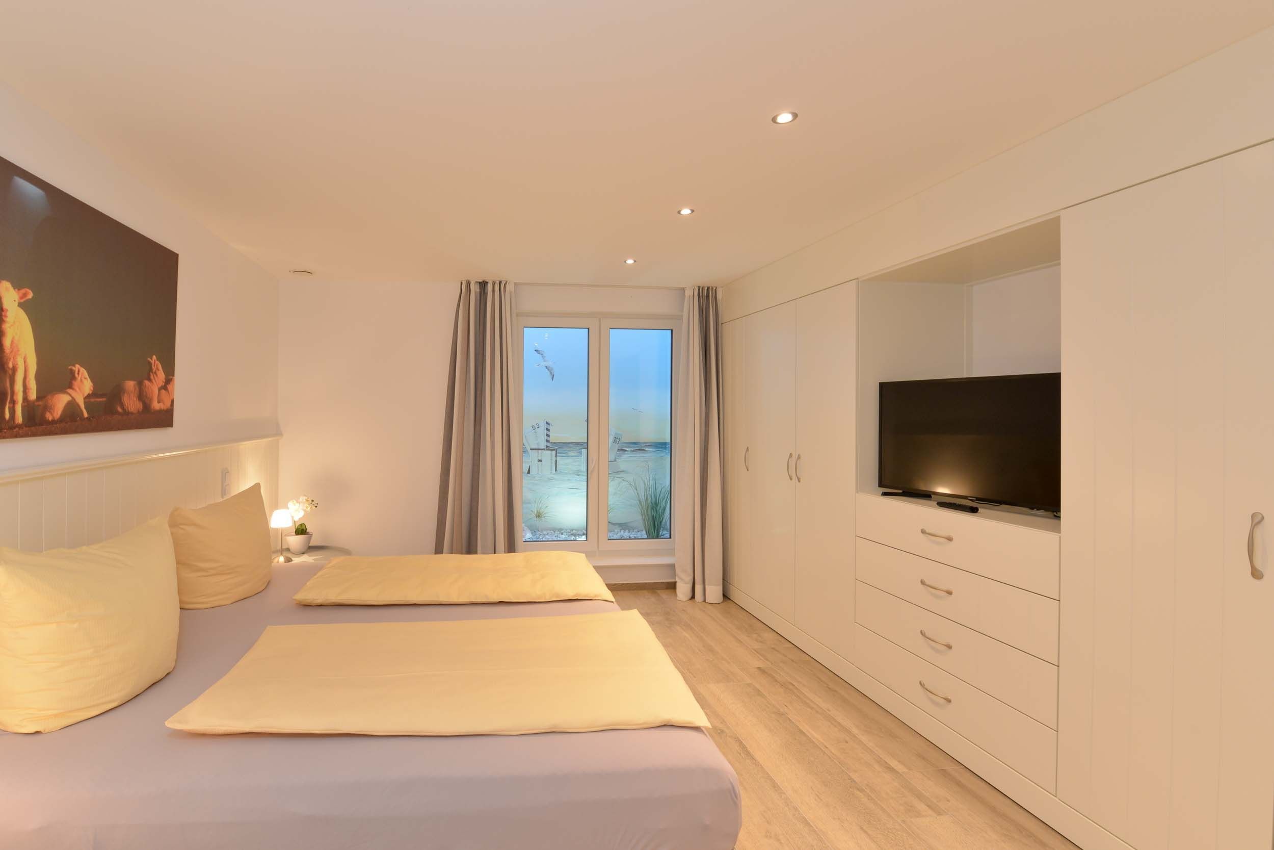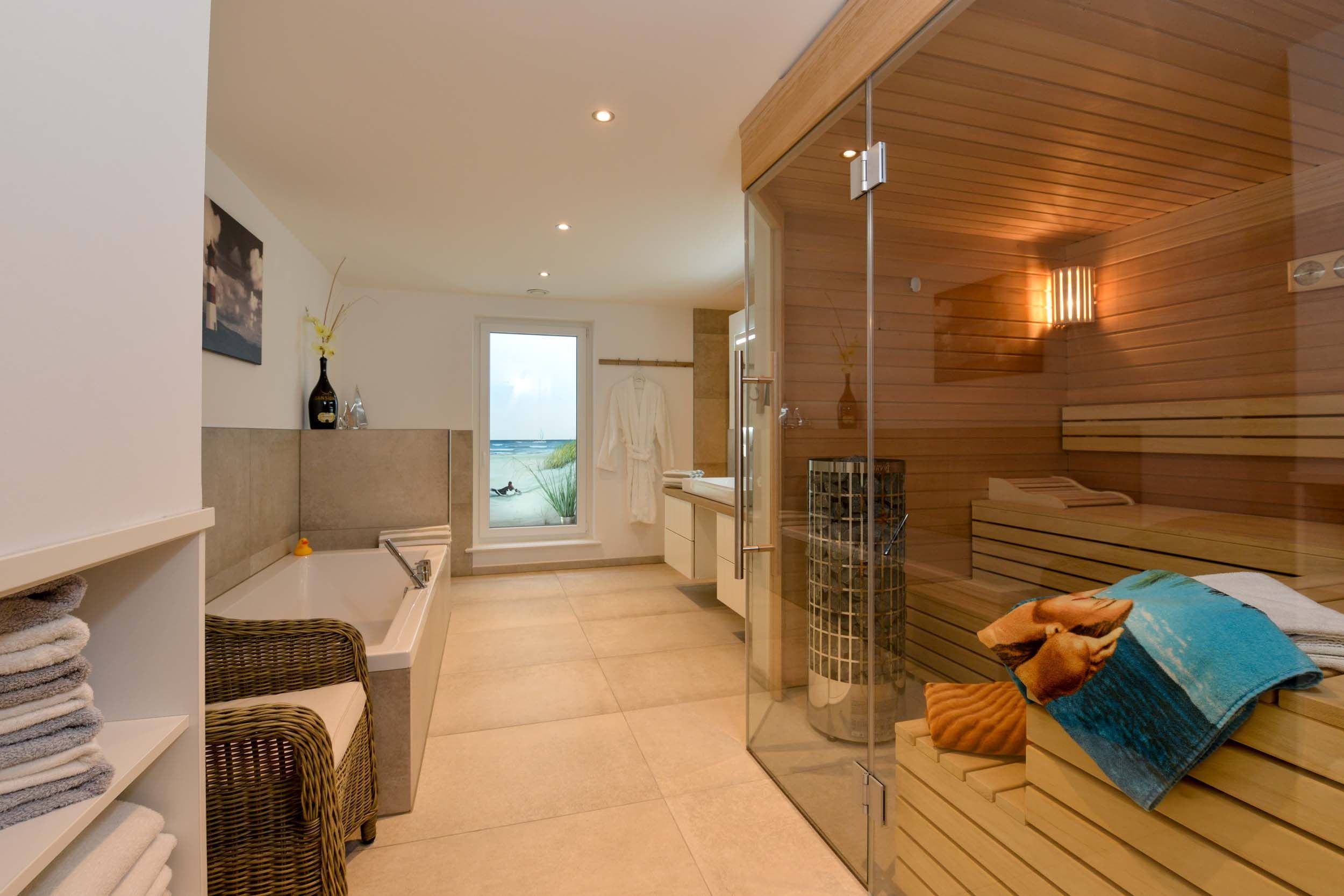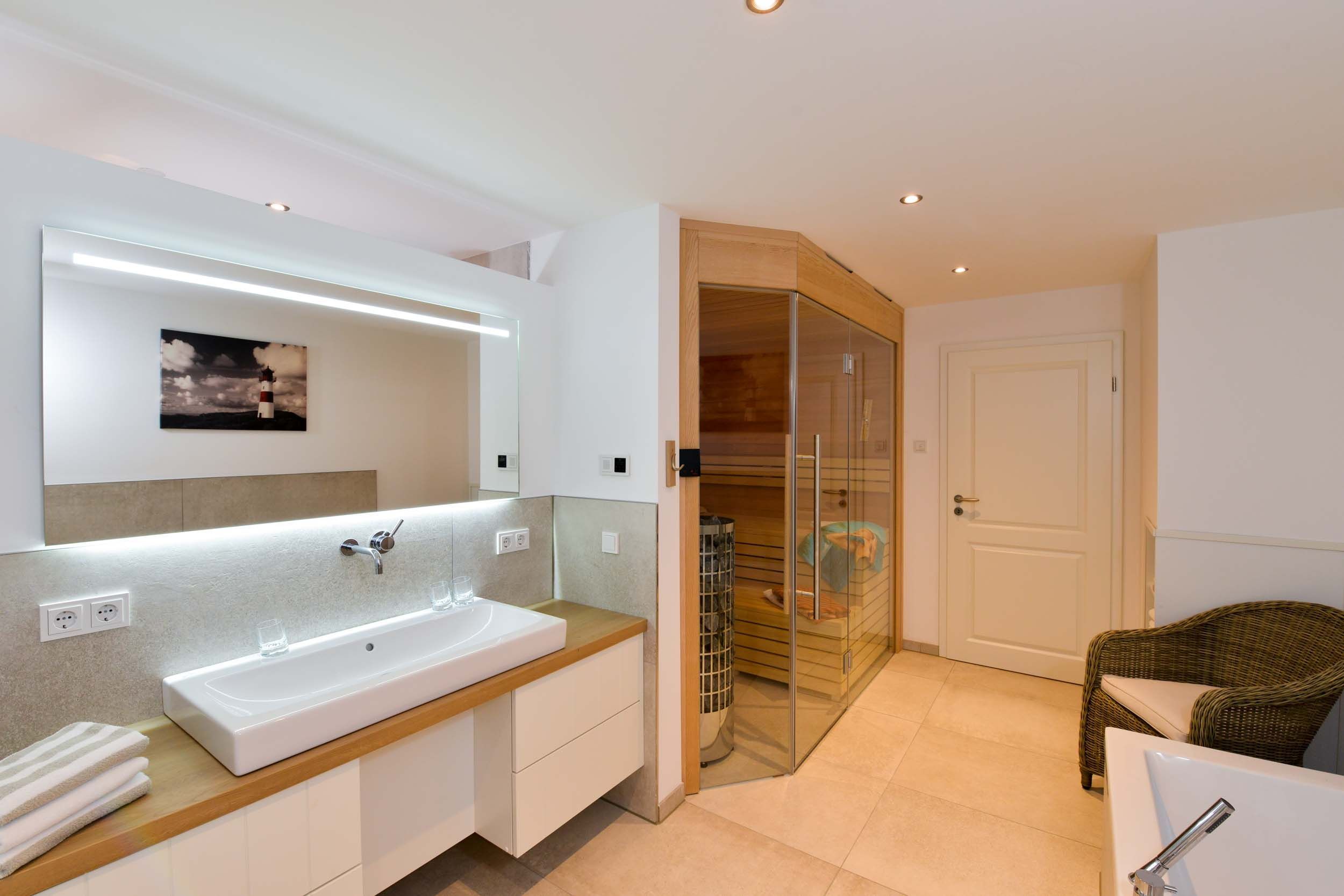 Im Untergeschoss befindet sich ein weiterer großer Schlafraum mit Boxspringbetten der Größe 200x200, maßgefertigten Einbauschränken, einem Fernseher und bodentiefen Fensterelementen. Außerdem gibt es ein drittes Schlafzimmer mit Boxspringbetten der Größe 180x200, einem maßgefertigten Einbauschrank und einem Fernseher. Der hauseigene Wellnessbereich mit einer Regendusche, einer Badewanne, einem extrabreiten Waschtisch, einem Radio, einer Toilette und einer Sauna trägt zur Entspannung im Urlaub bei.