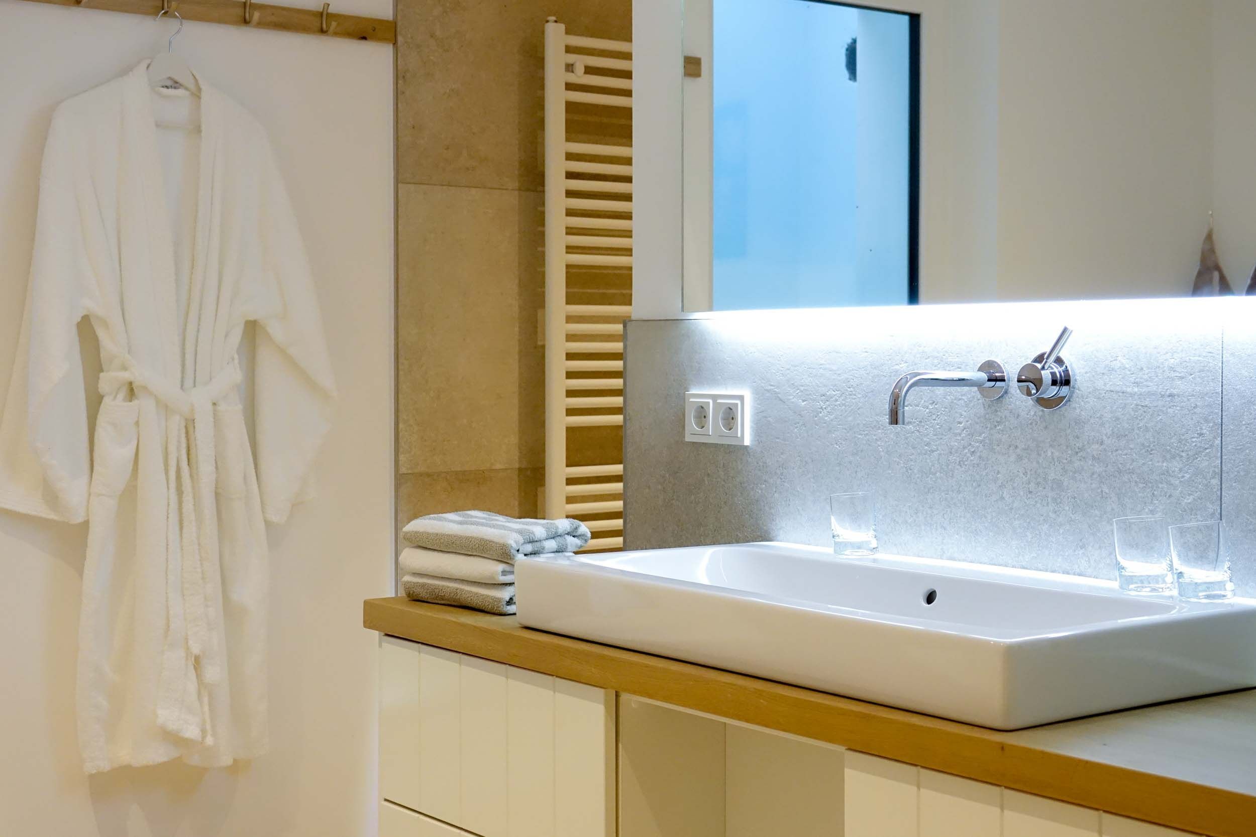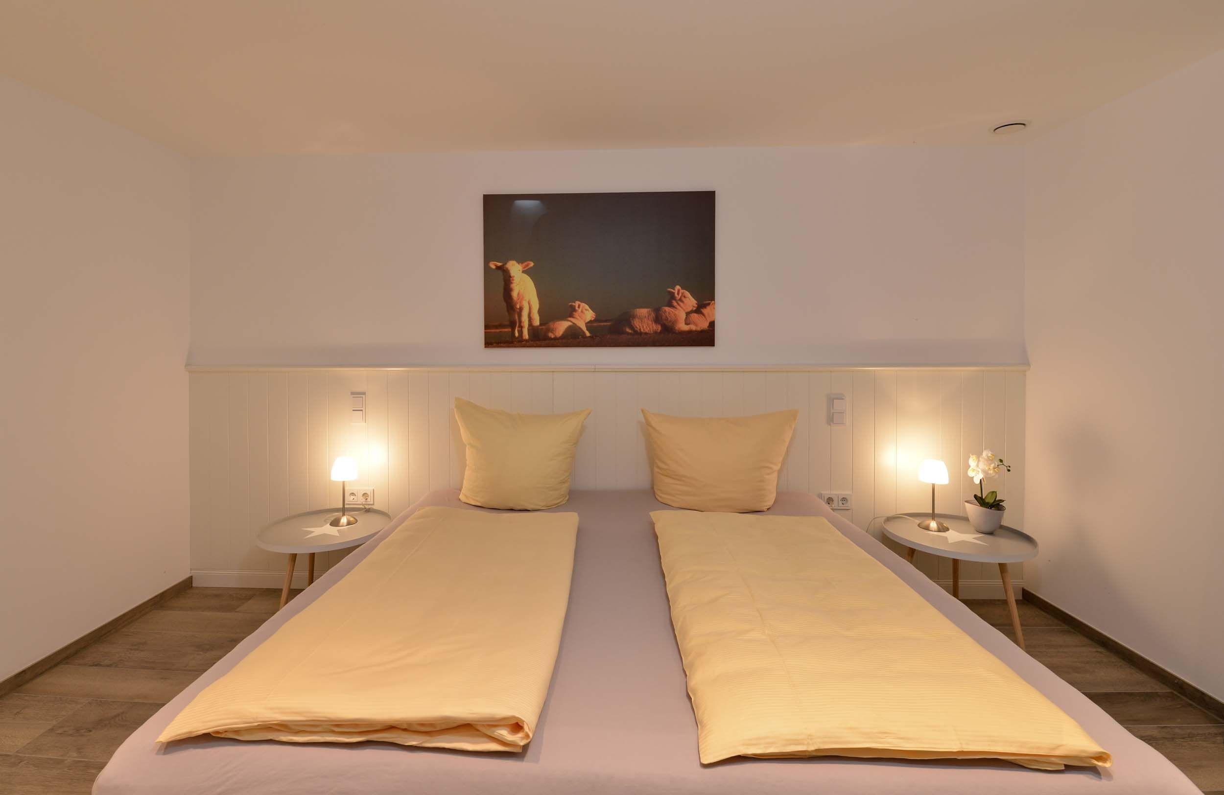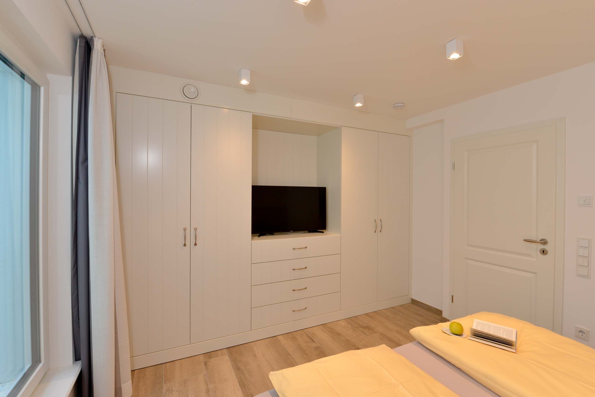Im Untergeschoss befindet sich ein weiterer großer Schlafraum mit Boxspringbetten der Größe 200x200, maßgefertigten Einbauschränken, einem Fernseher und bodentiefen Fensterelementen. Außerdem gibt es ein drittes Schlafzimmer mit Boxspringbetten der Größe 180x200, einem maßgefertigten Einbauschrank und einem Fernseher. Der hauseigene Wellnessbereich mit einer Regendusche, einer Badewanne, einem extrabreiten Waschtisch, einem Radio, einer Toilette und einer Sauna trägt zur Entspannung im Urlaub bei.