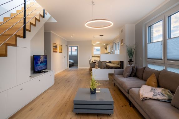 Unser Penthouse bietet Ihnen Platz für bis zu 4 Personen. Alle Räume sind gefliest z.T. in warmer Holzoptik. 2 Schlafzimmer mit Boxspringbetten 180×200, jeweils mit Einbauschrank, Kommode und TV ausgestattet, lassen Sich durch elektr. Rollläden auch perfekt verdunkeln. Zusätzlich zu 2 Duschbädern, steht ein separates Gäste-WC zur Verfügung. Der Wohn-Essbereich wurde mit einer interessanten Küche zum Familienmittelpunkt gestaltet! Auf der großzügigen Terrasse lässt sich das Freiluftfrühstück oder der Sundowner gut genießen.