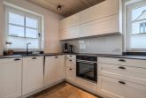 Die moderne Küche im Erdgeschoss fügt sich sehr gut in das insgesamt offene Wohnkonzept dieses Hauses ein. Der gesamte Wohn- und Esszimmerbereich liegt in praktischer Nähe zur Küche und fokussiert zugleich den Lebensmittelpunkt des Hauses. Neben der Garderobe im Eingangsbereich befindet sich auf gleicher Ebene auch ein modernes Gäste-WC. Eine moderner Treppenaufgang führt aus dem offenen Wohn- und Esszimmer ins geräumige Obergeschoss.
