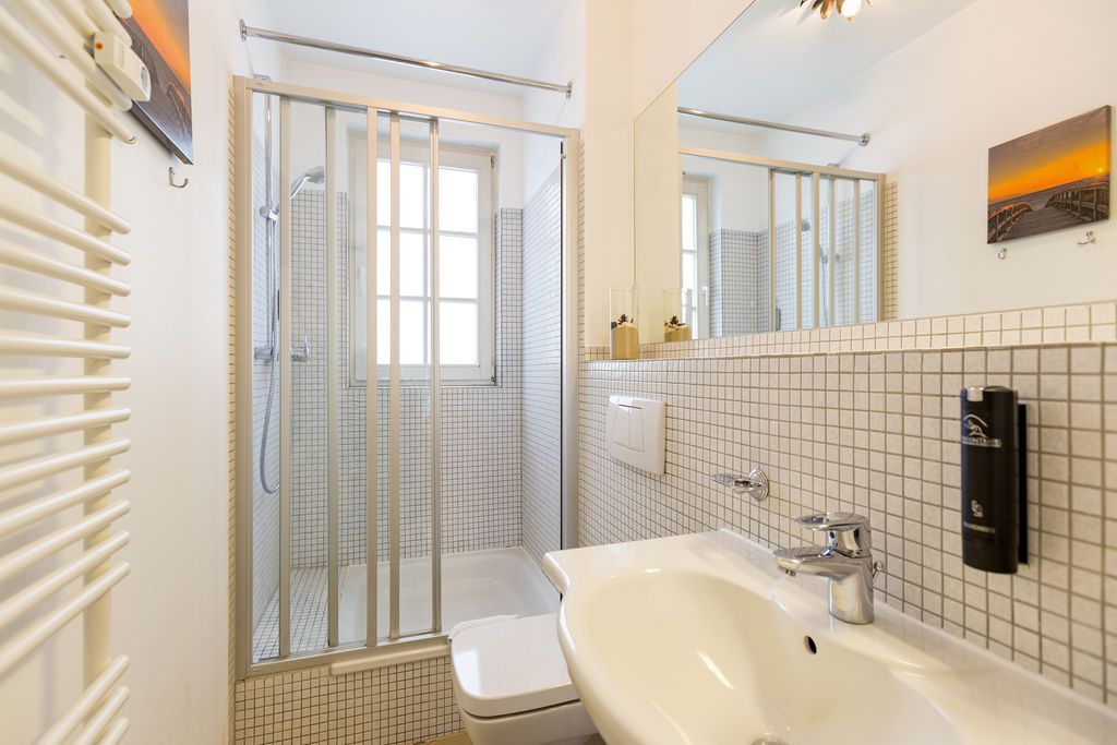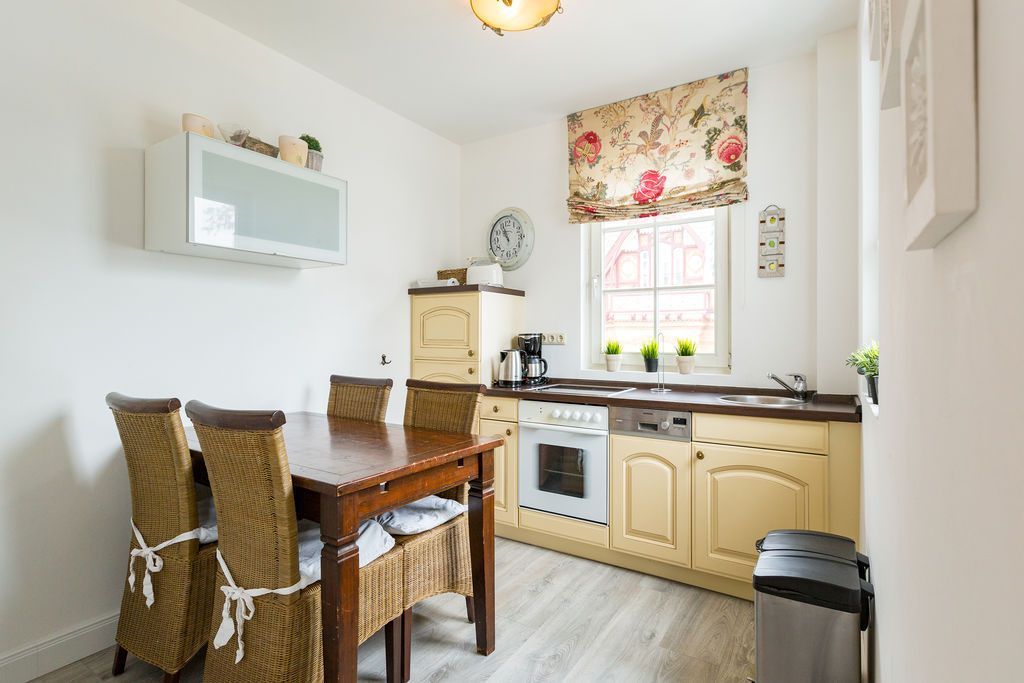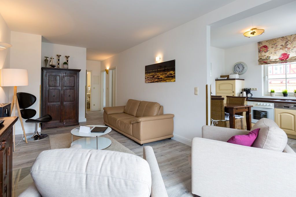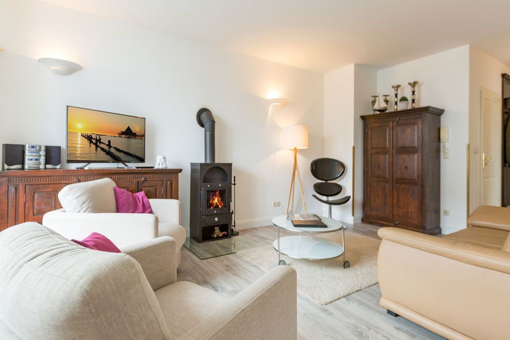 3-Raum-Ferienwohnung 60 qm im 1.Obergeschoss; Wohnzimmer mit Kamin, offene, komplett ausgestattete Küche mit Essplatz, 2 Schlafzimmer mit Doppelbetten ( Erstausstattung Wäsche ist bei Anreise bezogen), Bad mit Dusche und WC, 2 Balkone, PKW-Stellplatz