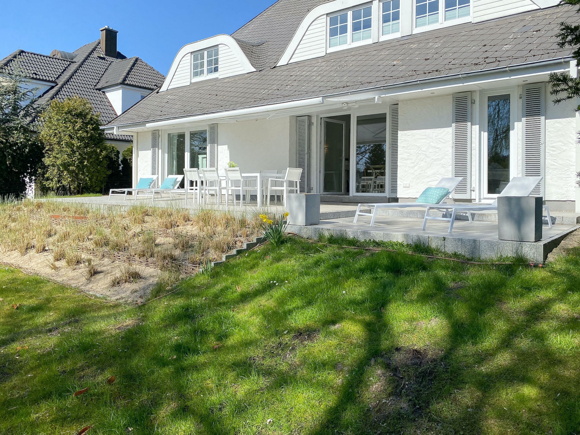 Das exklusive Ferienhaus bietet auf 220 qm Wohnfläche ein herrliches Ambiente mit Strandflair, um einen entspannten Urlaub zu verleben. Die erstklassige Ausstattung und die hochwertige Einrichtung des Objektes versprechen höchsten Wohnkomfort. Die 60 qm große Terrasse, ausgestattet mit einer elektrischen Markise, Gartenmöbeln und Sonnenliegen, erstreckt sich über die gesamte Südseite des Hauses und bietet einen wunderschönen Blick in den Garten. Im Erdgeschoss erwartet Sie ein äußerst großzügiger Wohnbereich mit gemütlichem XXL Sofa, ein durch einen Raumteiler getrennter Essbereich mit ausreichend Platz für 8 Personen sowie ein Schlafzimmer, ausgestattet mit einem Boxspringbett (180x200), Kleiderschrank TV und elektrischen Außenjalousien. Die bestens ausgestattete Küche lässt garantiert keine Wünsche offen. Sie verfügt neben hochwertigen Markengeräten, wie Gaggenau Dampfgarer und Backofen, über einen weiteren Essbereich für 4 Personen. Im anschließenden Abstellraum ist reichlich Platz für Vorräte und ein zweiter Kühl-/Gefrierschrank untergebracht. Im Eingangsbereich befindet sich ein eingebauter Garderobenschrank mit reichlich Stauraum. Ein Gäste WC und ein separater Raum mit Waschmaschine und Trockner sind ebenfalls im Erdgeschoss untergebracht. Alle Fenster im EG verfügen über elektrische Außenjalousien. Im Obergeschoss befindet sich als Rückzugsort ein zweites kleines Wohnzimmer mit einem Sofa und TV. Außerdem gibt es im Obergeschoss 3 separate Schlafzimmer mit Boxspringbetten (2 mal 180x200 und 1 mal 160x200/TV), Verdunkelungsplissees und Kleiderschränken und 2 exklusive Bäder mit Walk In Duschen und einer Badewanne.
