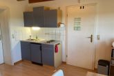 Eine komplett eingerichtete Küchenzeile mit Essecke.