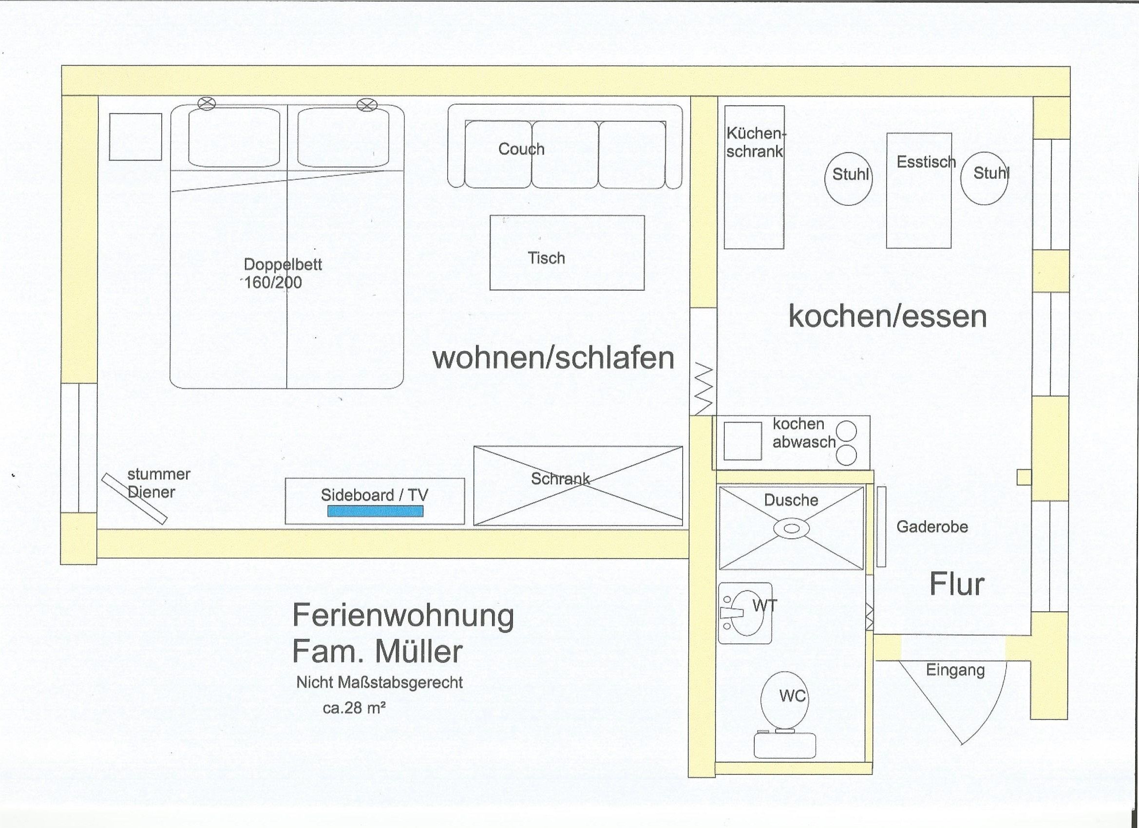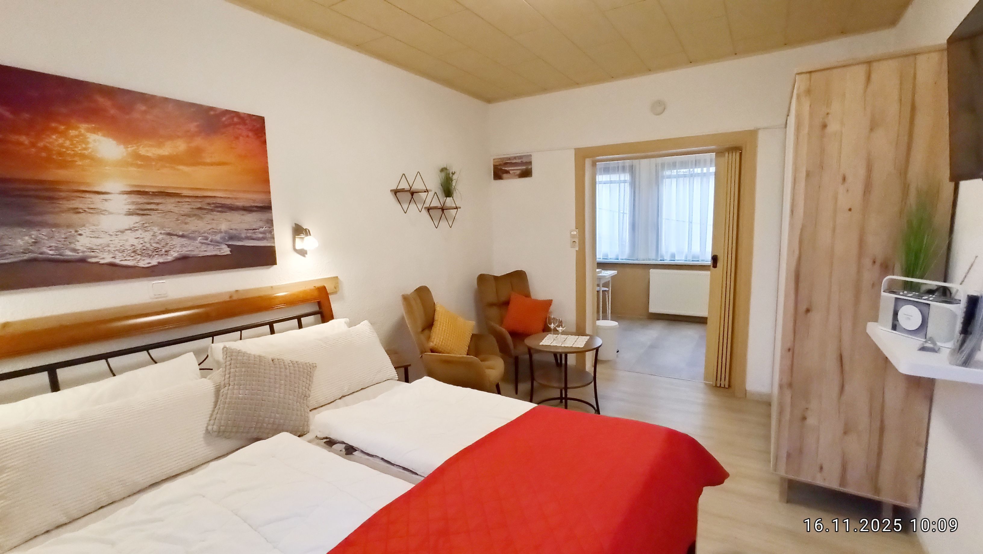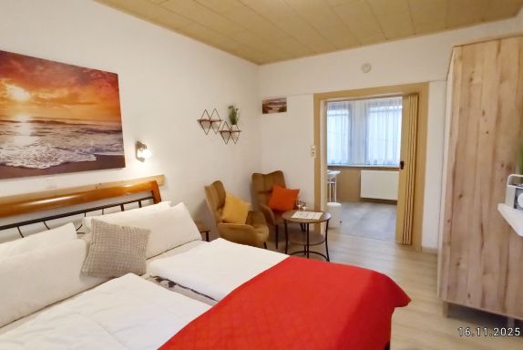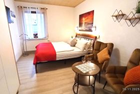 Die Ferienwohnung verfügt über ein Wohn-/ Schlafzimmer und ist ausgestattet mit einem Doppelbett,(160x200 ) Leselampen über den Betten, 2 Sessel und Tisch, Kleiderschrank, TV-Flachbildschirm. Internet-Zugang. Außenjalousie