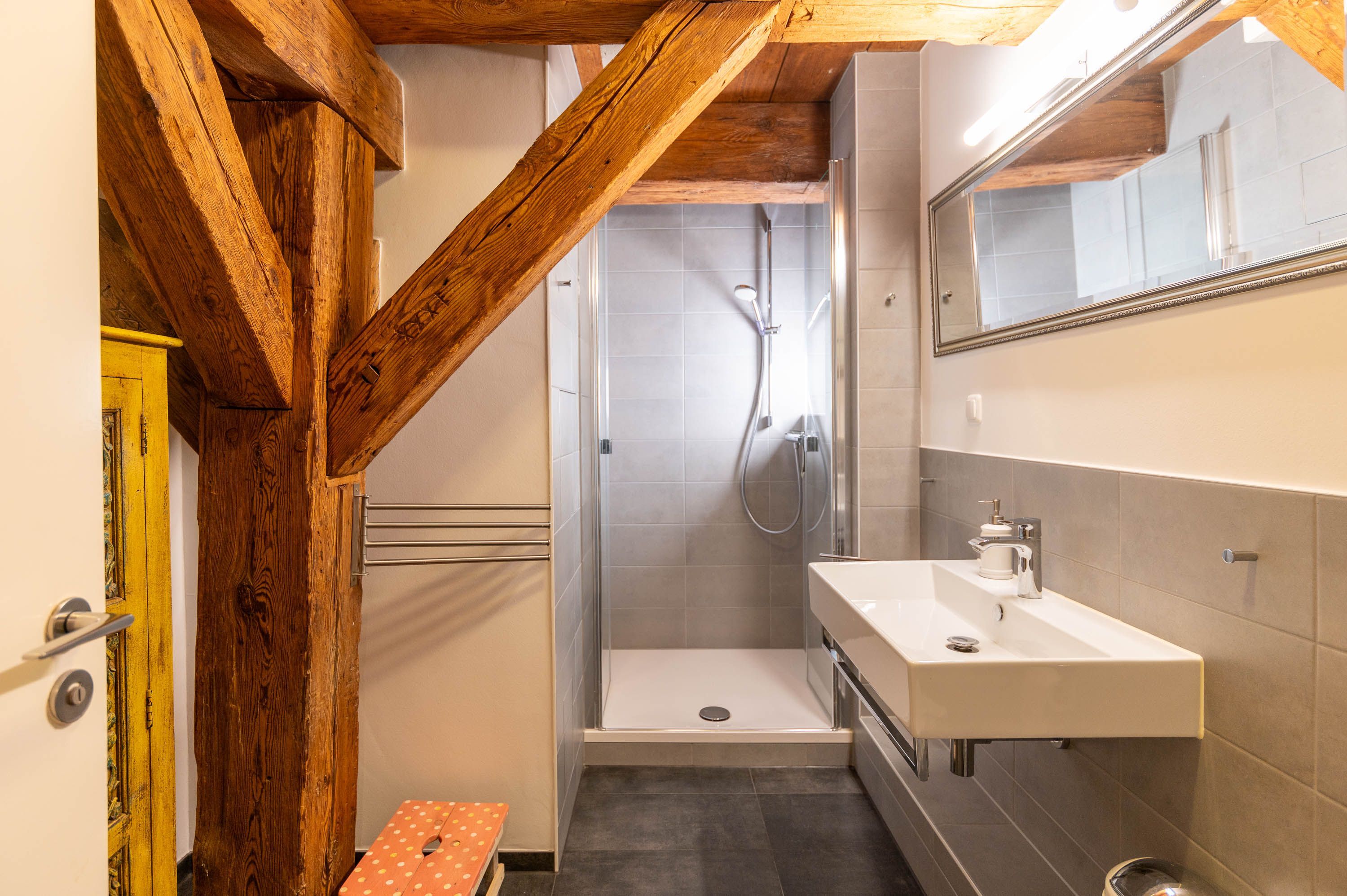 Im zweiten Zimmer befindet sich der Schlafbereich. Hier steht Ihnen ein 1,80m Doppelbett sowie ein großer Kleiderschrank während Ihres Aufenthalts zur Verfügung. Die gesamte Ferienwohnung ist mit Steinfliesen ausgelegt. Das innenliegende Badezimmer ist mit einem WC, Waschbecken und einer geräumigen Dusche ausgestattet.