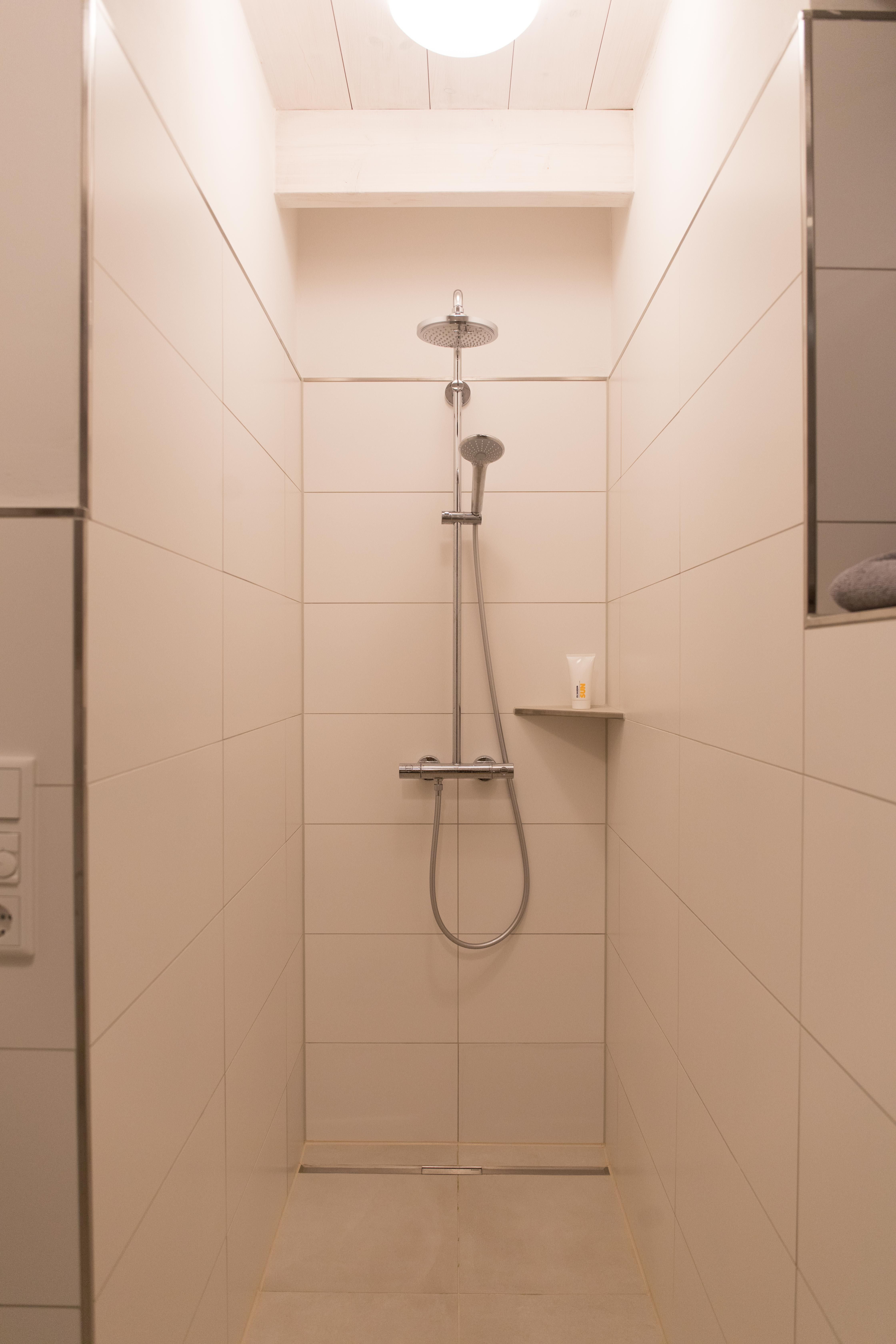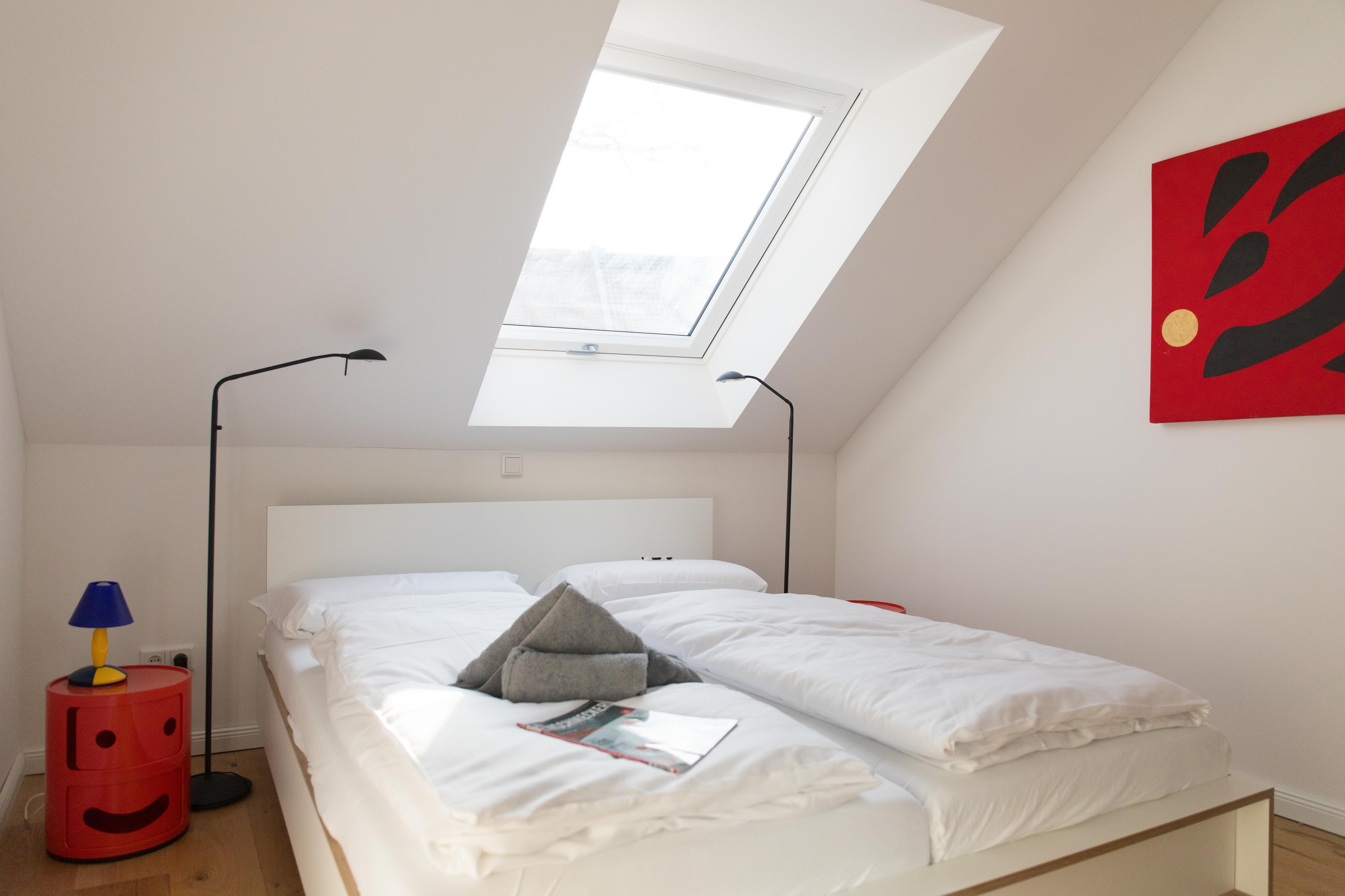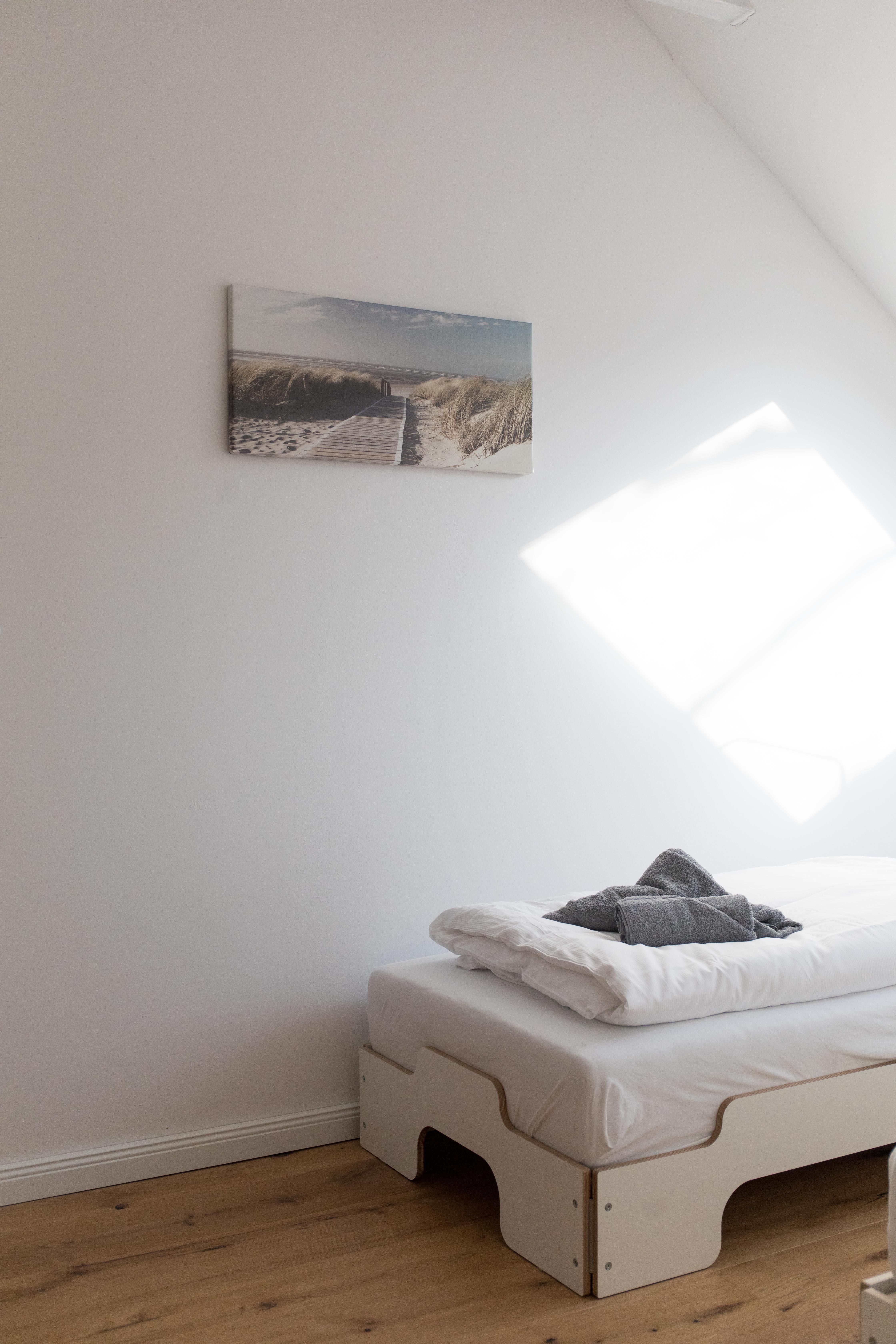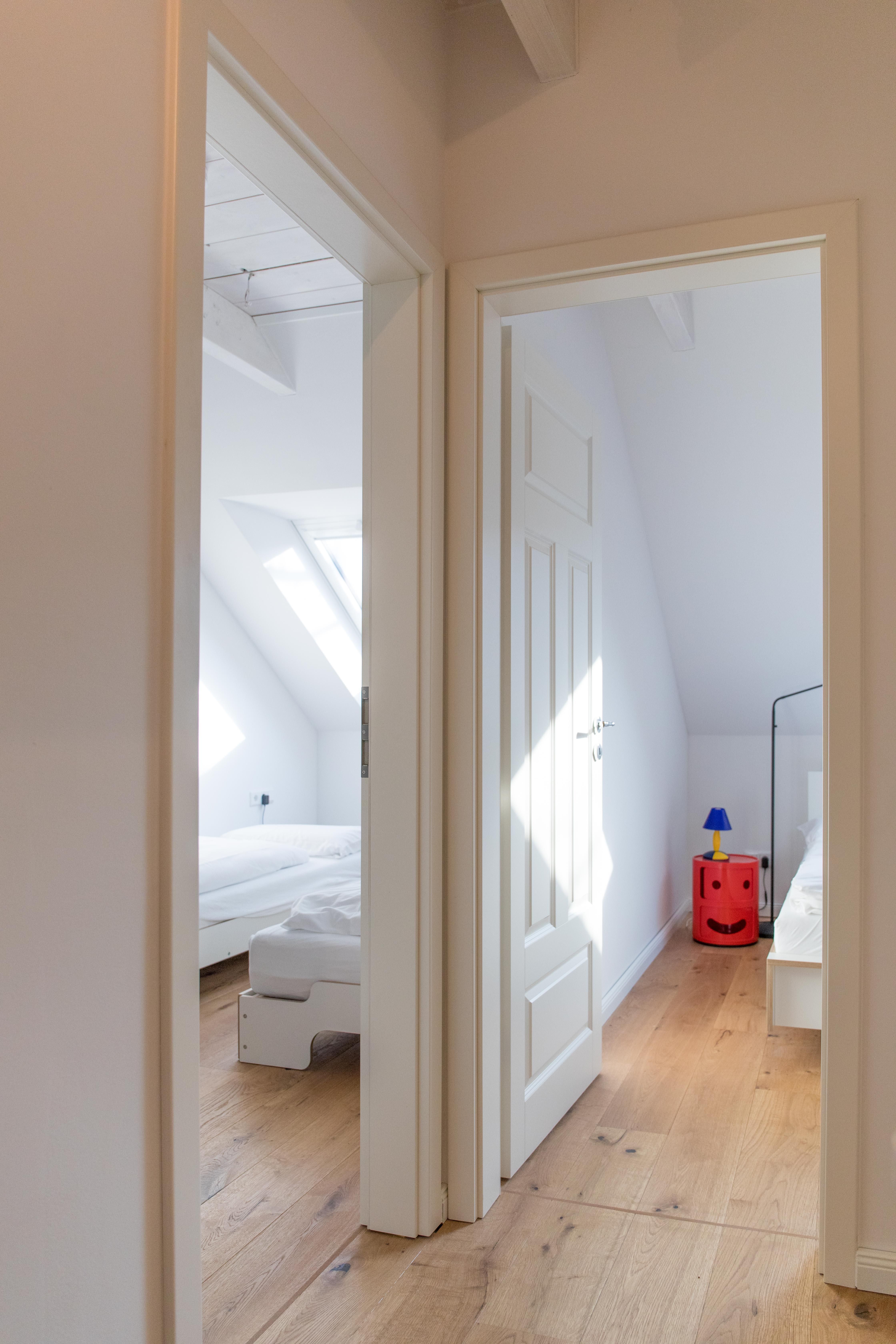 Im Dachgeschoss befinden sich 2 Schlafzimmer mit 1 Doppelbett und 2 Einzelbetten, 1 Kleiderständer und 1 Kleiderschrank im Flur. In beiden Schlafzimmern können die Fenster verdunkelt werden, Insektenschutzrollos bewahrt Sie vor lästigen Besuchern. Ein Kinderschutzgitter zur Treppe schützt Ihre Kleinen. Das Bad verfügt über eine bodengleiche Dusche, Haartrockner und Kosmetikspiegel.
