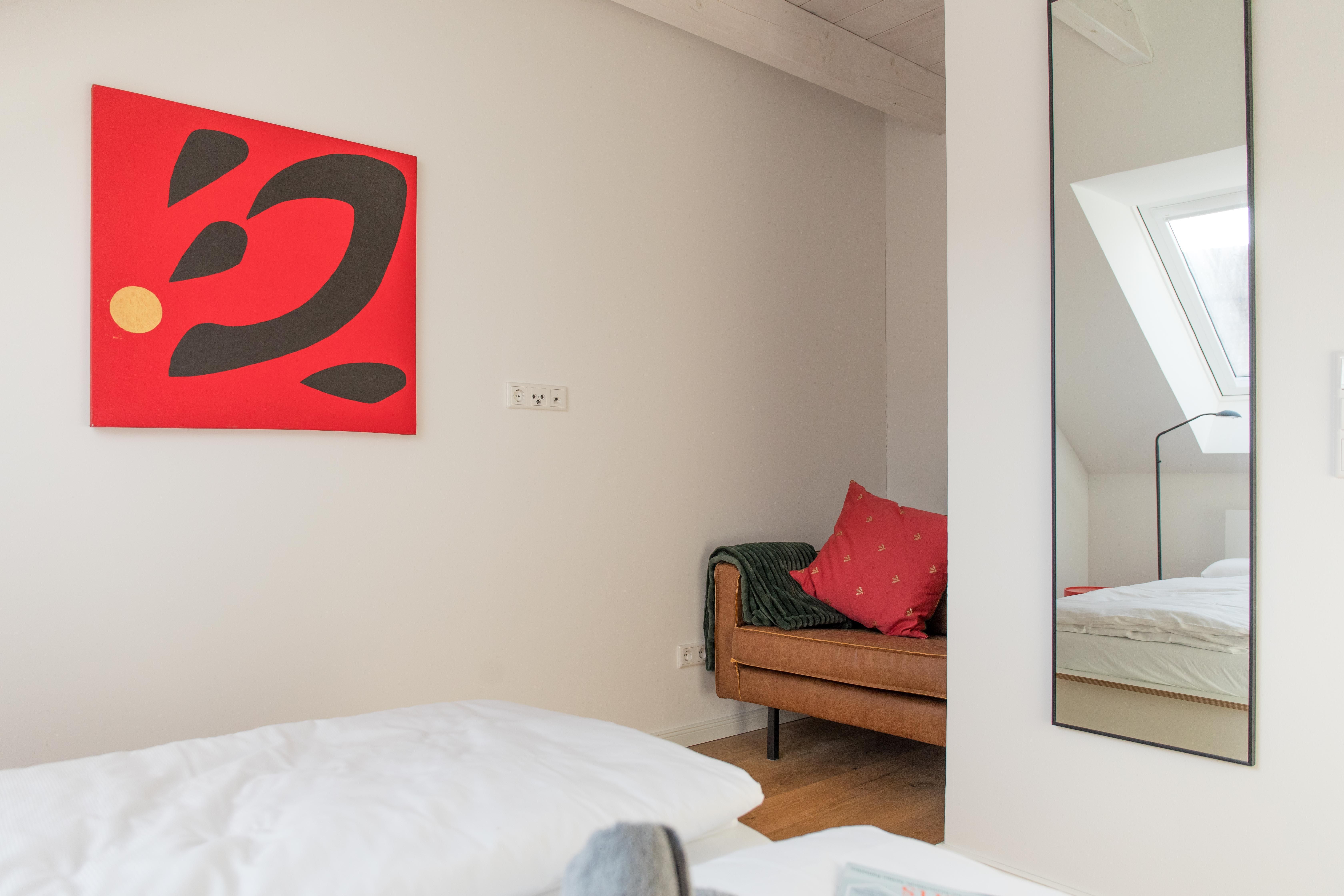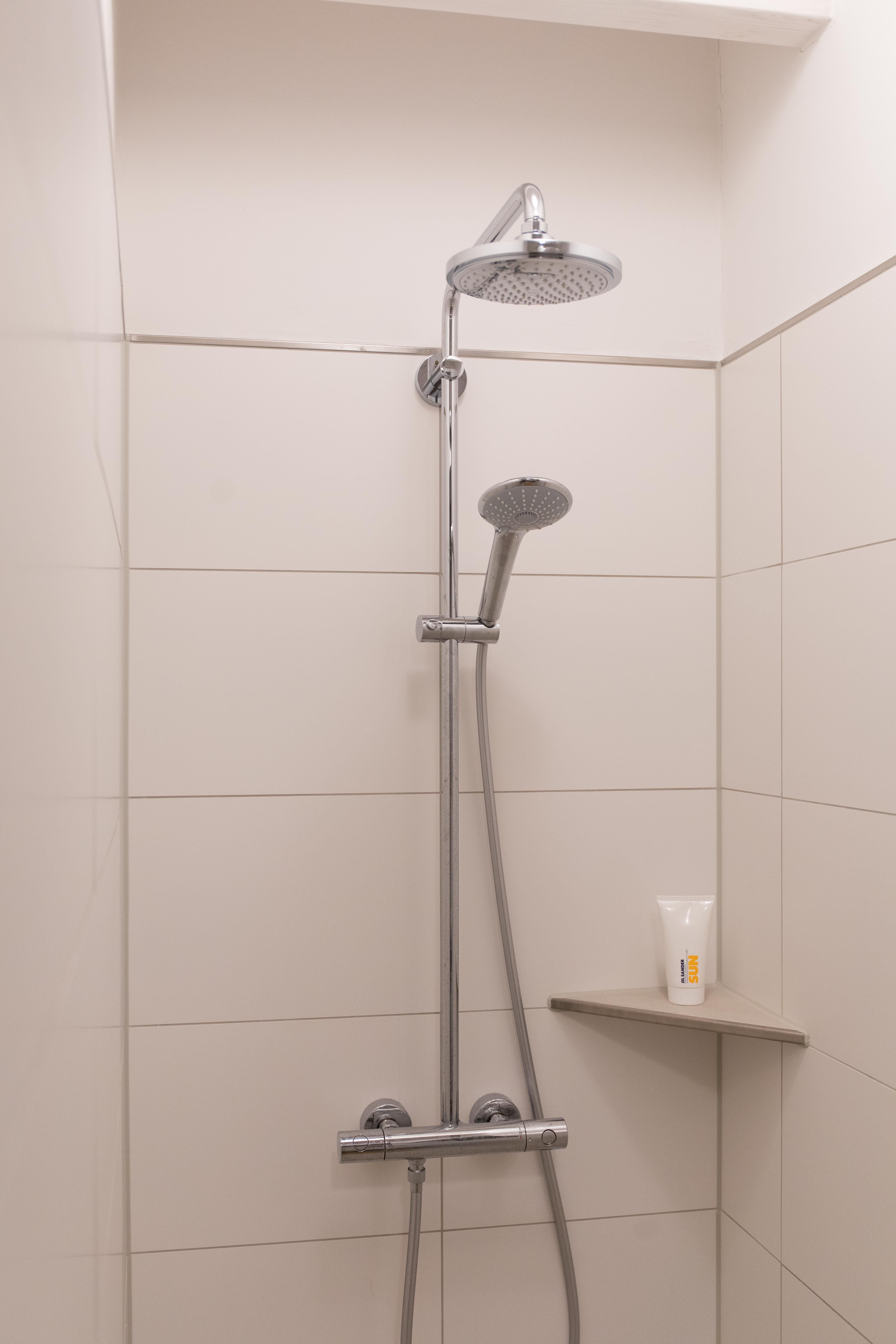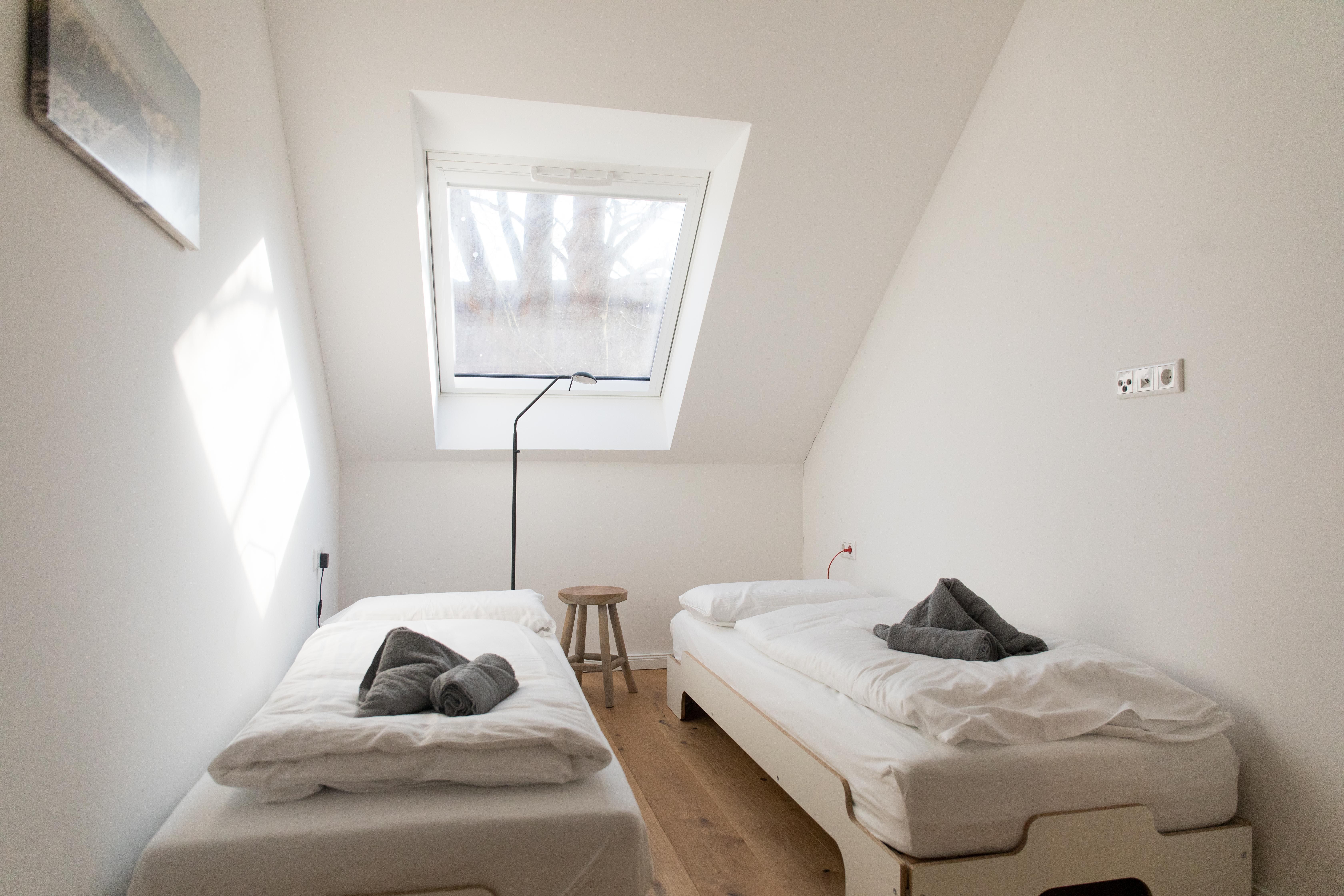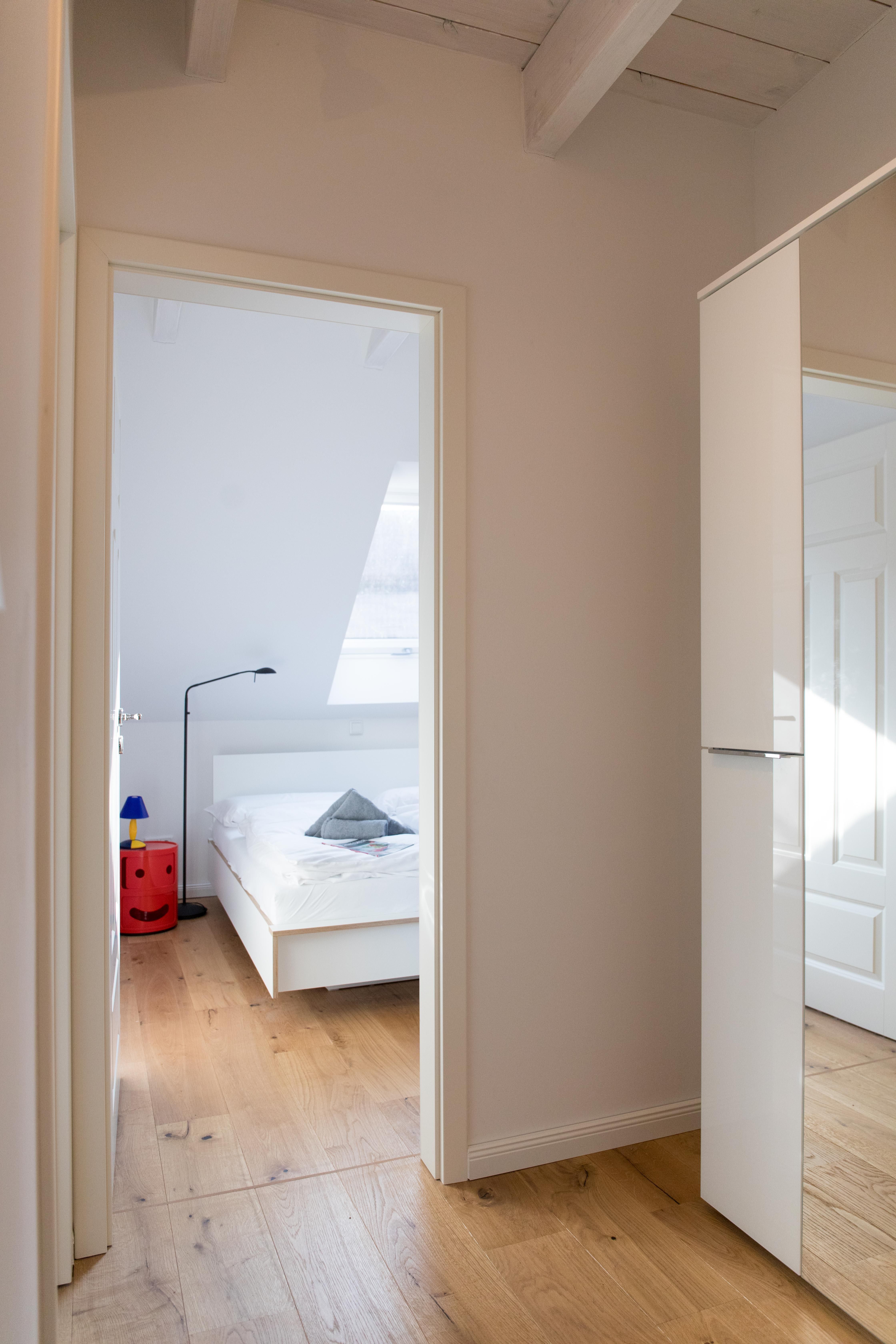 Im Dachgeschoss befinden sich 2 Schlafzimmer mit 1 Doppelbett und 2 Einzelbetten, 1 Kleiderständer und 1 Kleiderschrank im Flur. In beiden Schlafzimmern können die Fenster verdunkelt werden, Insektenschutzrollos bewahrt Sie vor lästigen Besuchern. Ein Kinderschutzgitter zur Treppe schützt Ihre Kleinen. Das Bad verfügt über eine bodengleiche Dusche, Haartrockner und Kosmetikspiegel.
