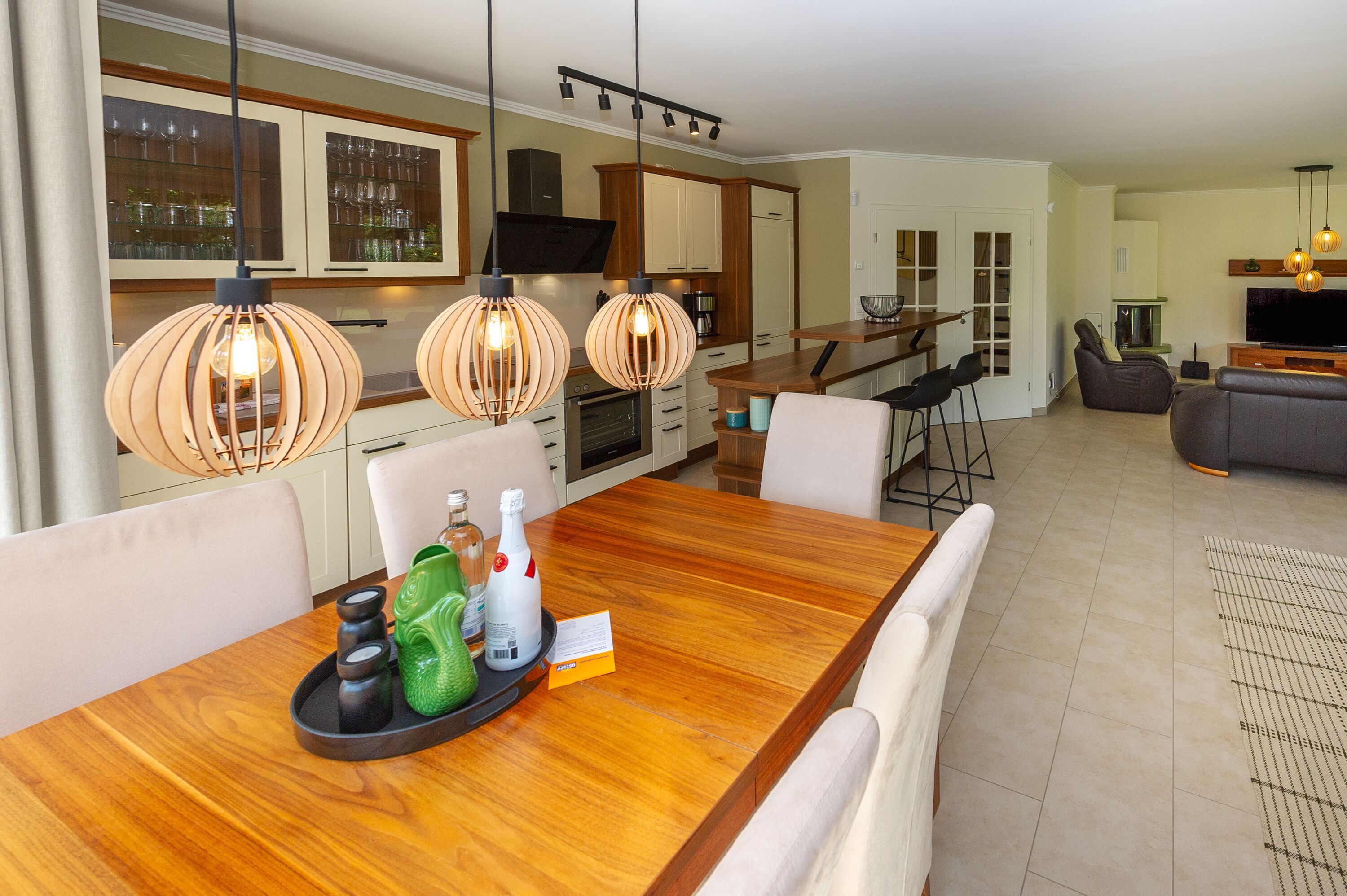 Im Erdgeschoss finden Sie Ihren großzügigen und angenehm lichtdurchfluteten Wohnbereich mit Kaminofen, die voll ausgestattete Ku?che mit Esstisch und Tresen, ein Badezimmer mit WC und ebenerdiger Dusche sowie den Hauswirtschaftsraum mit Waschmaschine.