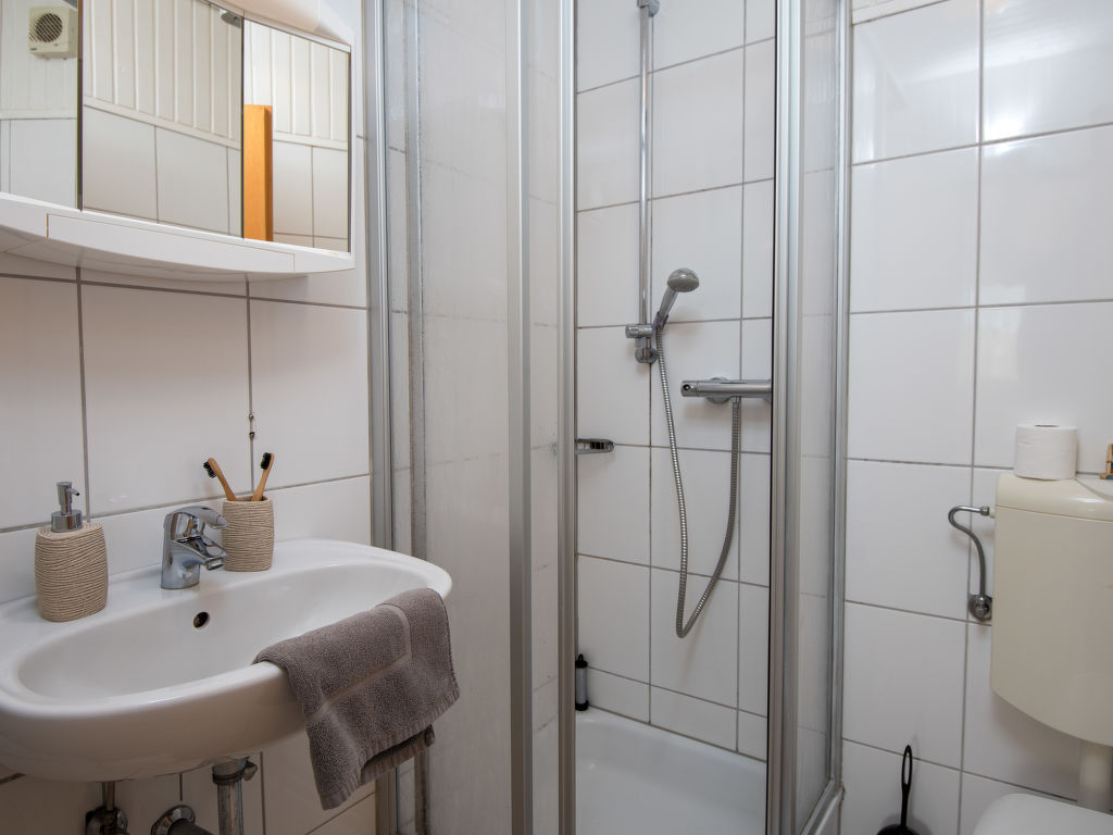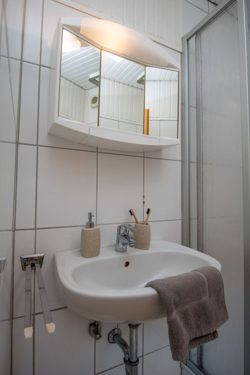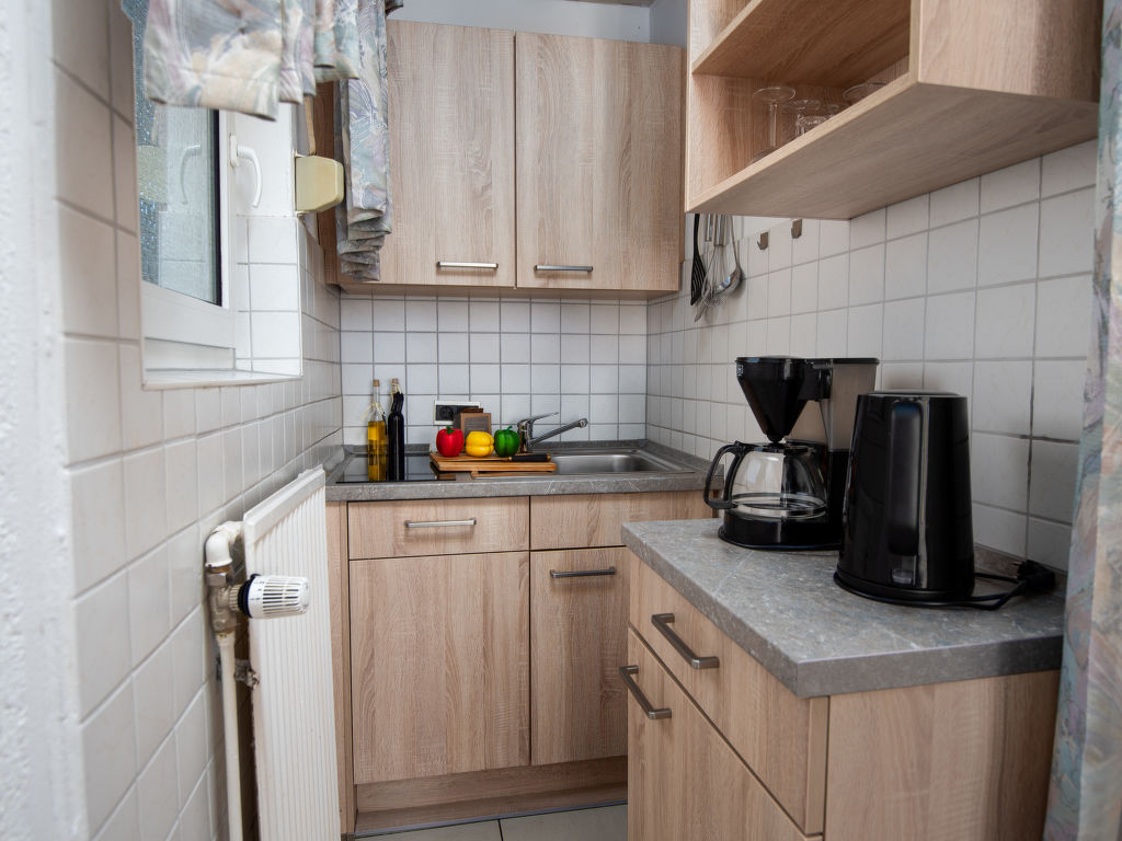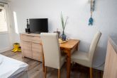 Schwalbennest V, 1-Zimmer-Wohnung 15 m2, im Erdgeschoss. Sehr einfach eingerichtet: Wohn-/Schlafzimmer 10 m2 mit 1 Diwanbett (120 cm, Länge 190 cm), Digital-TV und Radio. Kleine Kochnische 2 m2 (2 Kochplatten, Geschirrspüler, Toaster, Wasserkocher, Mikrowelle, elektrische Kaffeemaschine). Dusche/WC. Sitzplatz. Zur Verfügung: Kinderhochstuhl (extra). Parkplatz in 20 m. Bitte beachten: Kühlschrank ohne Gefrierfach, Nichtraucher-Unterkunft. Maximal 1 kleines Haustier/Hund erlaubt. Rauchmelder. Bei dem Diwanbett handelt es sich um eine Schlafcouch im Wohnzimmer. Ein Schlafzimmer ist nicht vorhanden. Diese sehr kleine Wohnung ist für ältere und gehbehinderte Personen nicht geeignet.