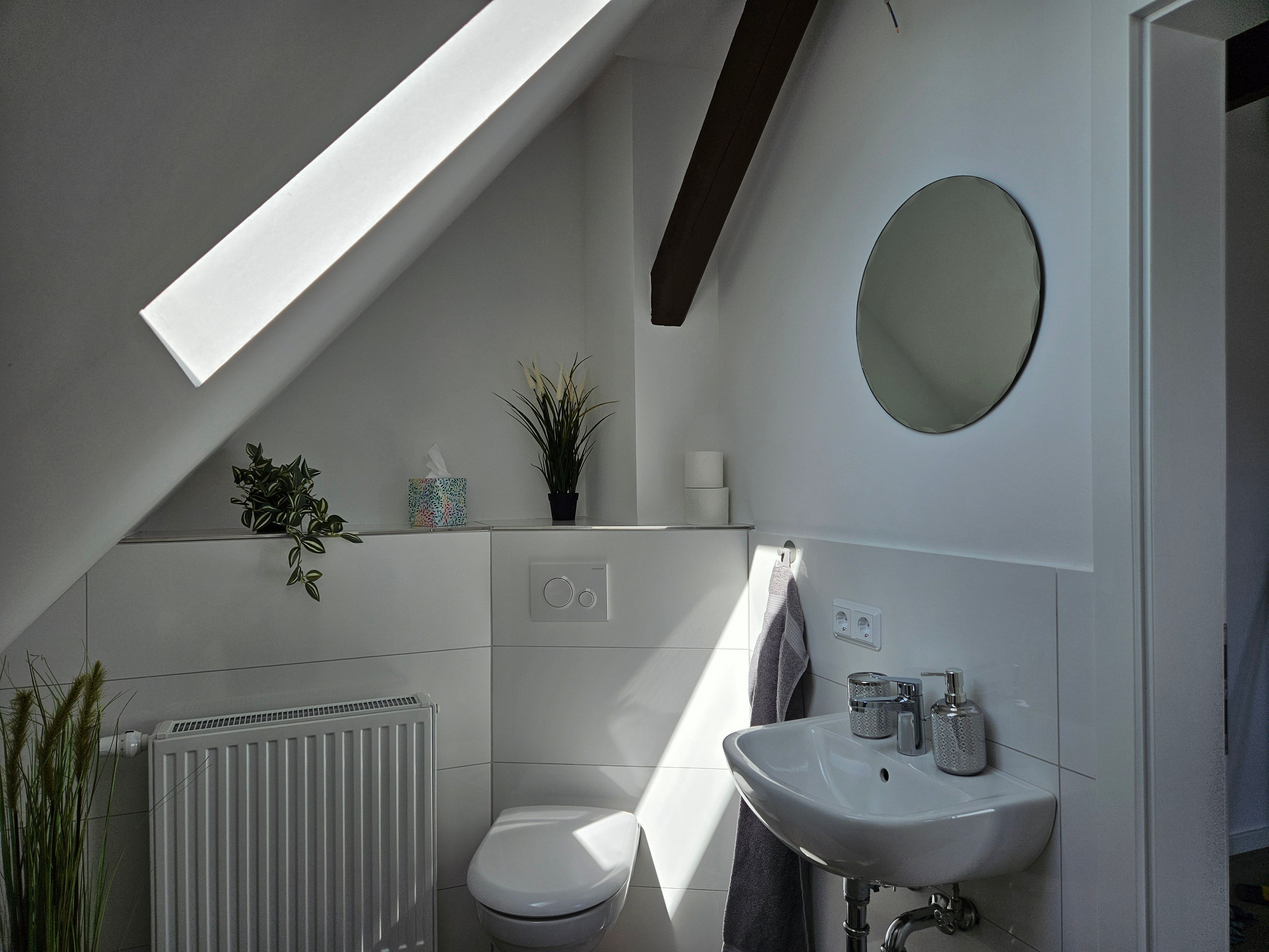 Das Dach ist sehr gut gedämmt, die 3-fach-verglasten, schallgeschützten Fenster sind mit Thermoplissees ausgestattet. Der Deckenventilator sorgt für angenehmes Raumklima.