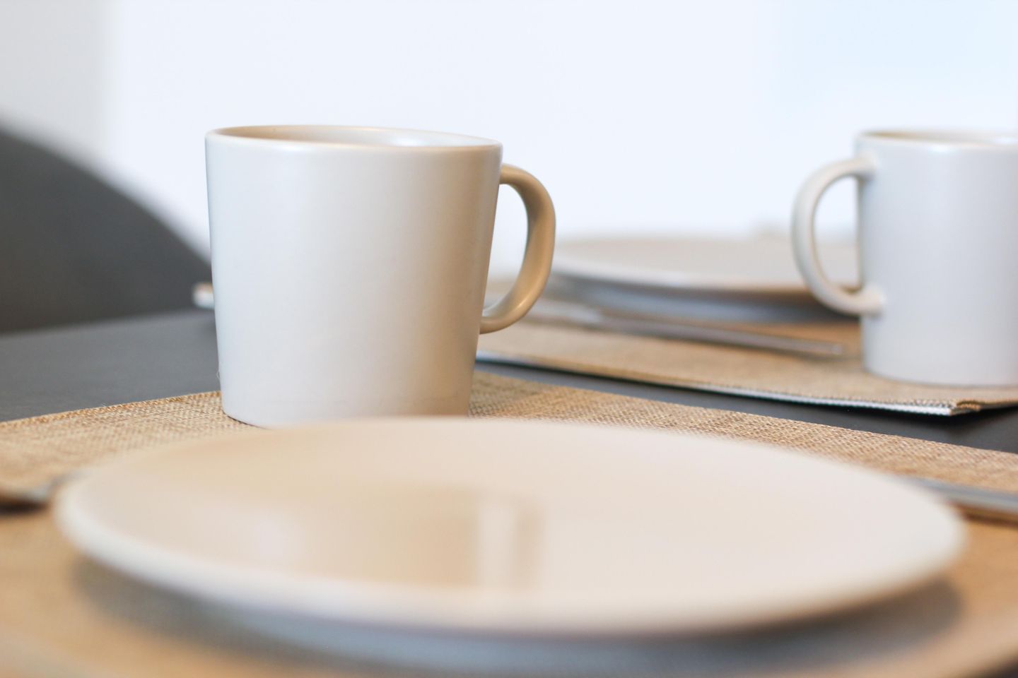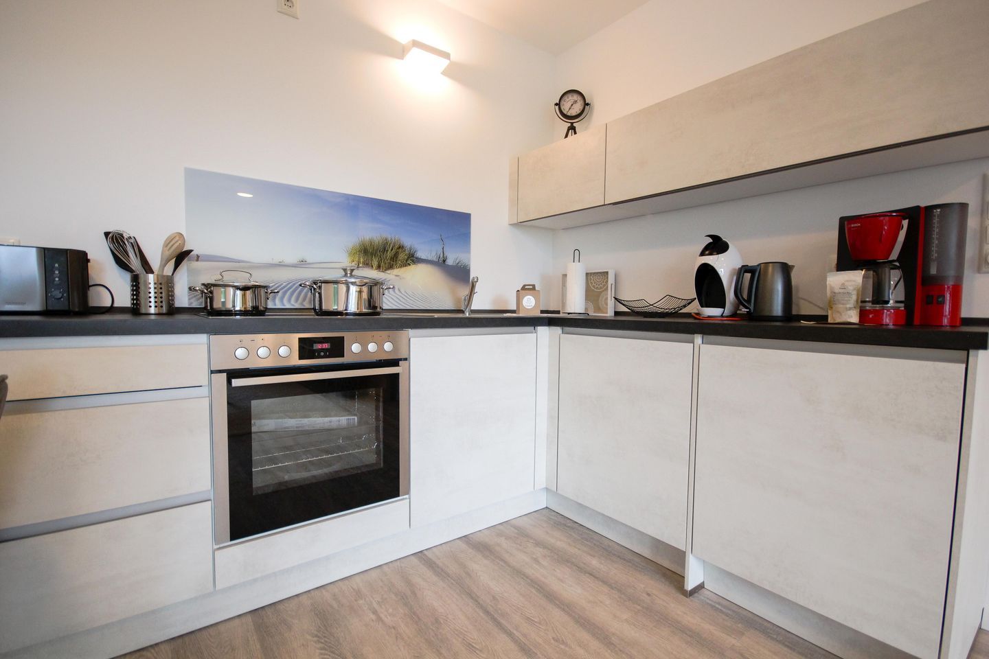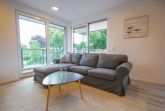 Der offene Wohn-Essbereich lädt zum Verweilen ein: Eine voll ausgestattete Küchenzeile lässt keine Wünsche offen, der Esstisch bietet Platz für 3 Personen und die Sofaecke verspricht entspannte Abende. Plissees an den Fenstern sorgen für angenehmen Sicht- und Sonnenschutz und unterstreichen das moderne Wohnambiente.