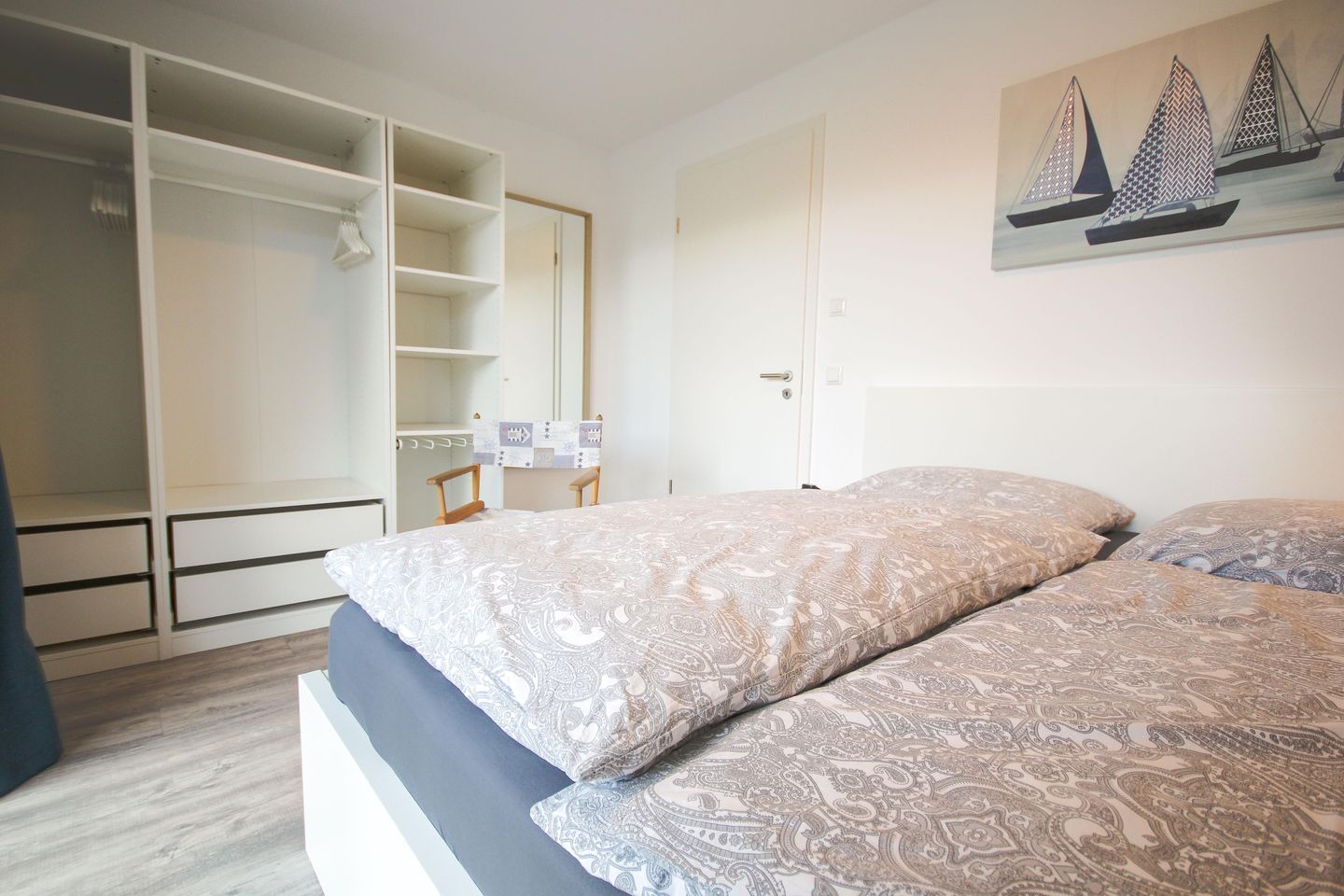 Bereits beim Eintreten empfängt Sie ein kleiner Flur mit Garderobe und Schuhschrank. Auf der linken Seite befindet sich das gemütliche Schlafzimmer mit einem komfortablen Doppelbett, Vorhängen zur Verdunkelung und einem offenen Kleiderschrank. Das zweite Schlafzimmer bietet ein Einzelbett, ein kleines Sofa sowie ebenfalls einen offenen Kleiderschrank – perfekt für Kinder, Freunde oder als Rückzugsort.