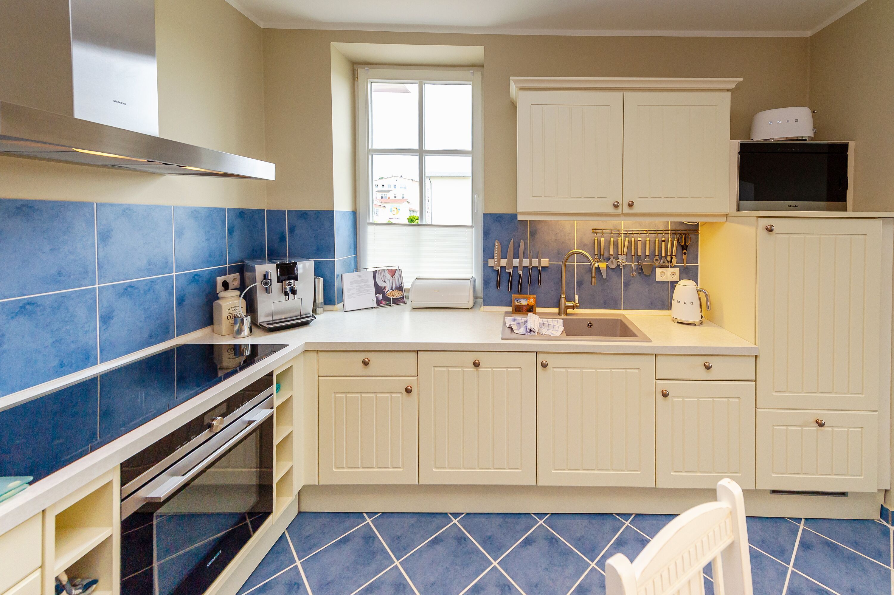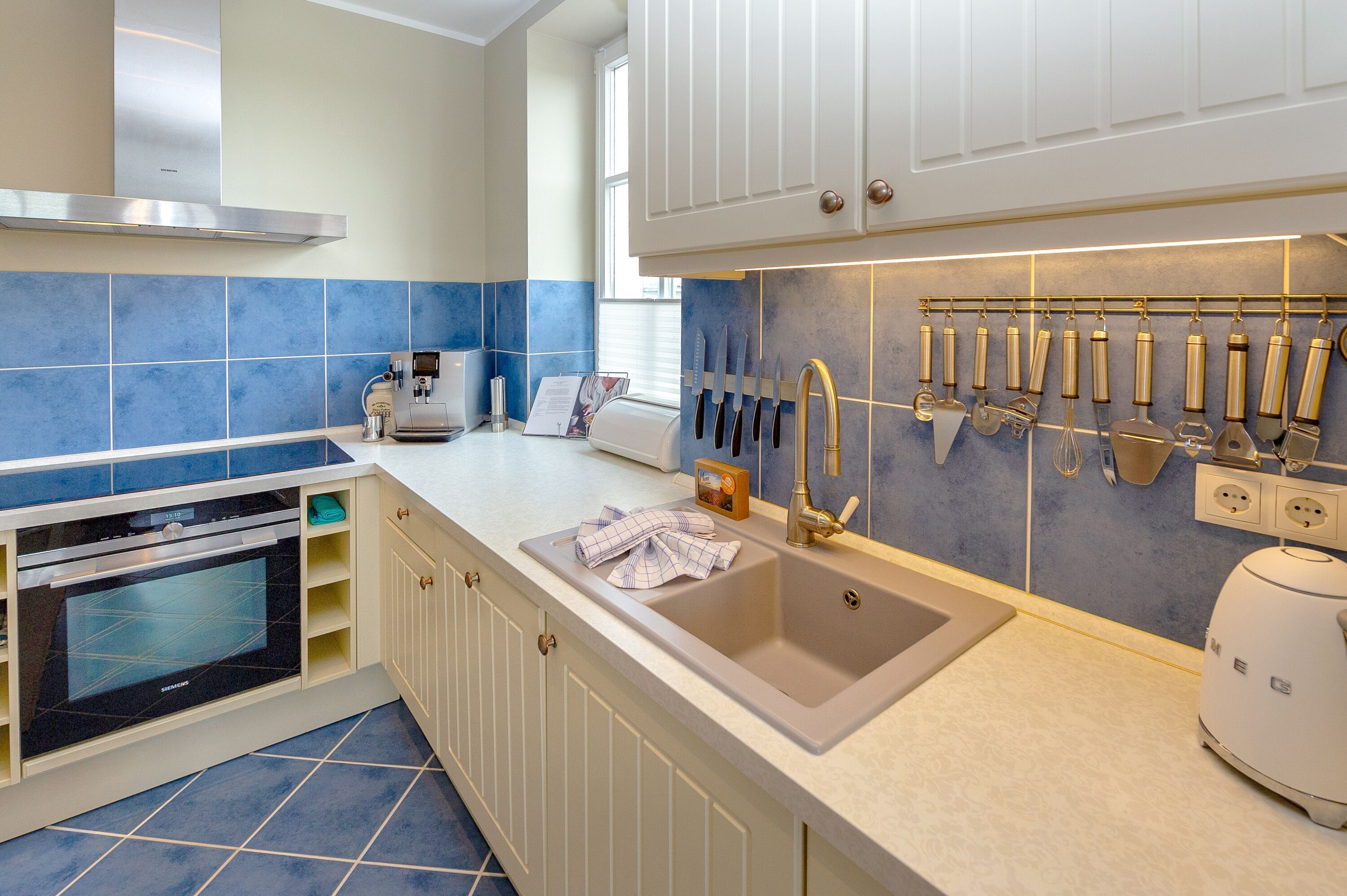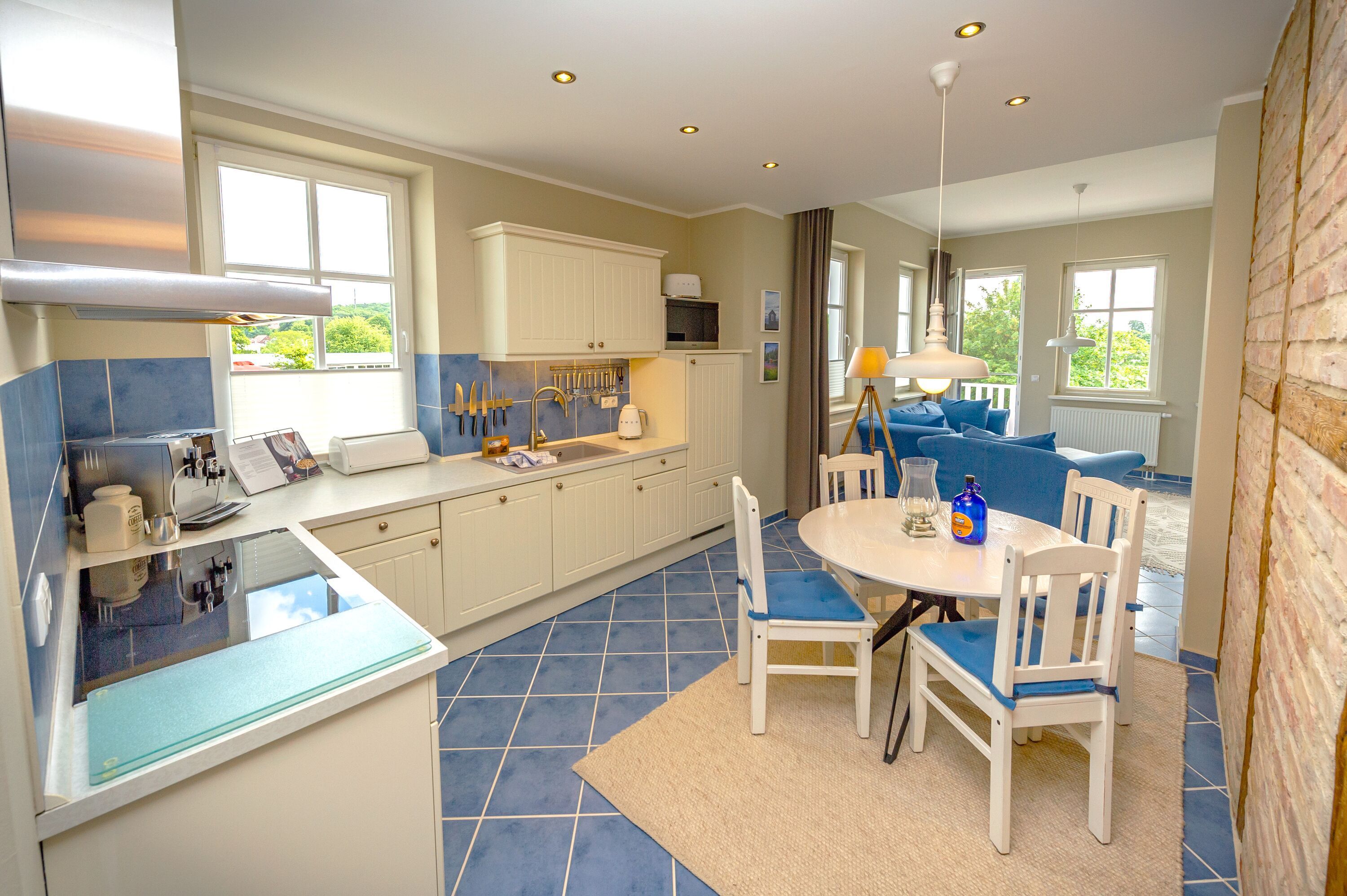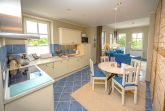 In der offenen Landhausküche finden Sie einen Kühlschrank mit Gefrierfach, einen Herd mit Backofen, eine Spülmaschine, sowie Toaster, Mixer, einen Eierkocher und diverses Kleininventar, das die Küchenausstattung komplettiert sowie einen JURA-Kaffeeautomat (inkl. Kaffee satt).