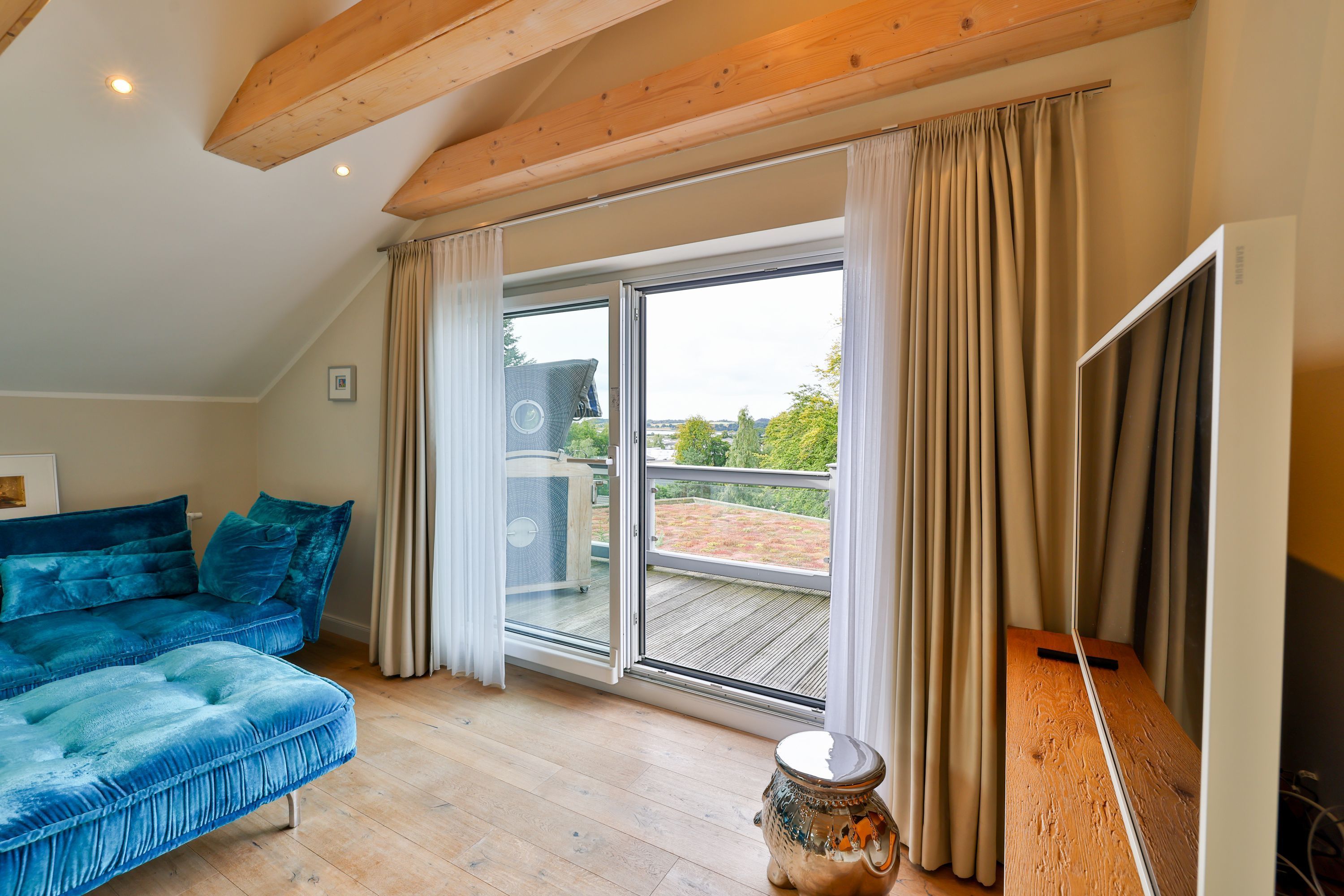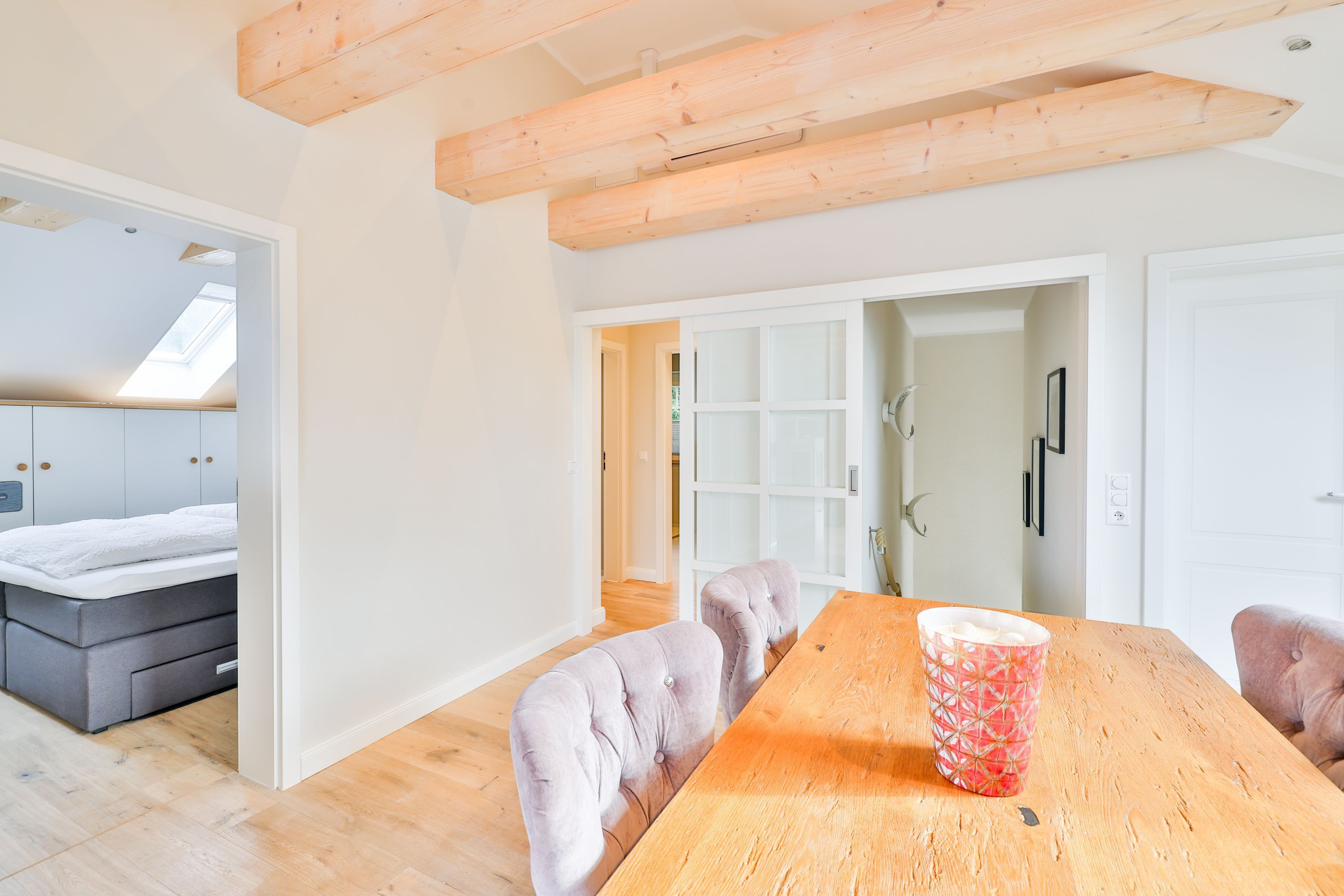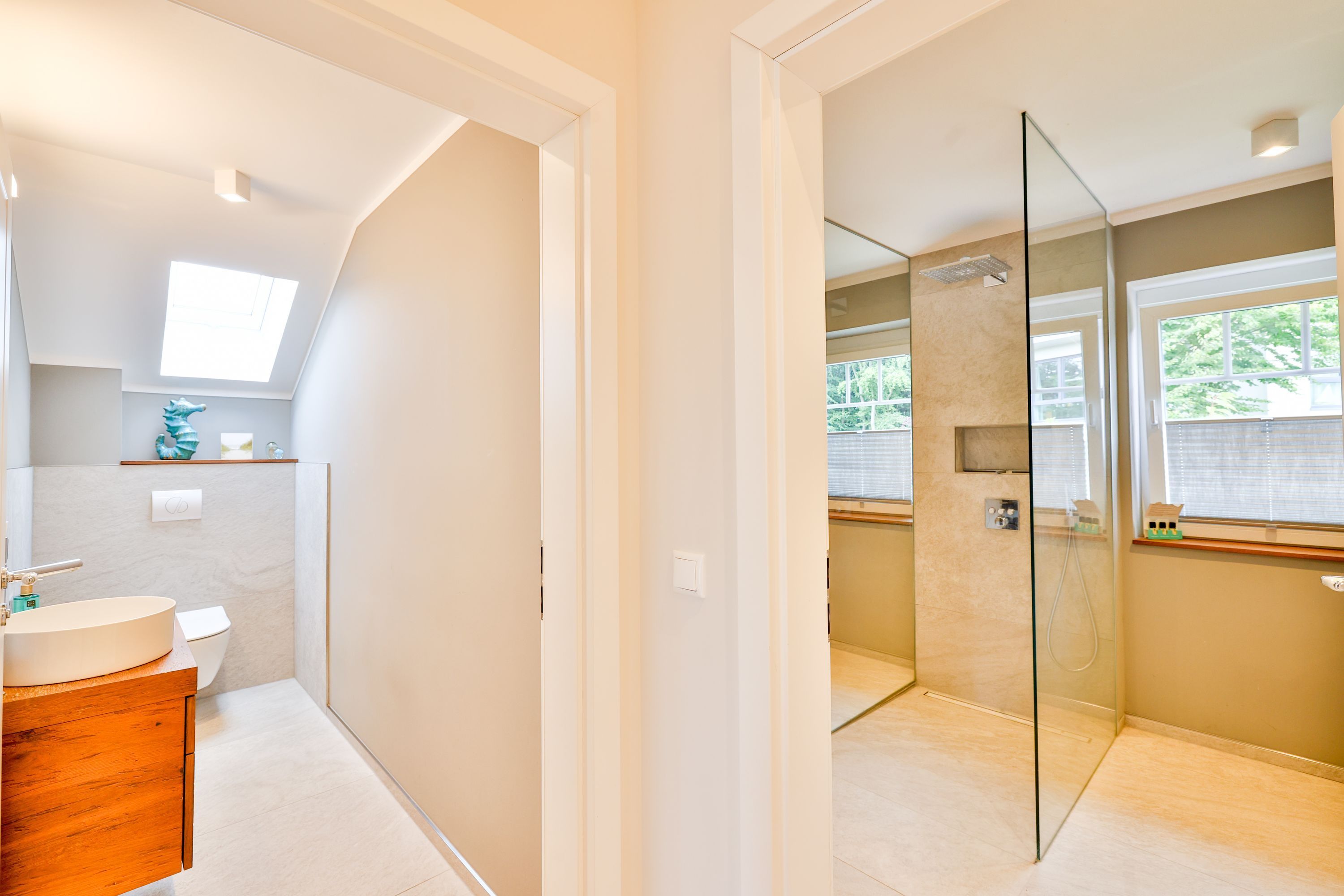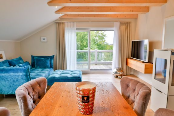 Die Ferienwohnung liegt im Obergeschoss. Sie erreichen die Urlaubsunterkunft durch einen separaten Eingang mit Treppenhaus. Der offene Wohn- und Essbereich, die 2 Schlafzimmer und der Hauswirtschaftsraum sind mit Parkettboden ausgestattet. Die Schlafzimmer verfügen über ein Boxspringbett. Eines der Schlafzimmer hat einen direkten Zugang zum Balkon. Das exklusive Badezimmer ist mit einer Sauna, einer offenen Dusche, einem Doppelwaschtisch und Fliesen in Großformat ausgestattet. Das WC mit einem zusätzlichen Waschtisch befindet sich in einem separaten Raum. Der Wohn- und Essbereich verfügt über eine vollausgestattete Küchenzeile, offener Balkenlage, einem Kaminofen, Essbereich und gemütlichem Sofa der Marke Bretz. Vom Wohnbereich gelangen Sie auf den Balkon mit Panoramablick über den Dächern des Ostseebad Sellin. Im Hauswirtschaftsraum befindet sich eine Waschmaschine und ein Trockner. Die Ferienwohnung verfügt über 2 PKW Stellplätze (im Preis inkl.).