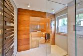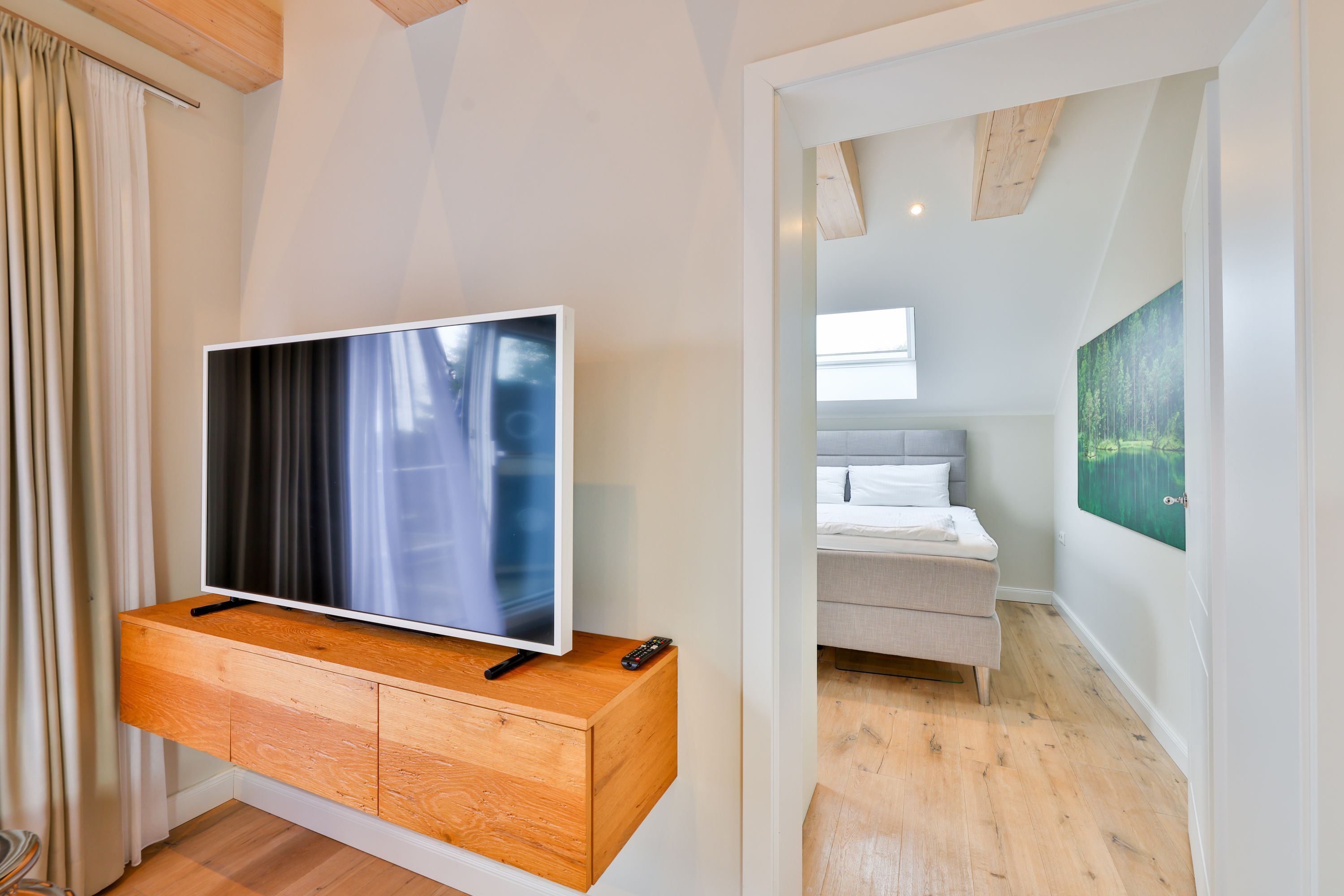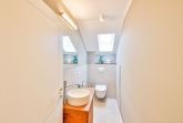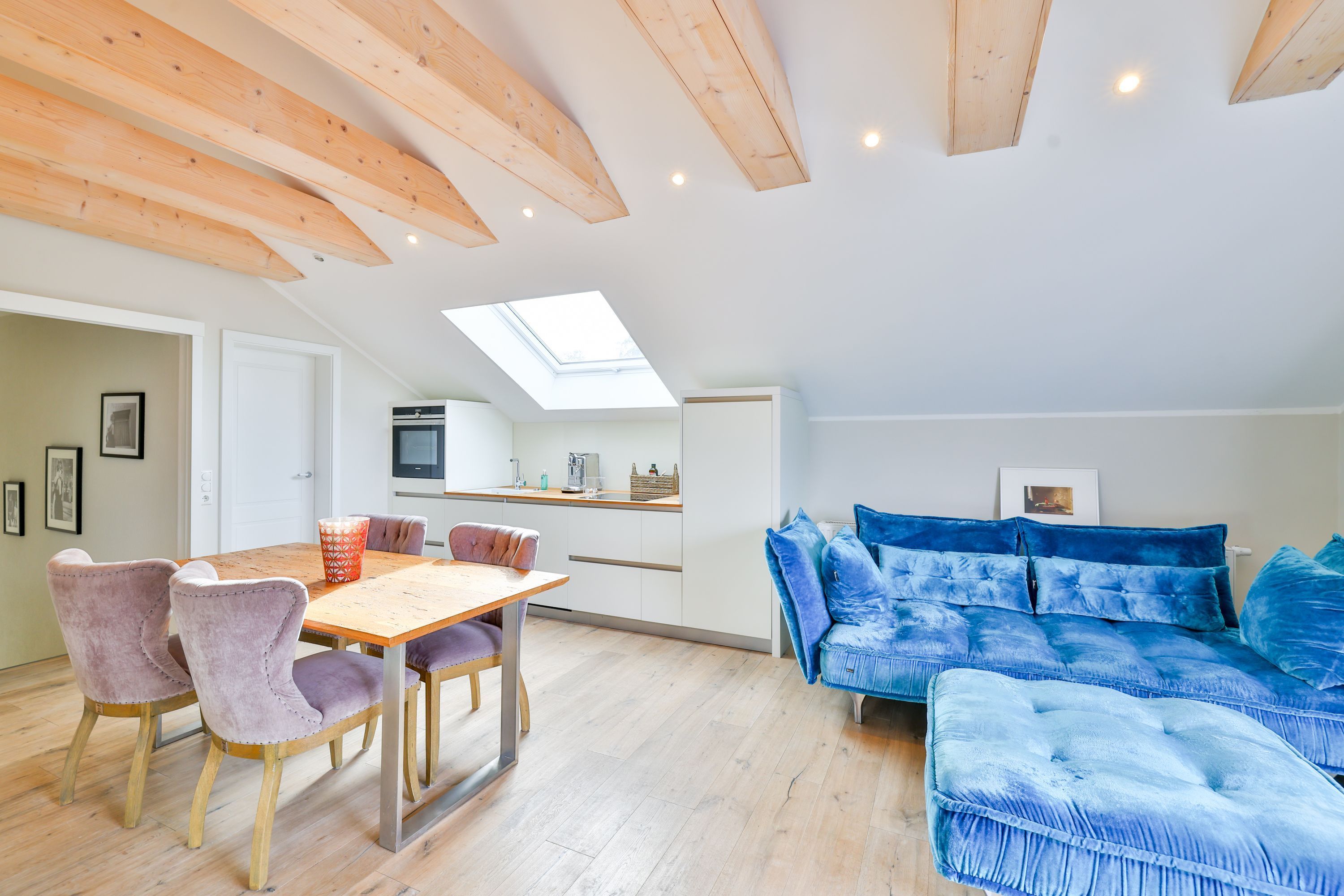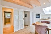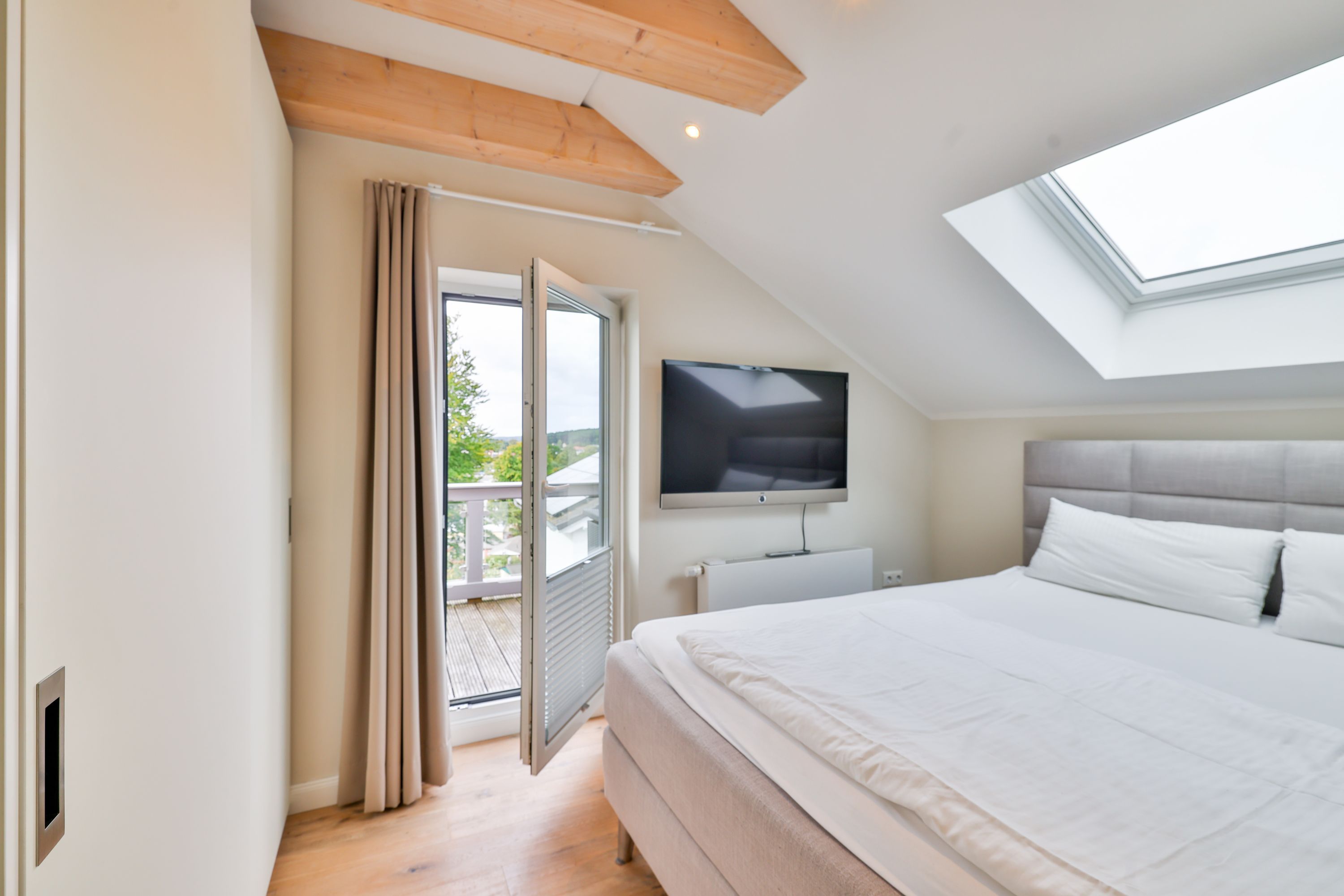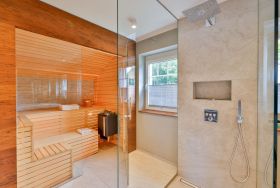 Die Ferienwohnung liegt im Obergeschoss. Sie erreichen die Urlaubsunterkunft durch einen separaten Eingang mit Treppenhaus. Der offene Wohn- und Essbereich, die 2 Schlafzimmer und der Hauswirtschaftsraum sind mit Parkettboden ausgestattet. Die Schlafzimmer verfügen über ein Boxspringbett. Eines der Schlafzimmer hat einen direkten Zugang zum Balkon. Das exklusive Badezimmer ist mit einer Sauna, einer offenen Dusche, einem Doppelwaschtisch und Fliesen in Großformat ausgestattet. Das WC mit einem zusätzlichen Waschtisch befindet sich in einem separaten Raum. Der Wohn- und Essbereich verfügt über eine vollausgestattete Küchenzeile, offener Balkenlage, einem Kaminofen, Essbereich und gemütlichem Sofa der Marke Bretz. Vom Wohnbereich gelangen Sie auf den Balkon mit Panoramablick über den Dächern des Ostseebad Sellin. Im Hauswirtschaftsraum befindet sich eine Waschmaschine und ein Trockner. Die Ferienwohnung verfügt über 2 PKW Stellplätze (im Preis inkl.).