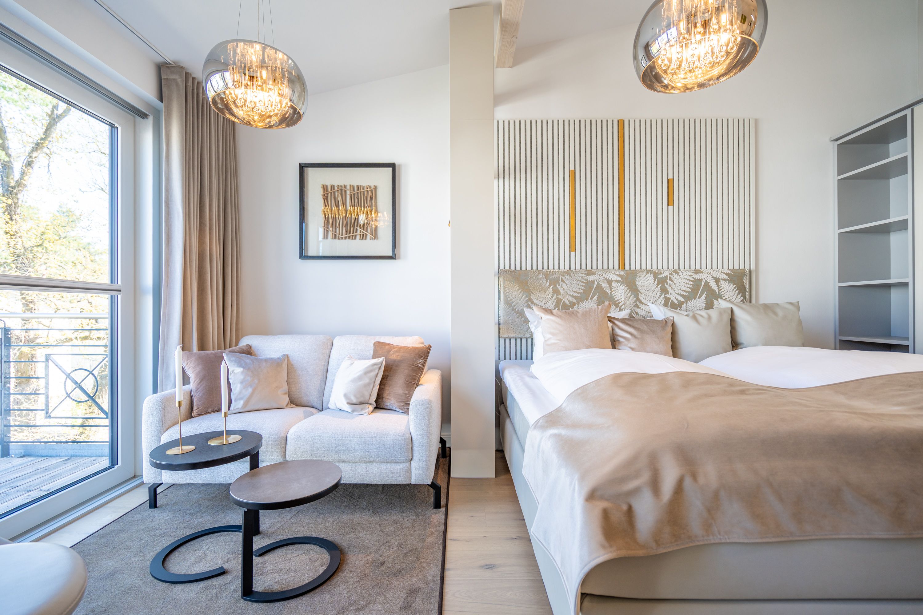 In diesem charmanten 1-Raum-Appartement im Dachgeschoss erwartet Sie auf rund 36?m² ein stilvoll gestalteter Rückzugsort für zwei Personen – ideal für eine Auszeit zu zweit. Der offene Wohn- und Schlafbereich überzeugt mit einer gemütlichen Sitzgruppe, einem komfortablen Boxspringbett (1,80?m x 2,00?m), einem geräumigen Kleiderschrank sowie einem Elektro-Kamin mit Fernbedienung, der stimmungsvolle Wohlfühlmomente garantiert. Für Ihre Unterhaltung sorgt ein Flat-TV mit integriertem Radio. Die moderne Küchenzeile ist voll ausgestattet – mit Backofen, Spülmaschine und Kühlschrank mit Gefrierfach – und bietet alles für genussvolle Kochmomente. Der Essplatz für zwei Personen lädt zum gemeinsamen Frühstück oder Dinner ein. Vom Wohnbereich gelangen Sie direkt auf den überdachten Nord-Ost-Balkon (ca. 5,8?m²), wo Gartenmöbel zum entspannten Verweilen im Freien einladen. Ein echtes Highlight ist das innenliegende Badezimmer mit Dusche, WC, Waschtisch und eigener Finnischer Sauna – für private Wellnessstunden zu jeder Jahreszeit. Zur weiteren Ausstattung gehören kostenfreies WLAN, ein PKW-Stellplatz in der Tiefgarage sowie ein eigener Abstellraum für Fahrräder – perfekt für aktive Urlaubstage in der Umgebung.